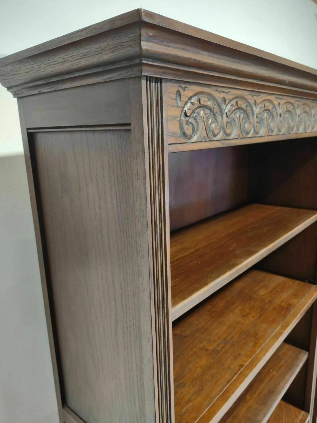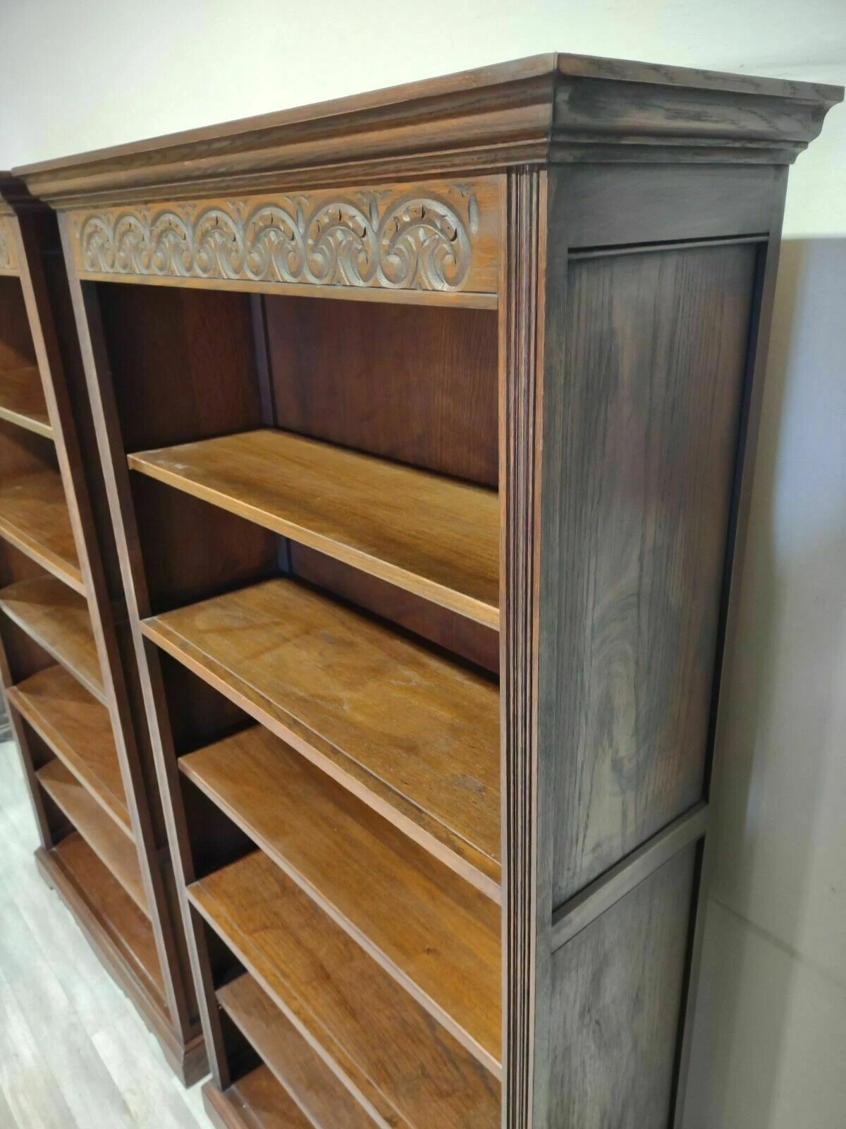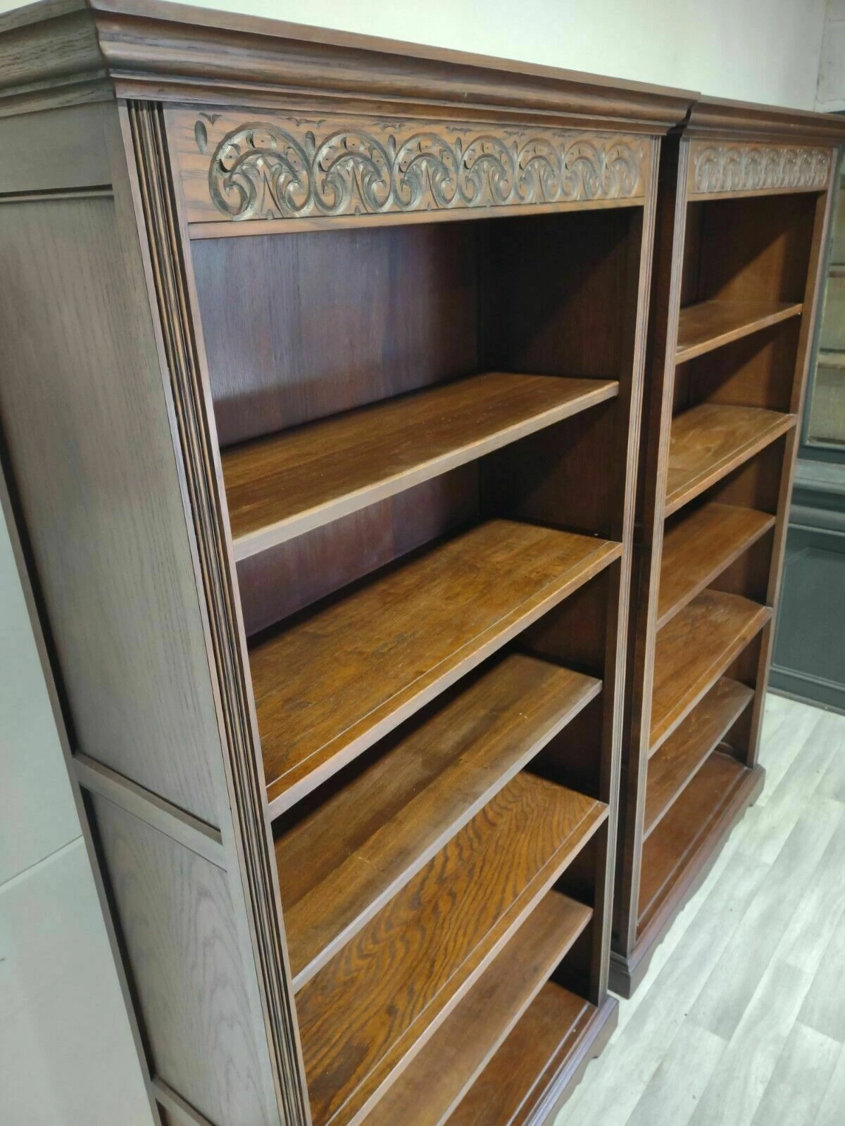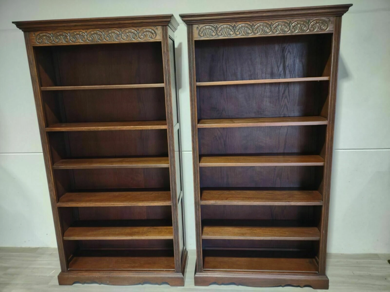 Pair of Old Charm oak bookcases by Wood Bros Furniture, Uk made. Each bookcase has 2 fixed and 3 adjustable shelves.