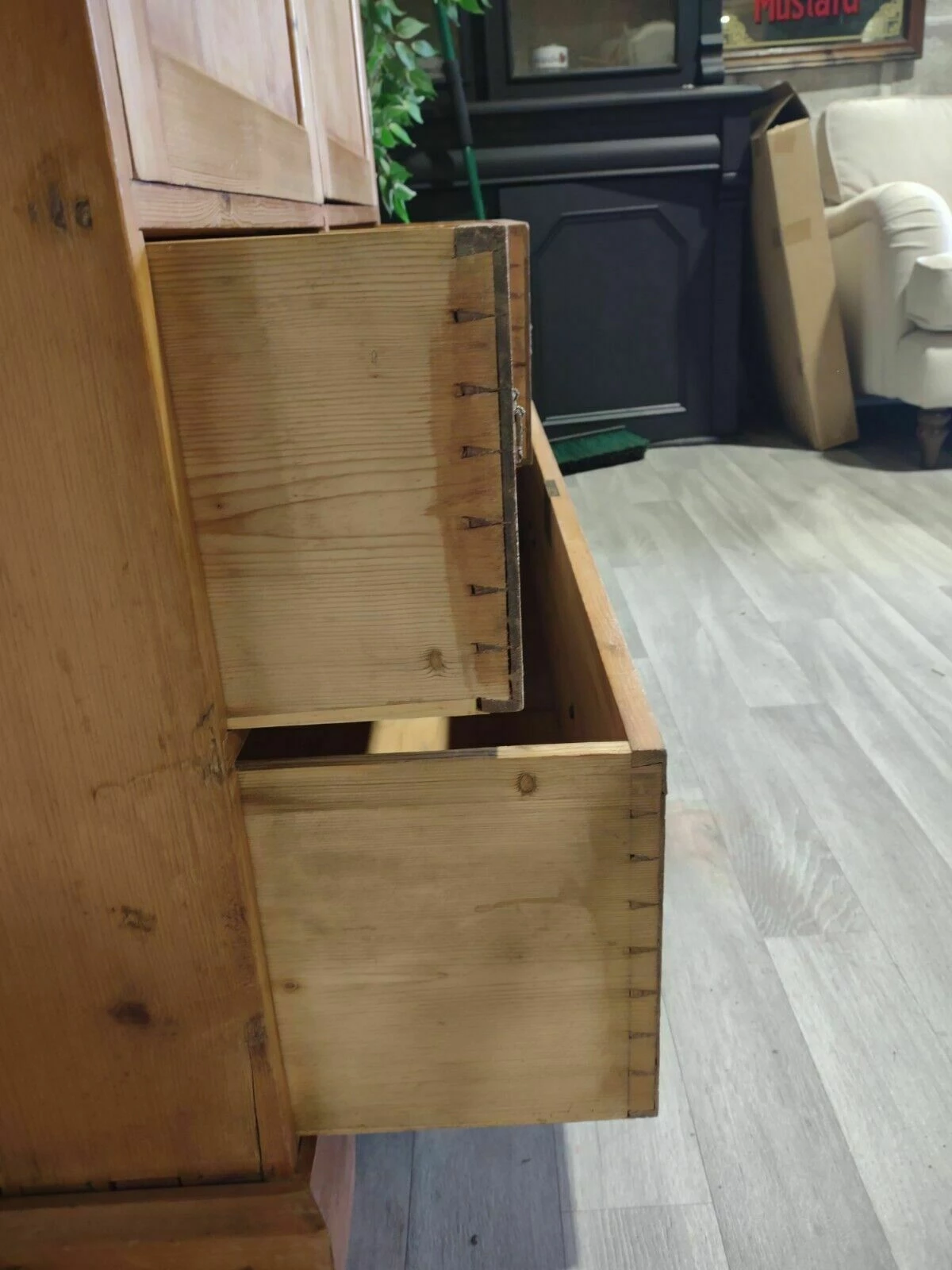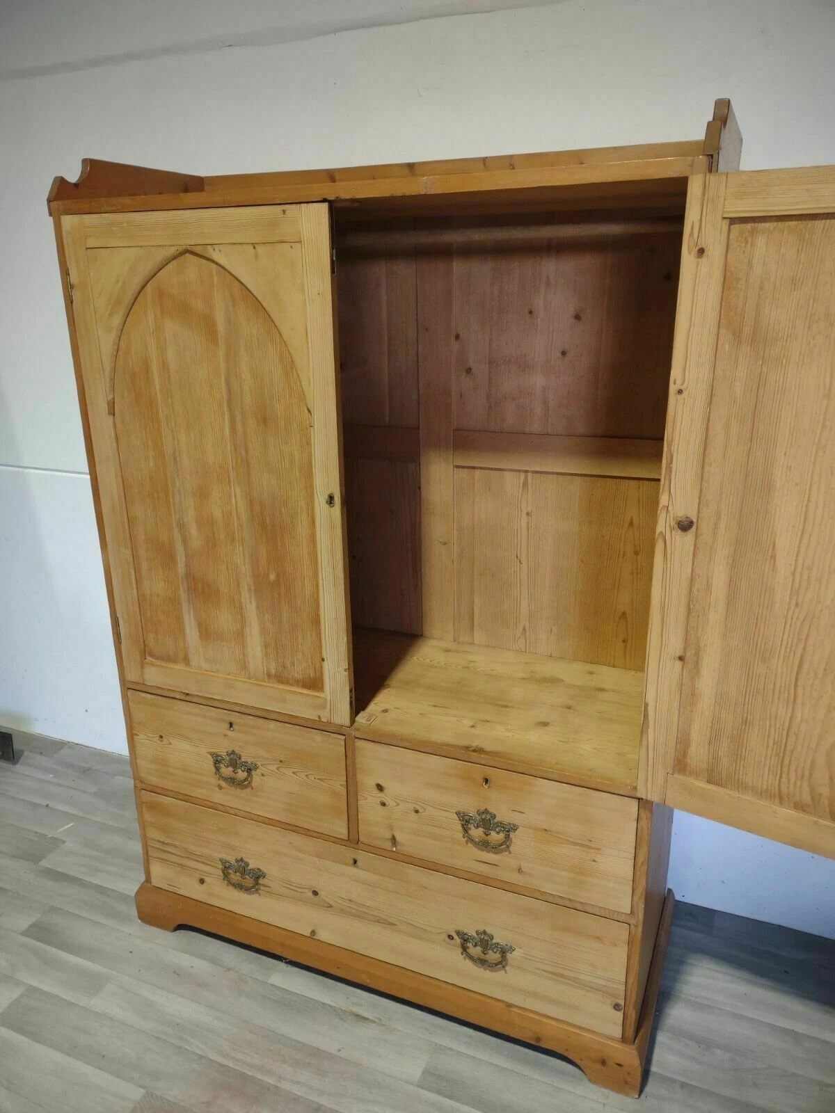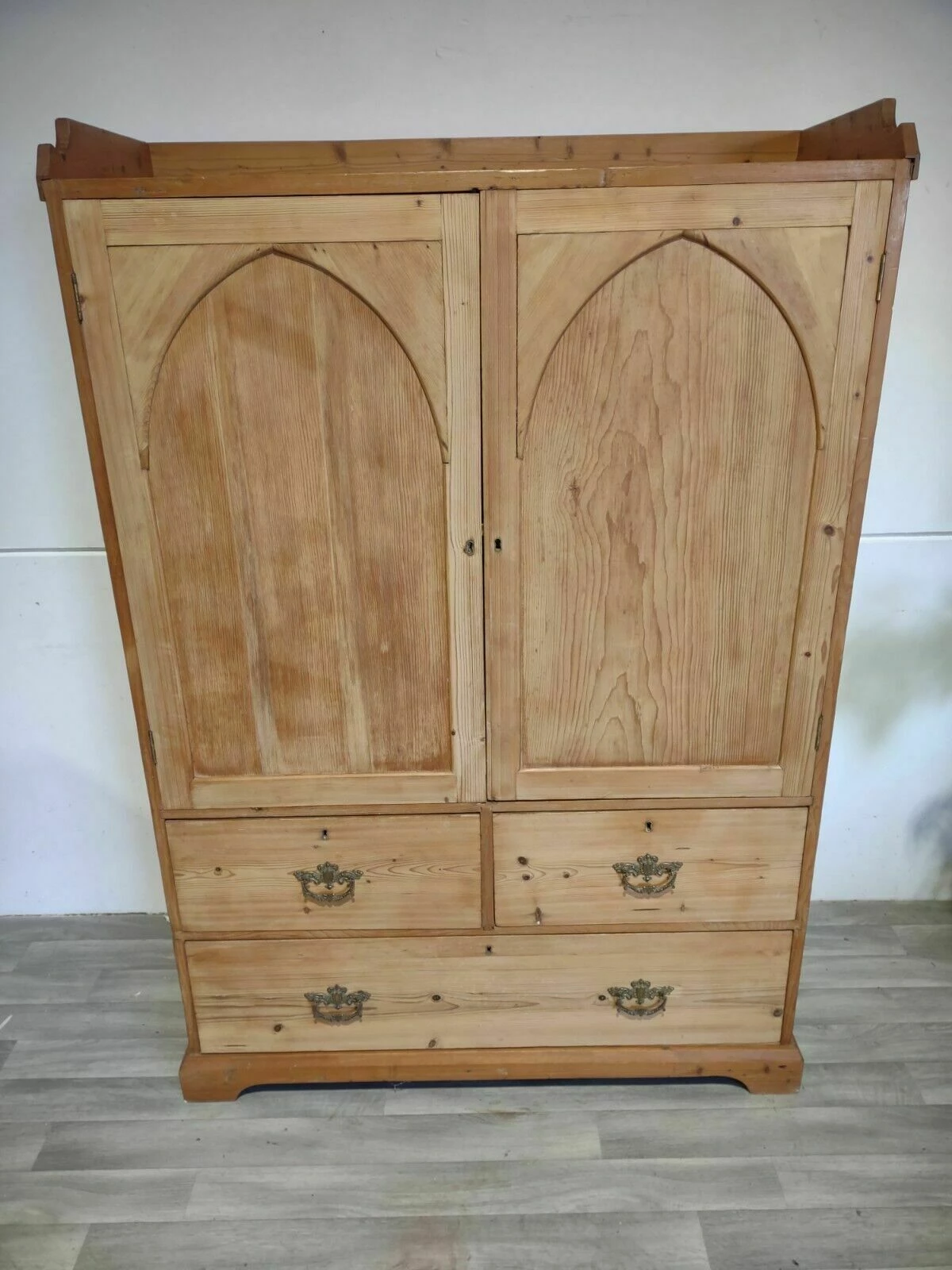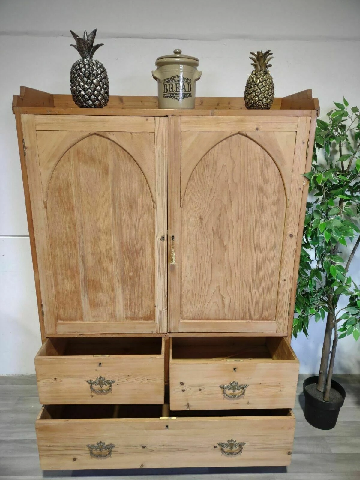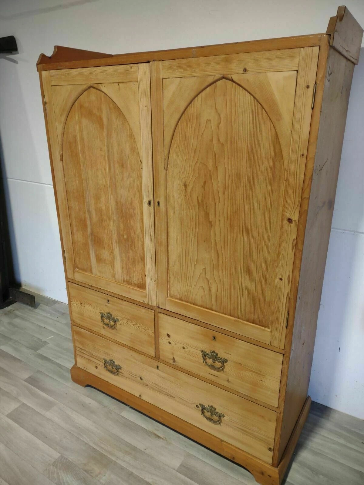 Early 20th century Pine Hall Cupboard galleried top arched panel doors above 2 short and 1 long drawer. Comes with key nice handles.