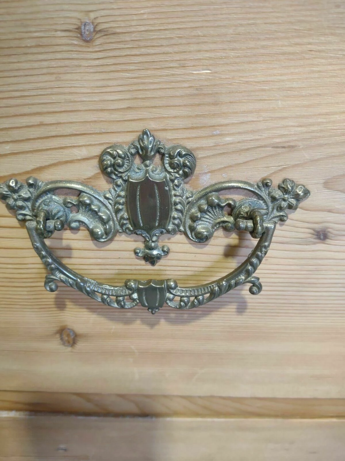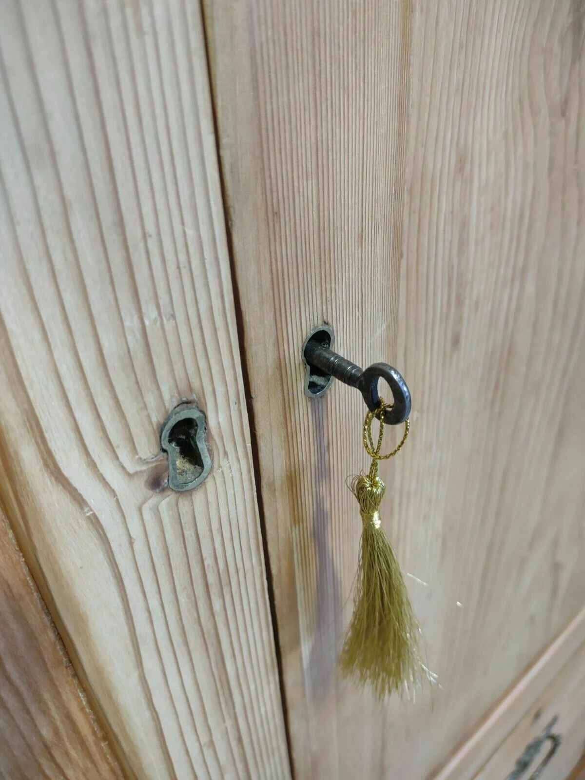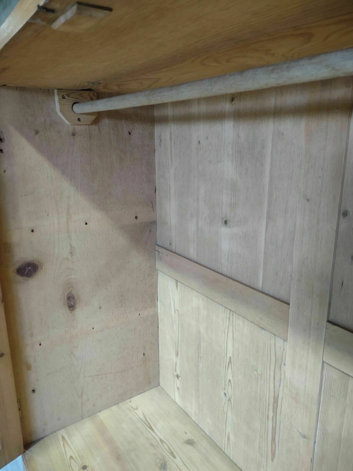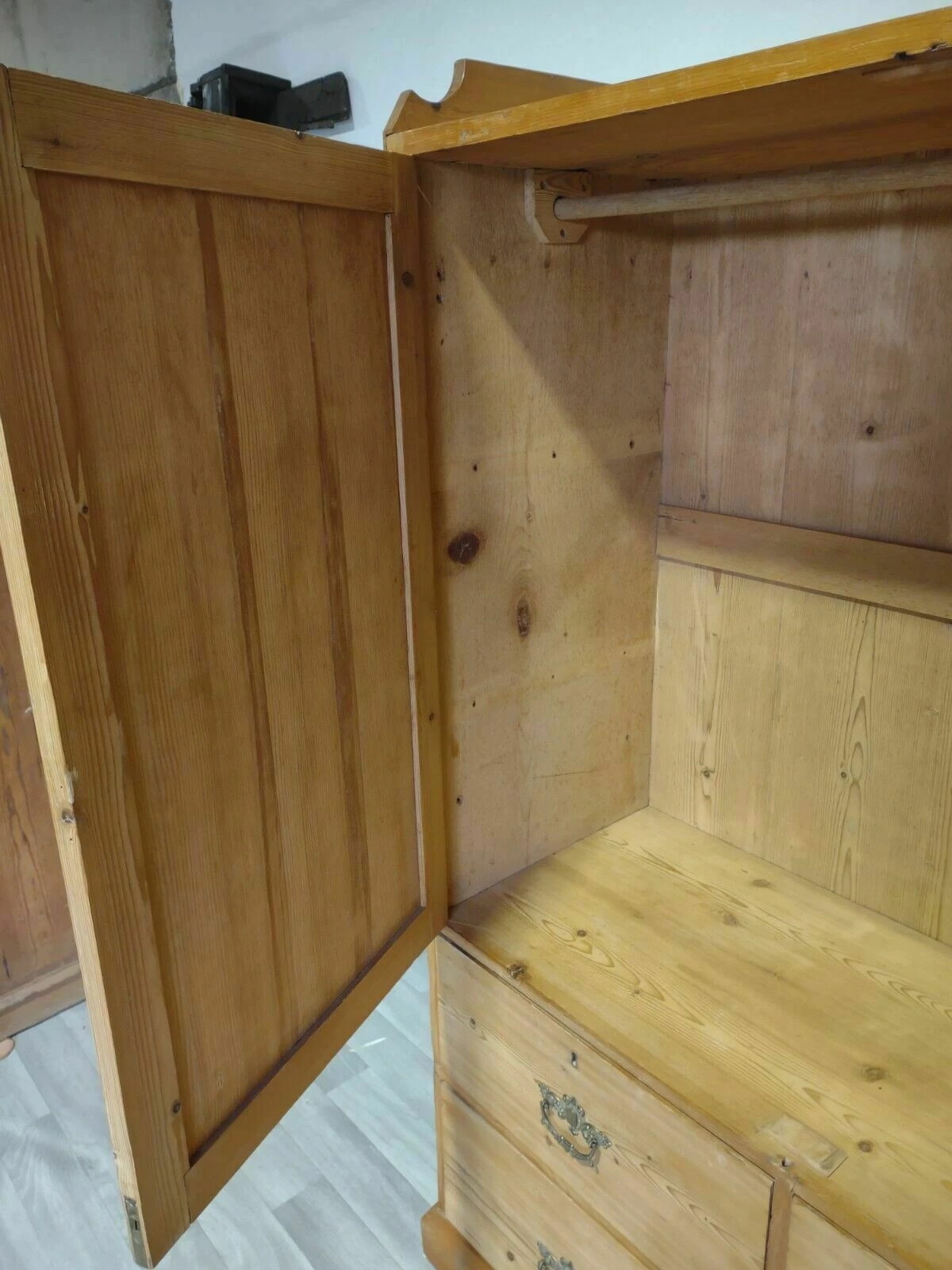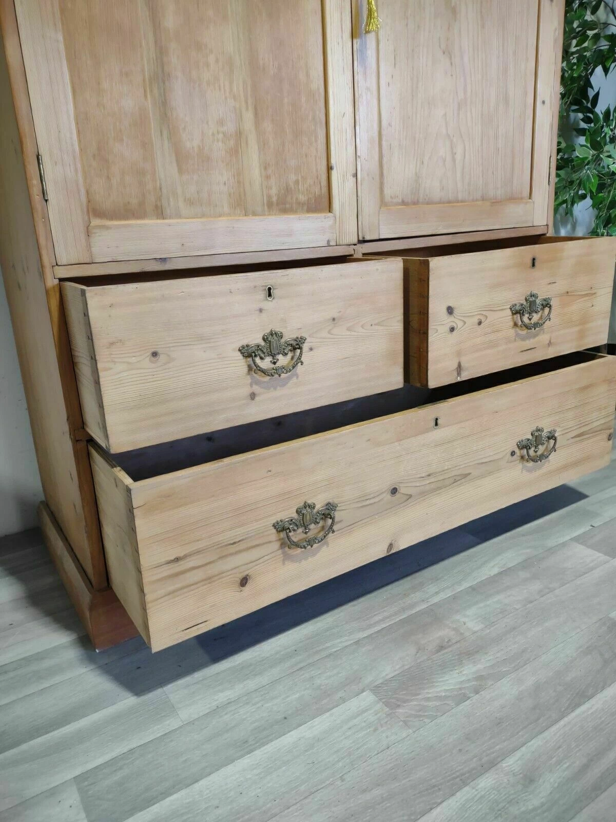 Early 20th century Pine Hall Cupboard galleried top arched panel doors above 2 short and 1 long drawer. Comes with key nice handles.