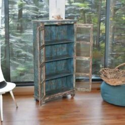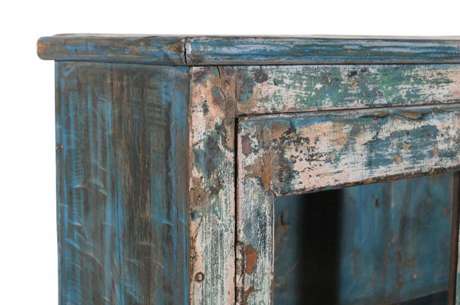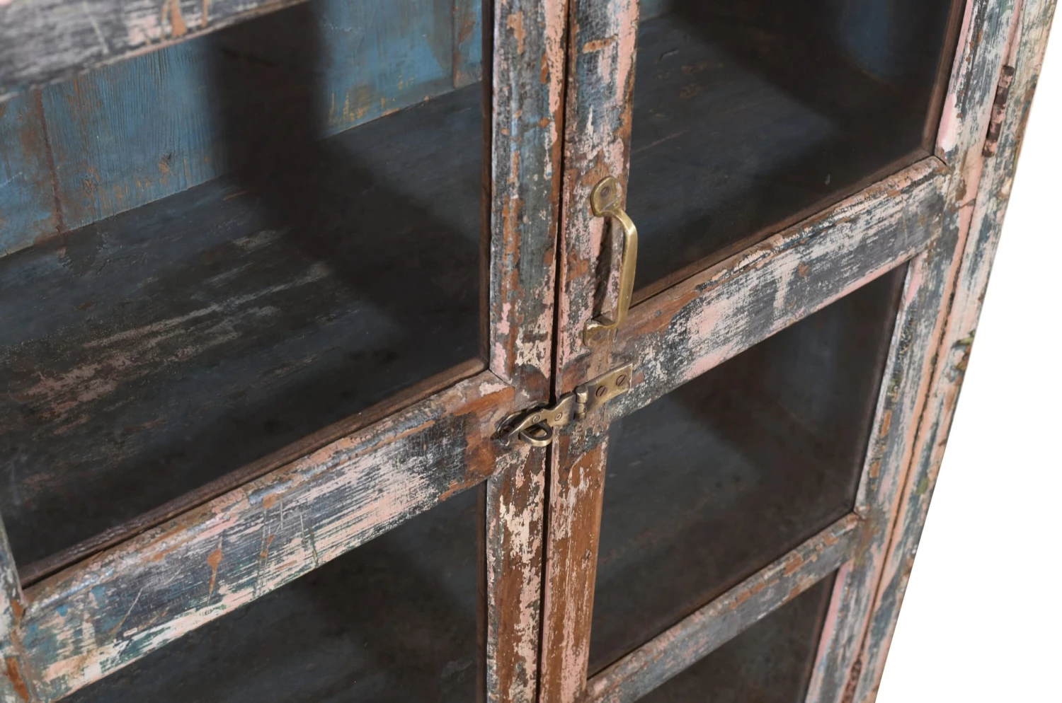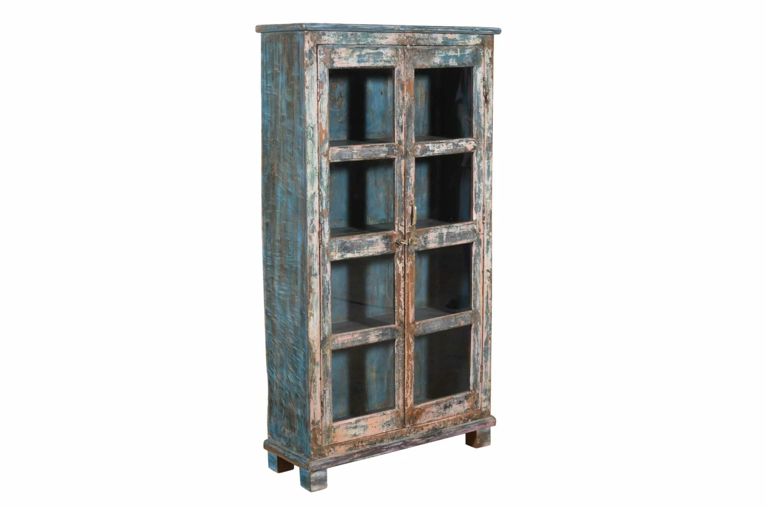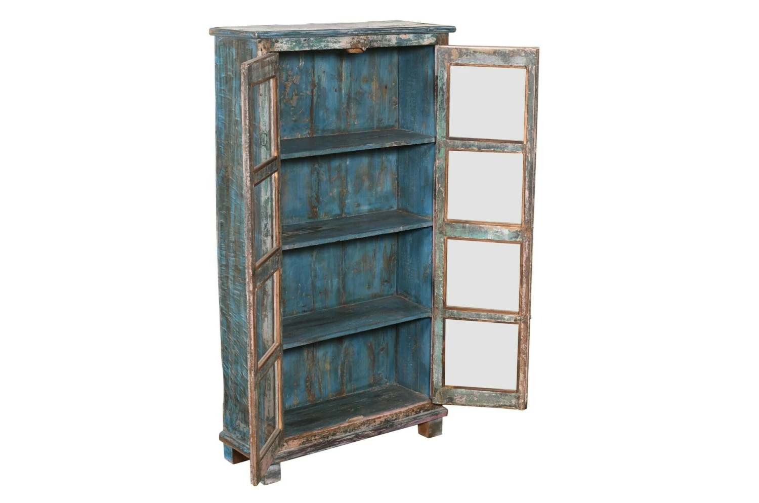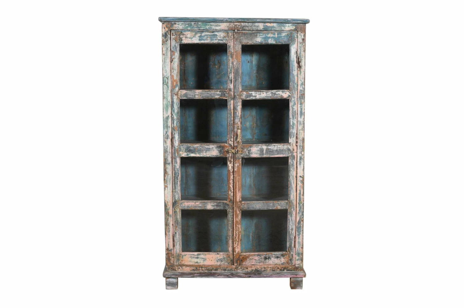 Antique Indian Burma teak wood Kaanch Almirah display cupboard. This is fine old example dating from around 1910-20 with double glass doors and four fitted shelves, and comes with amazing patina created through layers of original paint. With good proportions, these old display cabinets were originally used in the drawing rooms of wealthier families to display items of value. Today these very versatile glass cabinets are repurposed as freestanding kitchen, living room or study storage units. They can essentially be used in any room throughout the house and blend in well with older & more modern surroundings and furniture. Please be sure to check all photos as these form part of the description.