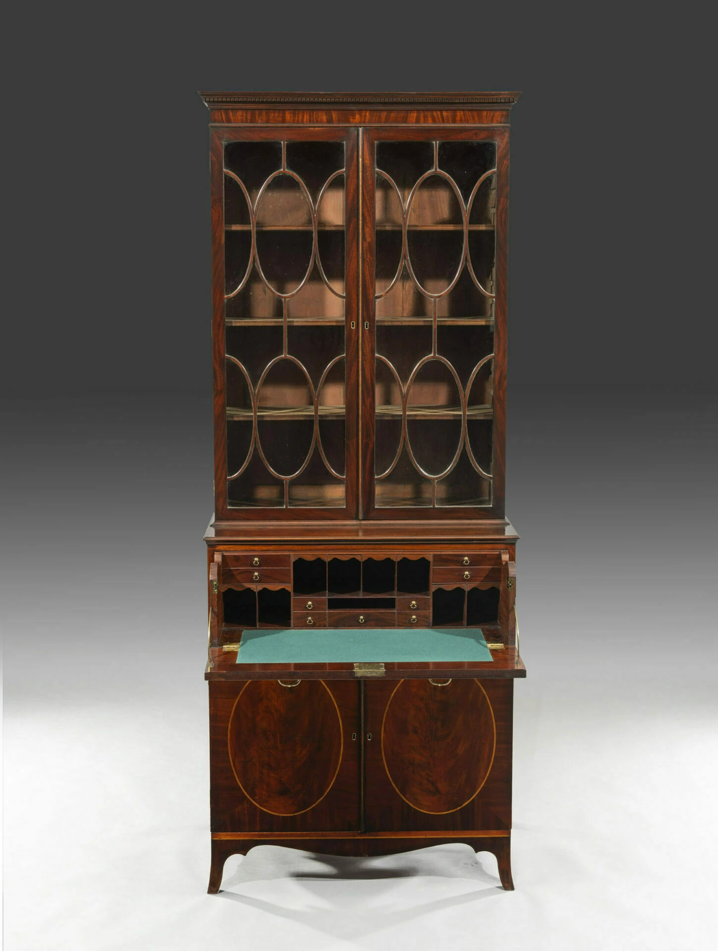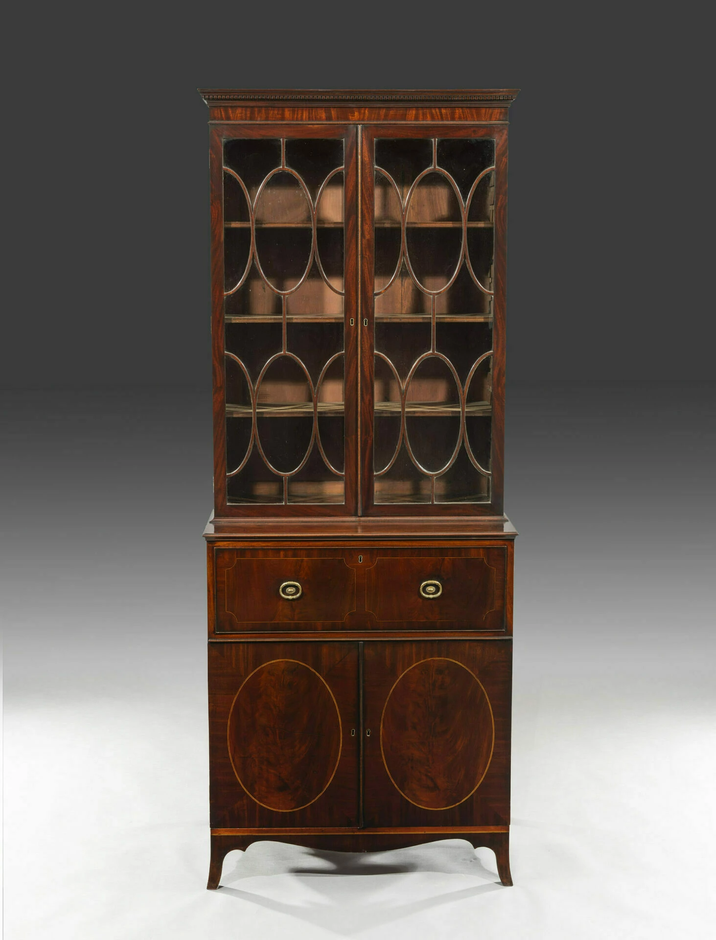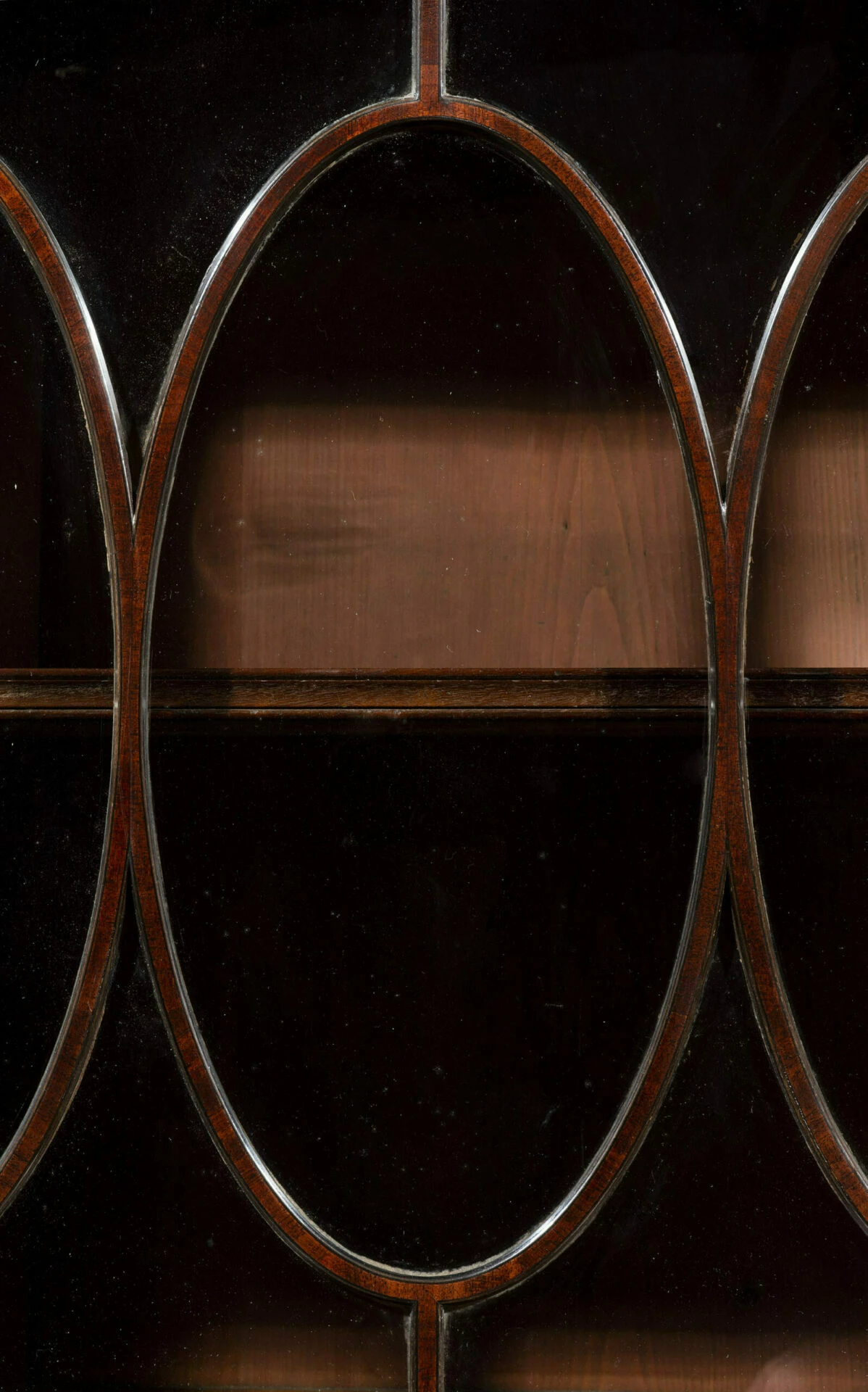 The dentil moulded cornice is surmounted on highly figured vertical cut mahogany veneers above a pair of glazed doors. The oval-shaped astragal glazing arrangement is finely inlaid with ebony stringing and the doors open to reveal three adjustable shelves.
