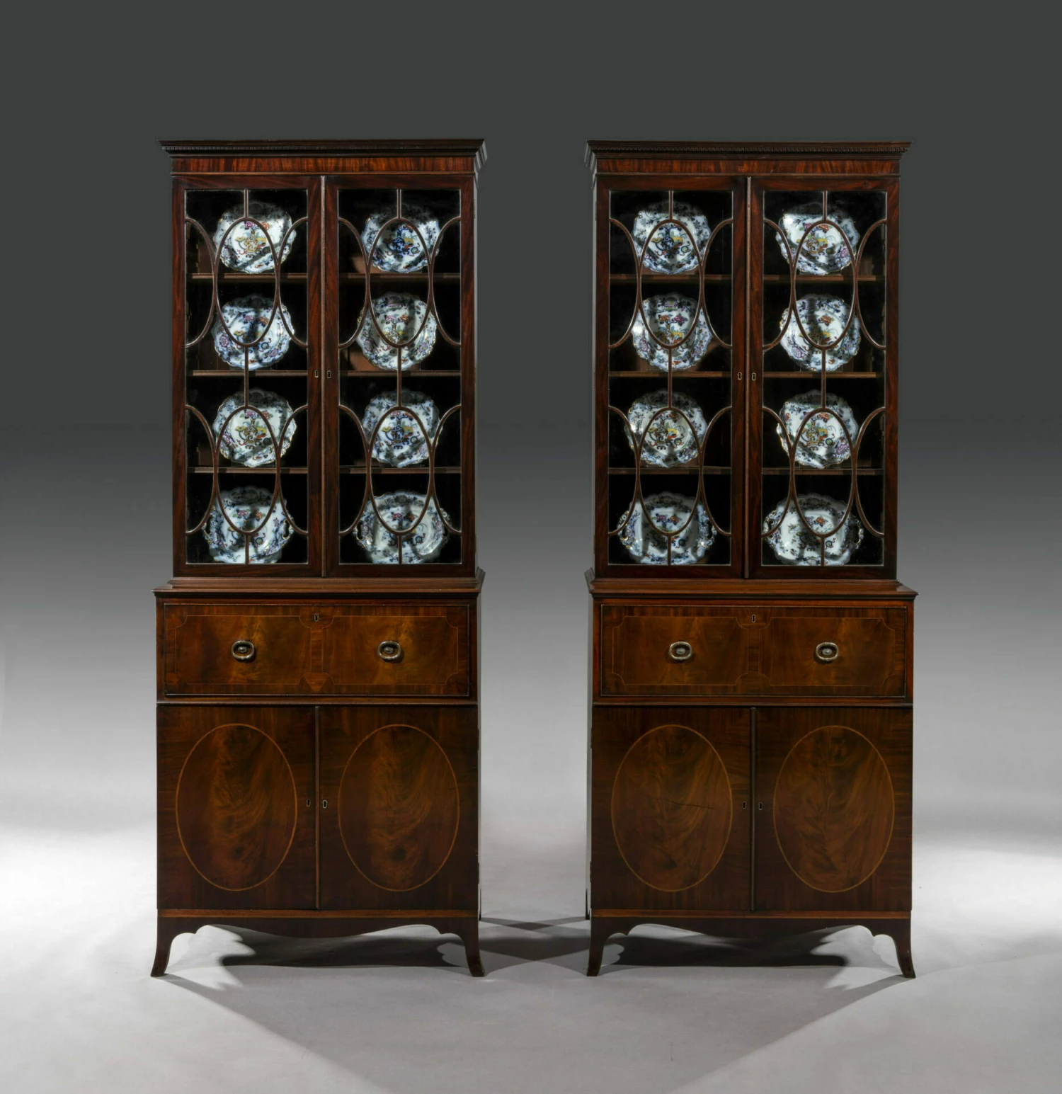 The cupboard doors to the bottom section of the bookcases are made with ascending flamed mahogany oval panels and crossbanded with ebony and boxwood stringing and (on one of the cabinets) open to reveal a bank of three full length drawers which retain the original gilt brass swan neck handles. The other bookcase opens to reveal a cupboard with an adjustable shelf.