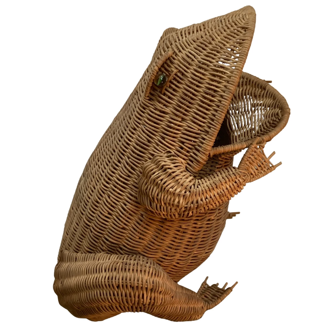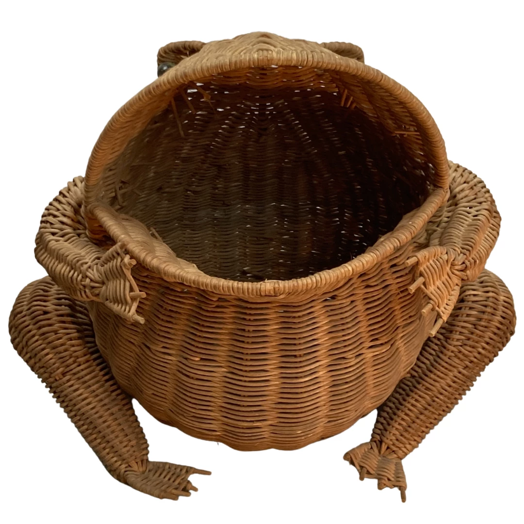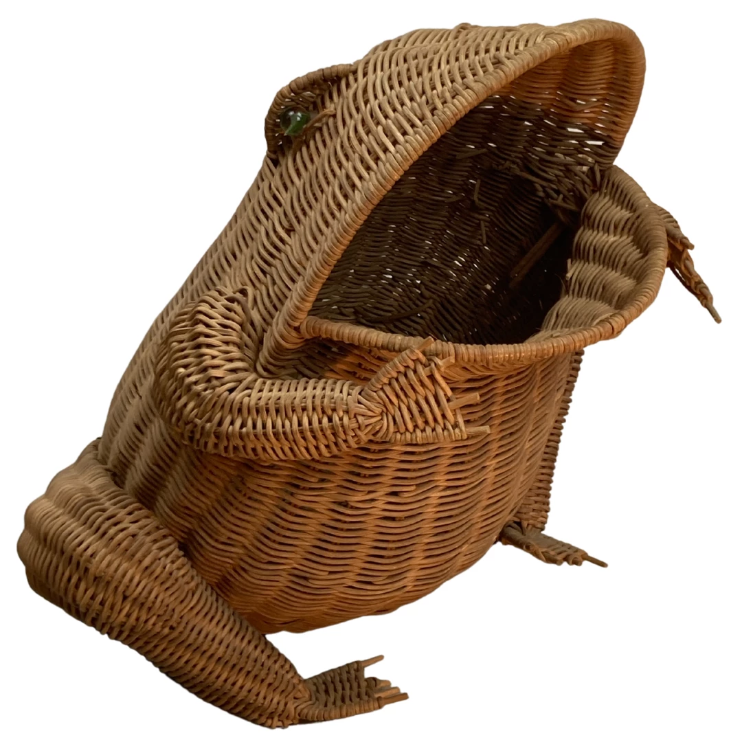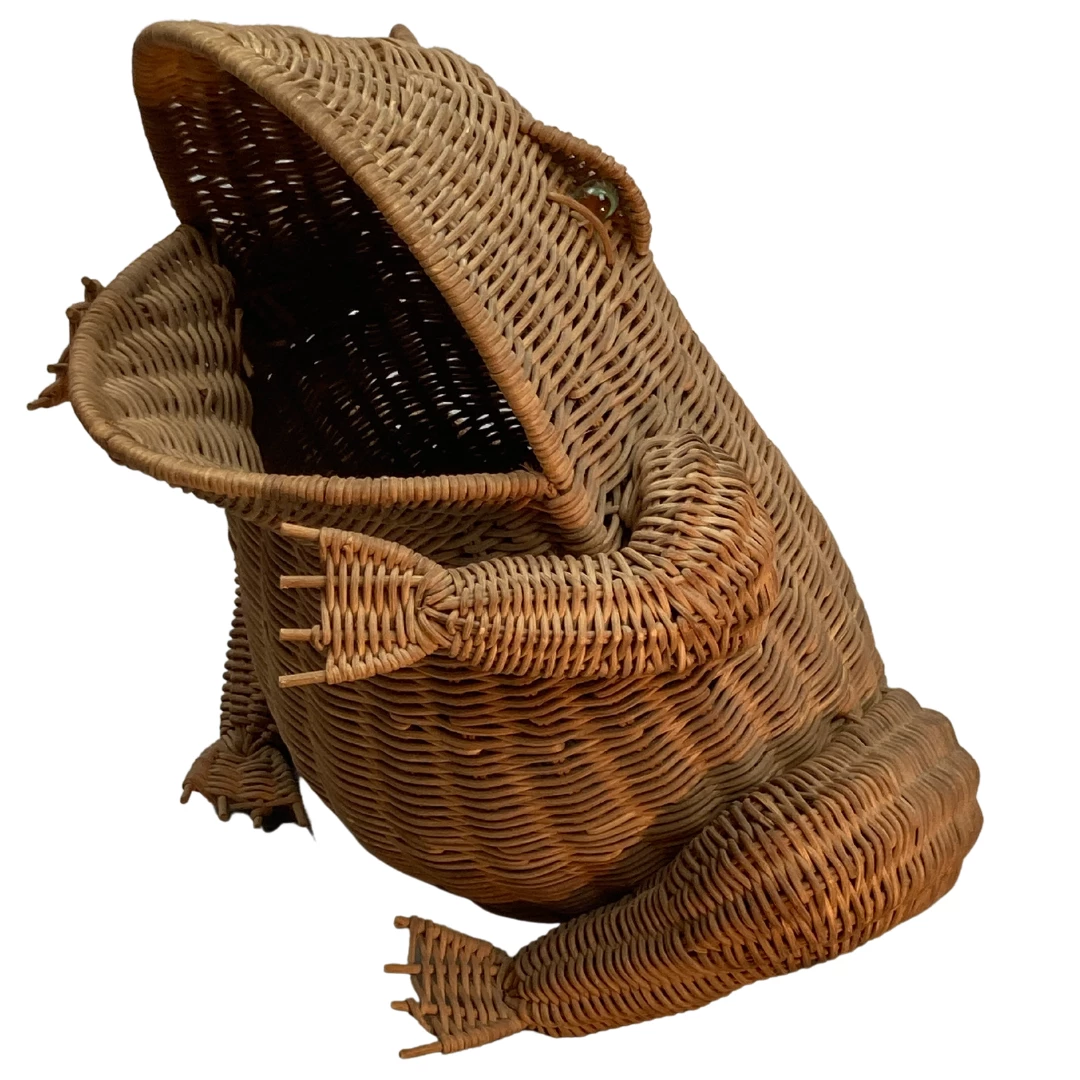A large ( 43 cm ) rattan frog which originally is used for magazines but of course can be used as any basket to one preference. The rattan is still in good nick without any missing pieces ( all fingers and toes are intact ). The eyes are made of glass.