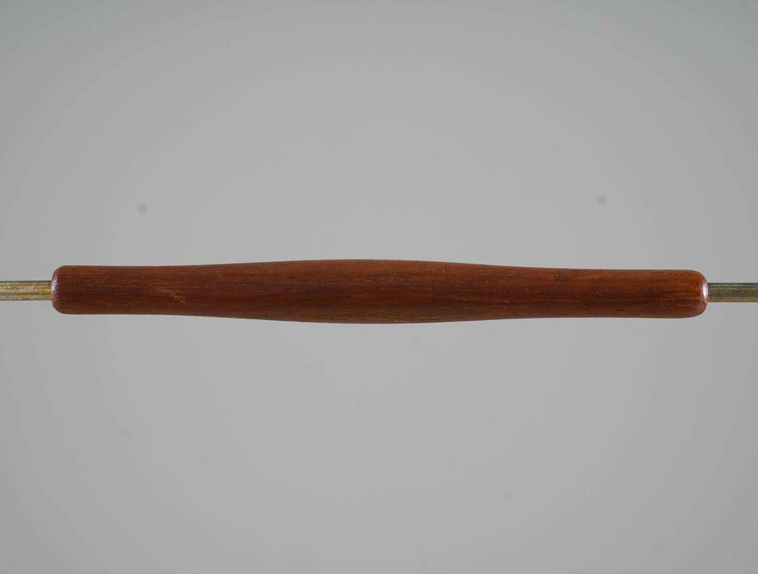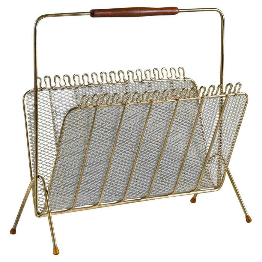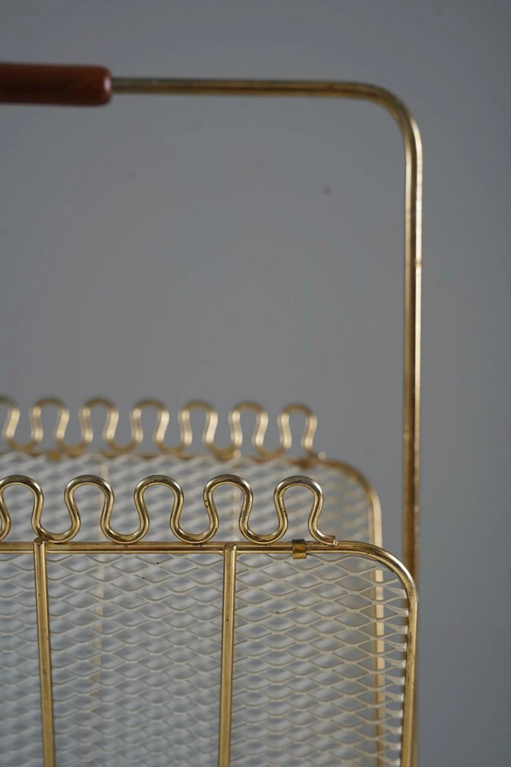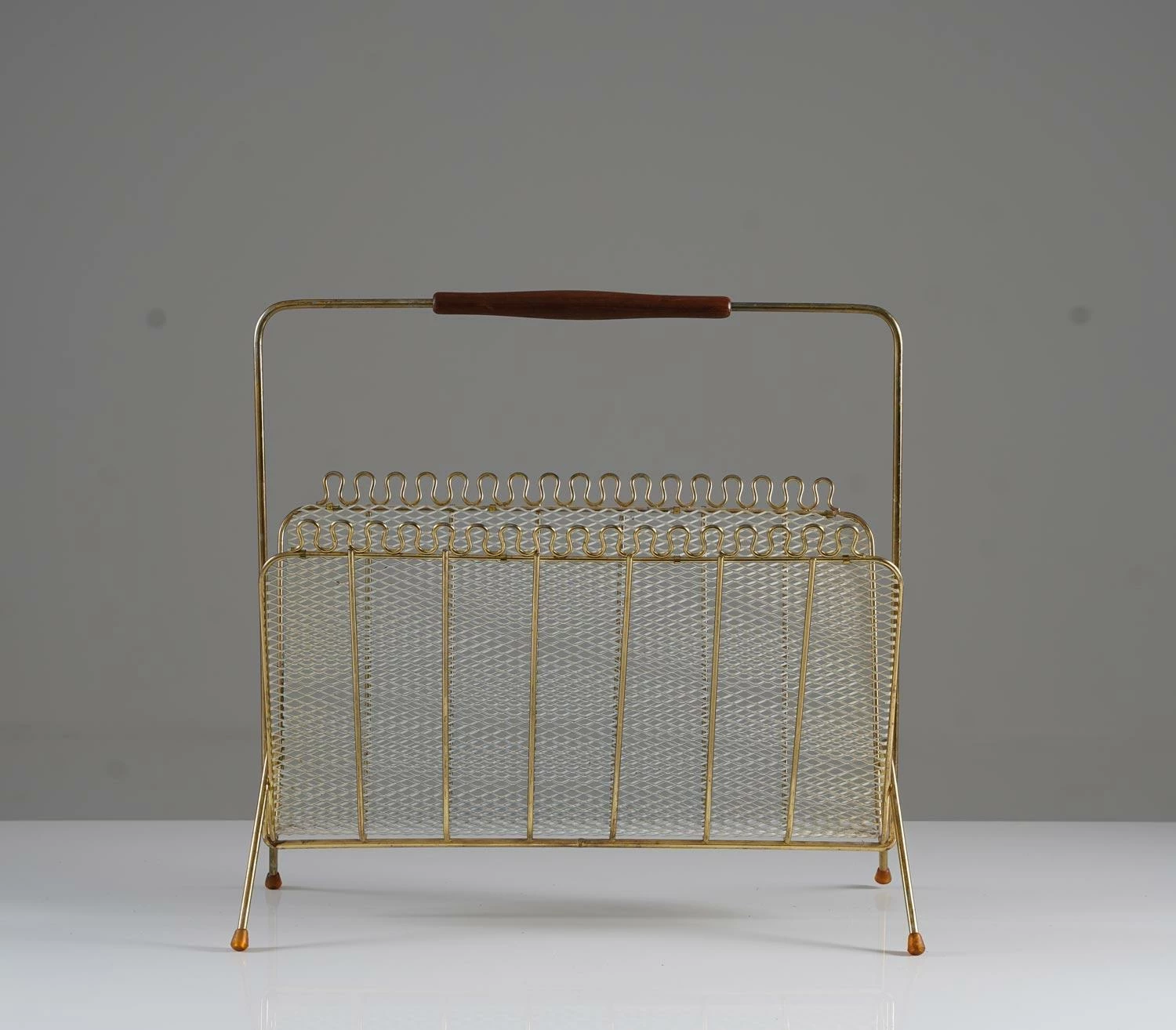 Scandinavian mid-century magazine holder in metal with a teak handle. Manufactured in Sweden circa 1950.