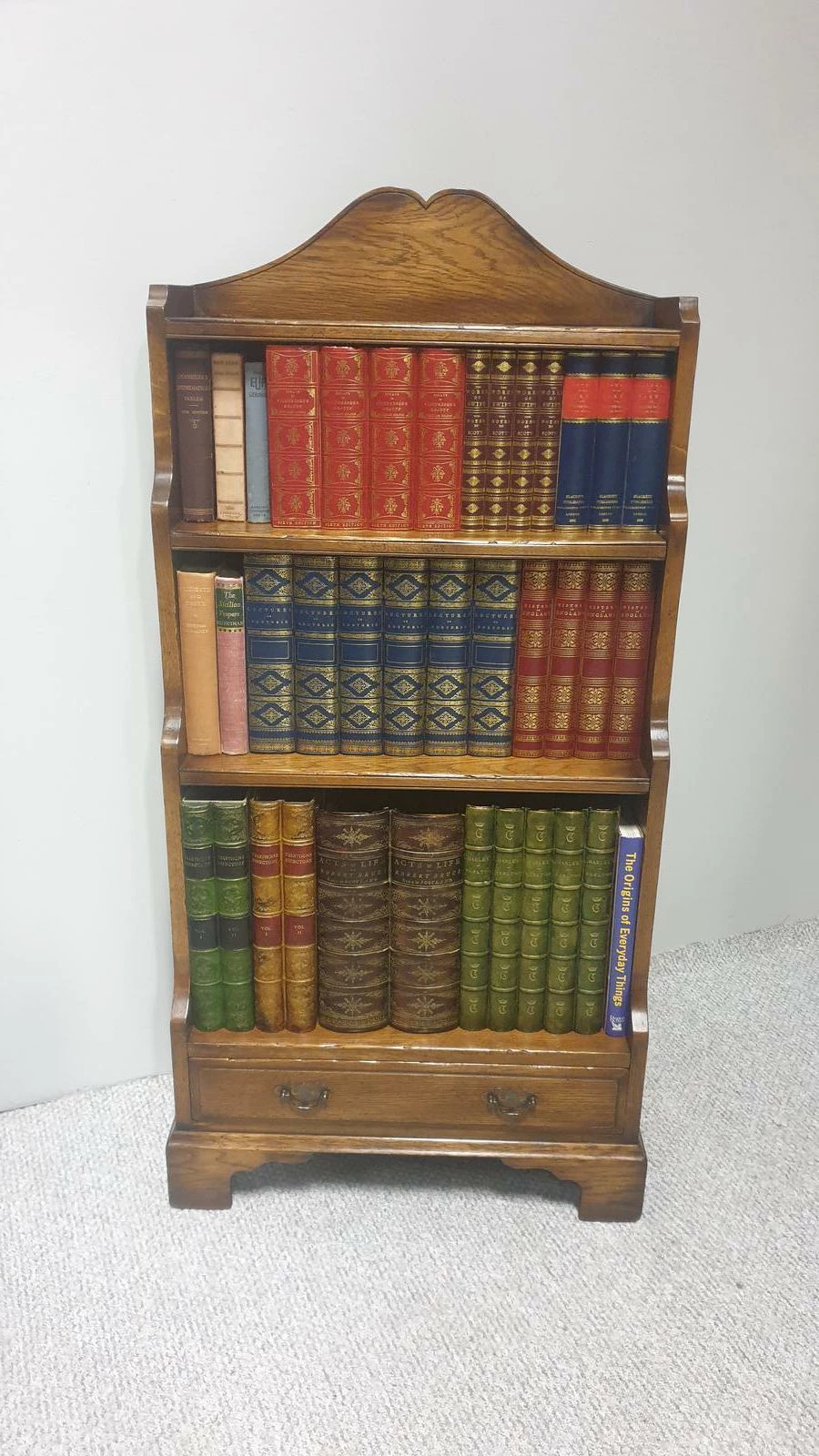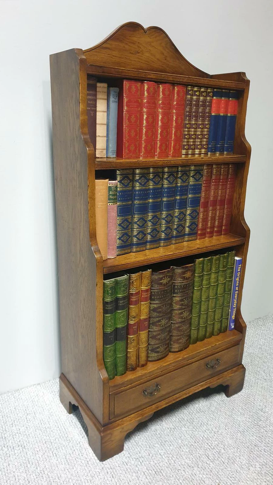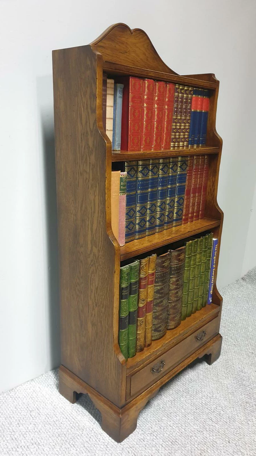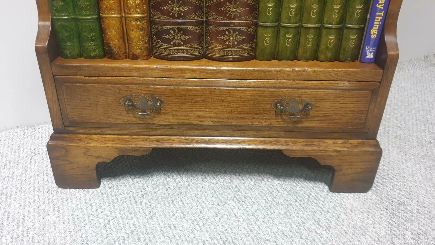 Solid oak throughout, waterfall bookcase with two drawers under and brass handles, excellent colour and Condition.
