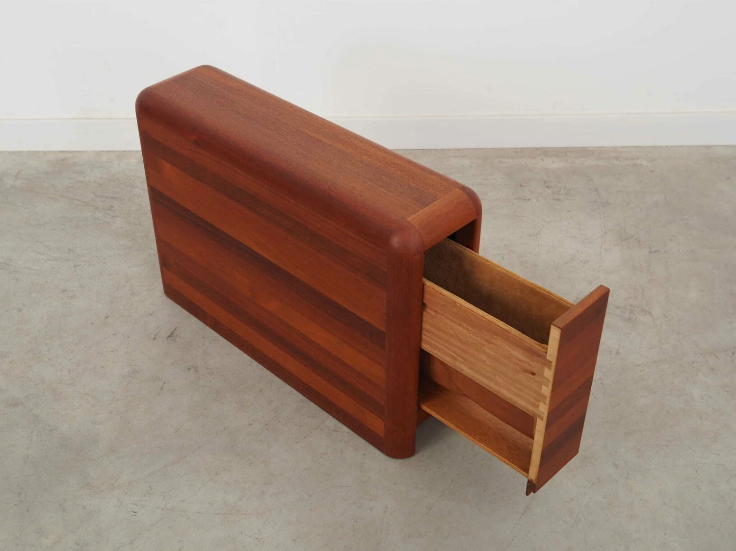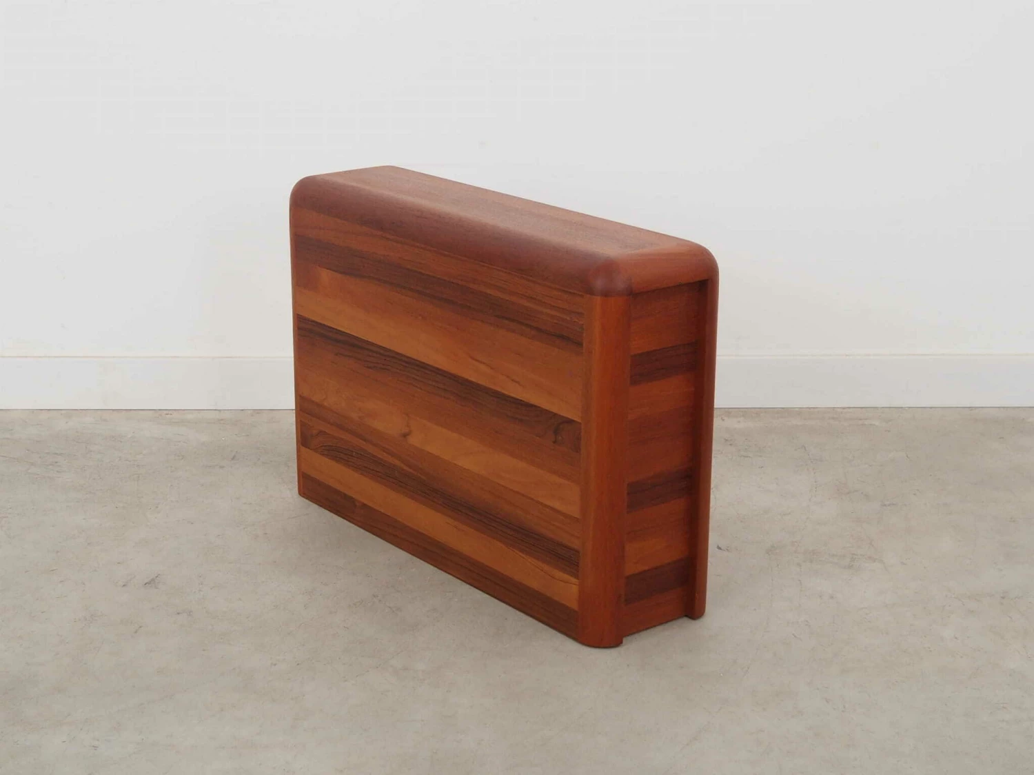 The structure was made of solid teak wood. The surface has been refreshed. The space inside has been filled with a newspaper drawer. Two pieces available. The price is for one piece.