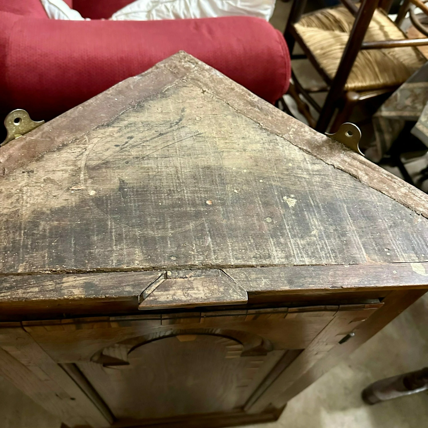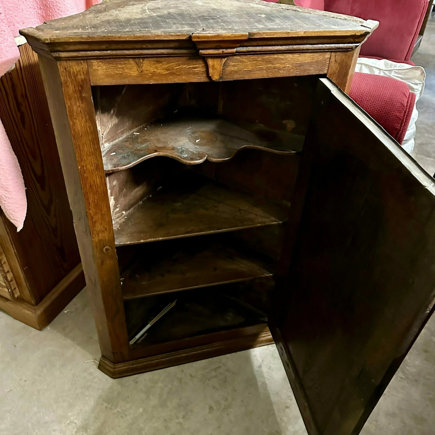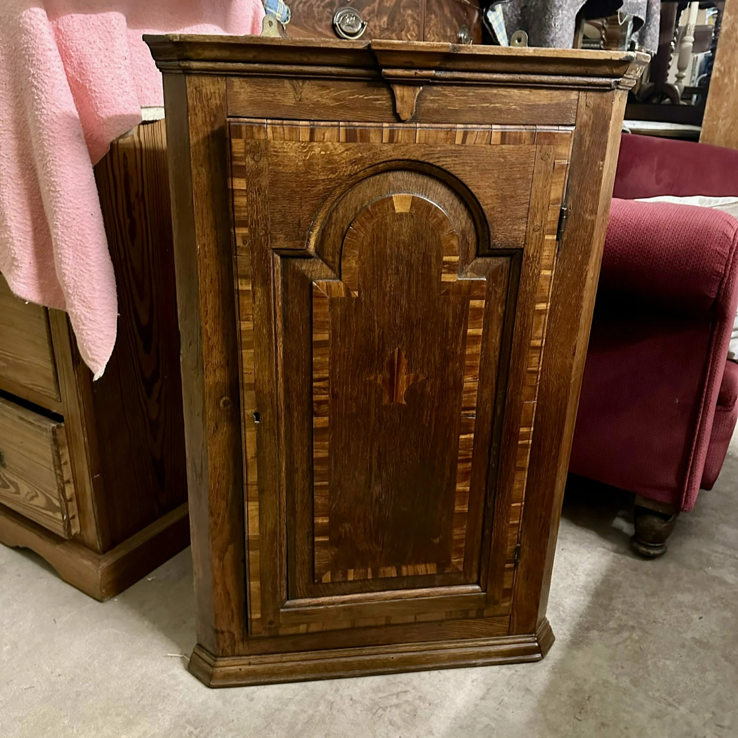 This is an early Victorian mahogany crossbanded corner cupboard. It is a lovely piece. The doors in particular are gorgeous, the banding around the outside follows the arch panel and looks really distinctive. The wood is a lovely mellow colour and glows with age. The top has a lovely cornice with a breakfront at the middle. Inside the cupboard has 3 shelves, the top one being a great shape. The cupboard top is flat and the back retains its brass hanging brackets. It is a nice piece in good order with some pretty features. Sadly there is no key.