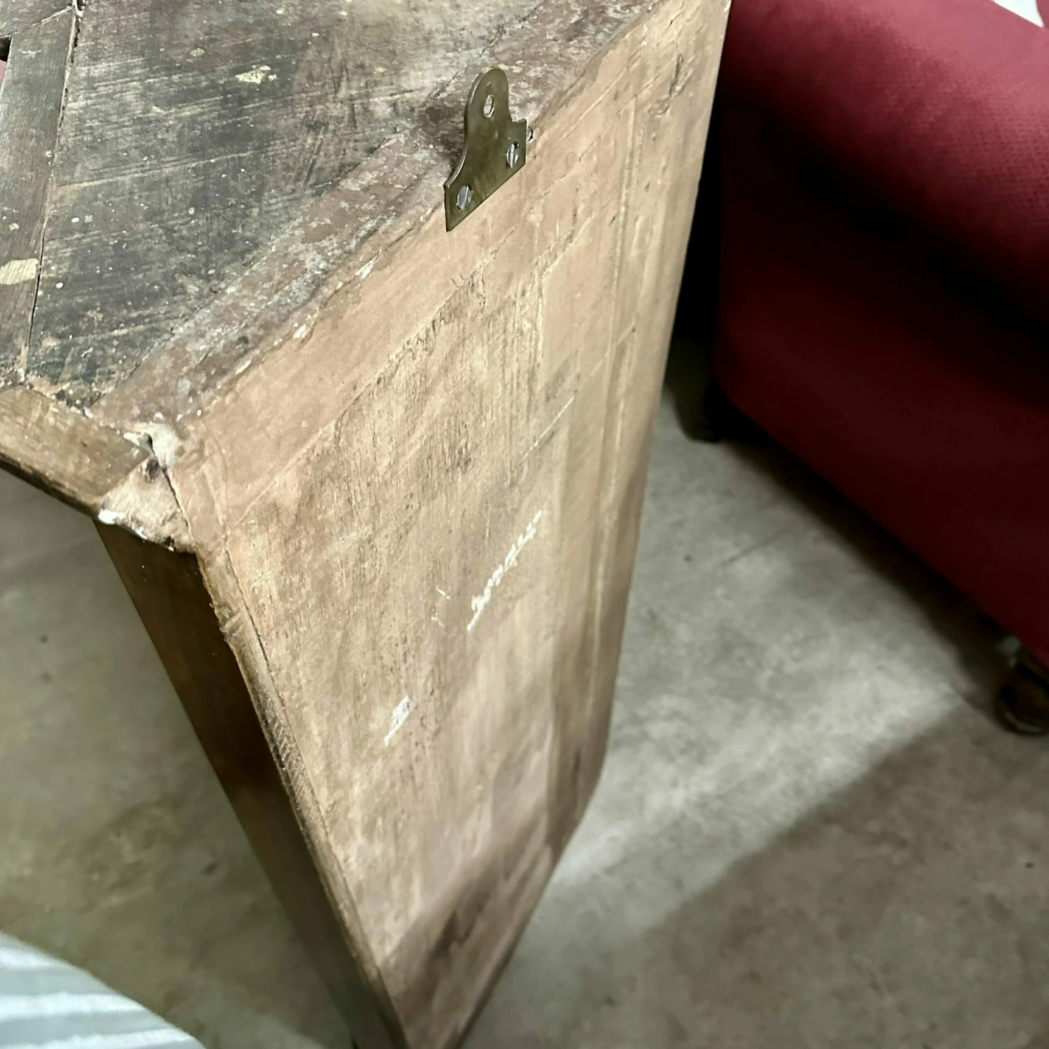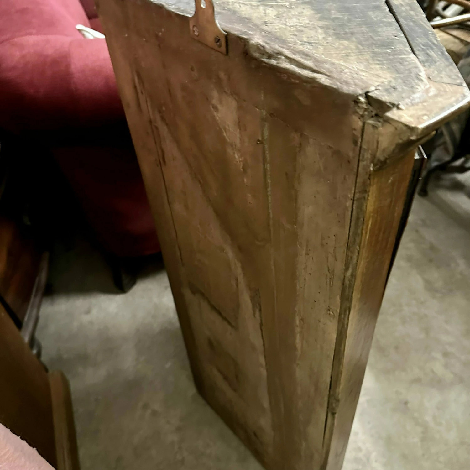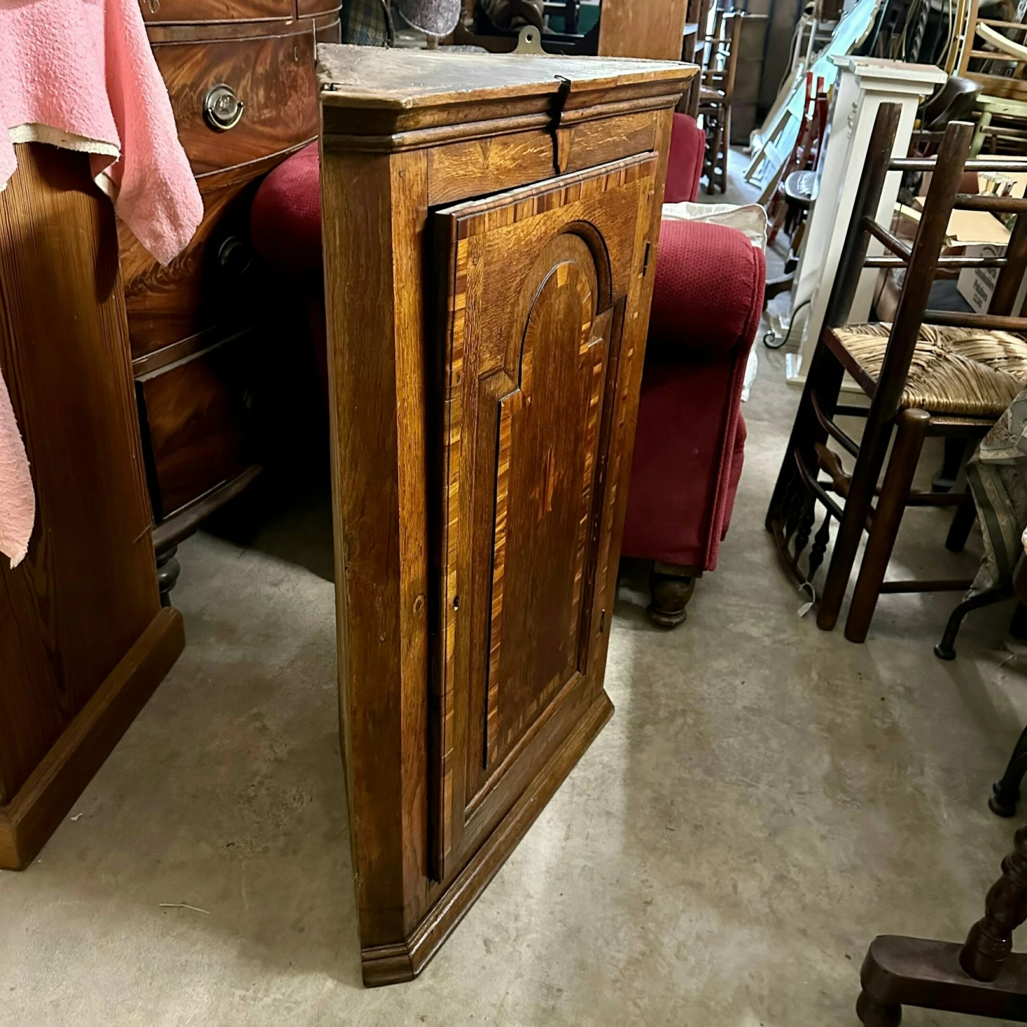 This is an early Victorian mahogany crossbanded corner cupboard. It is a lovely piece. The doors in particular are gorgeous, the banding around the outside follows the arch panel and looks really distinctive. The wood is a lovely mellow colour and glows with age. The top has a lovely cornice with a breakfront at the middle. Inside the cupboard has 3 shelves, the top one being a great shape. The cupboard top is flat and the back retains its brass hanging brackets. It is a nice piece in good order with some pretty features. Sadly there is no key.