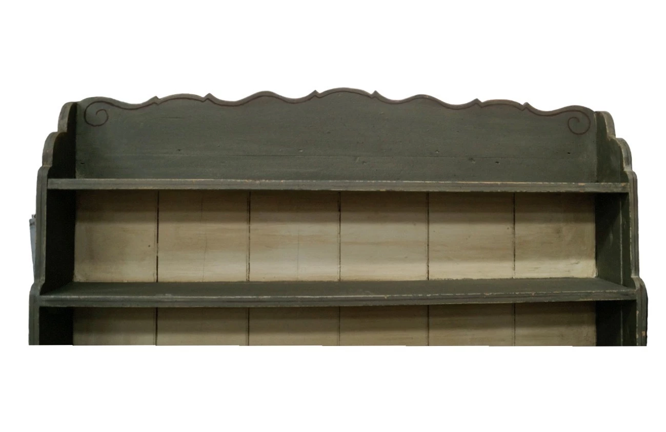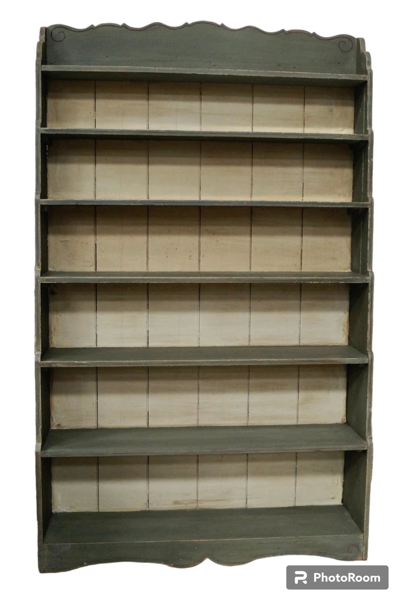 A fine quality Victorian painted waterfall bookcase. Made from Pine with a panelled back, headed by a shaped top. This waterfall/open bookcase is an upright rectangular form with seven fixed graduated shelves set on a painted shaped apron. C1898