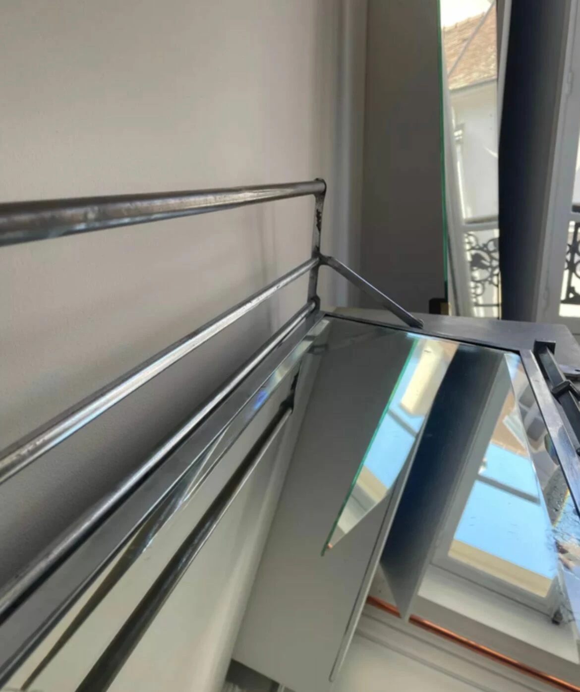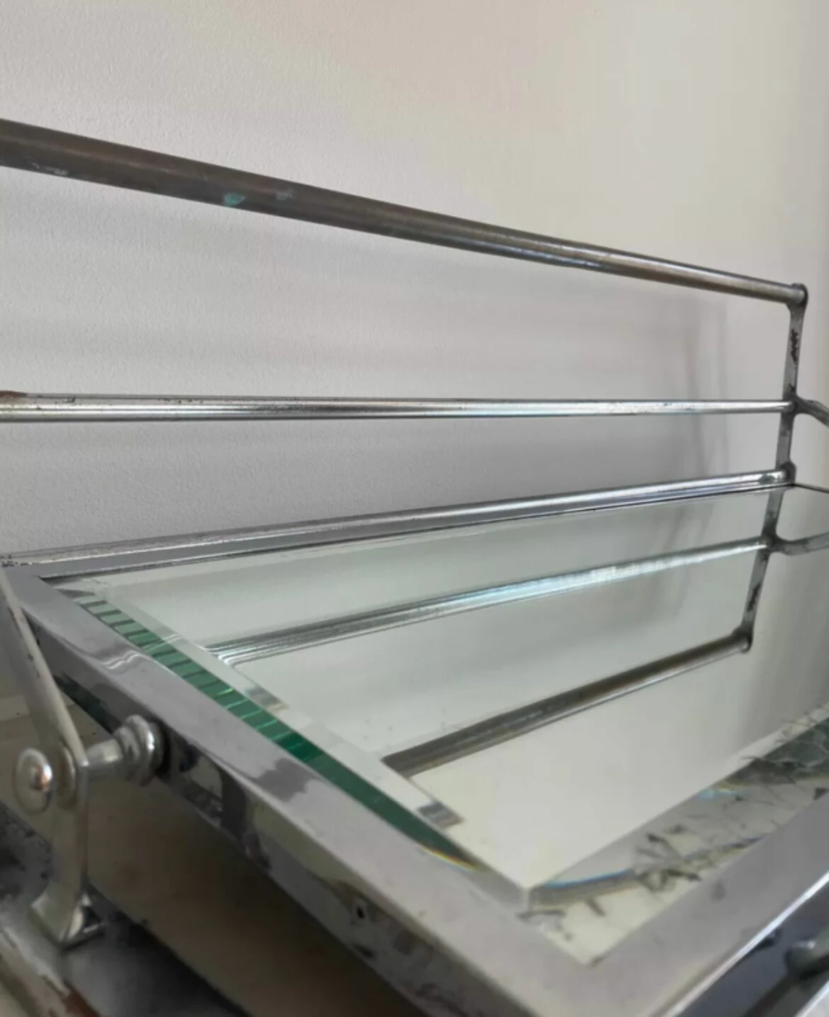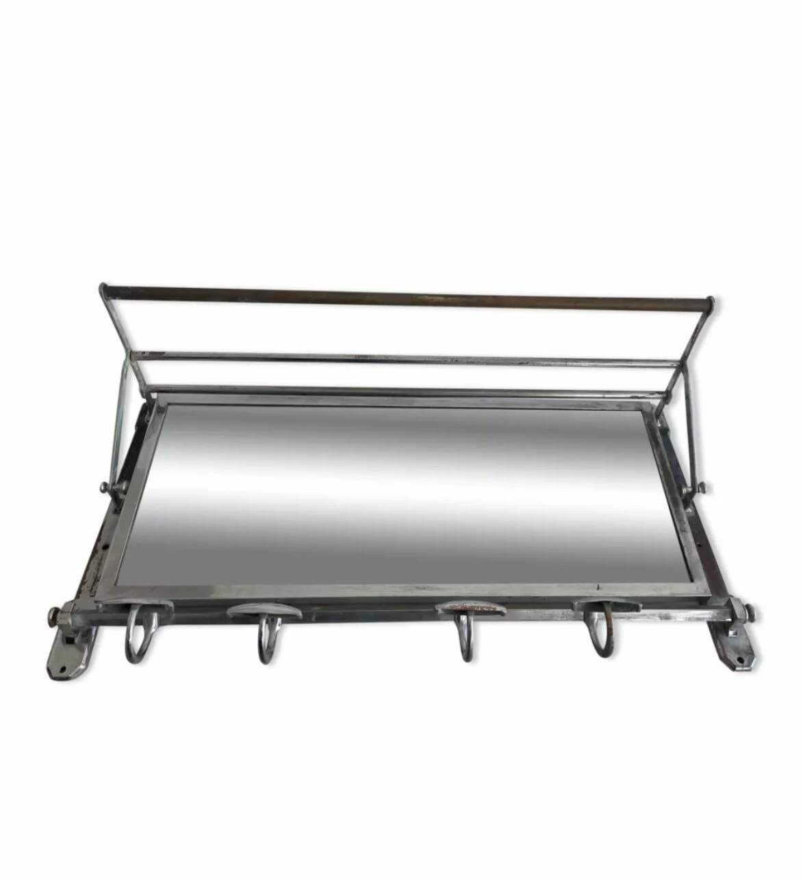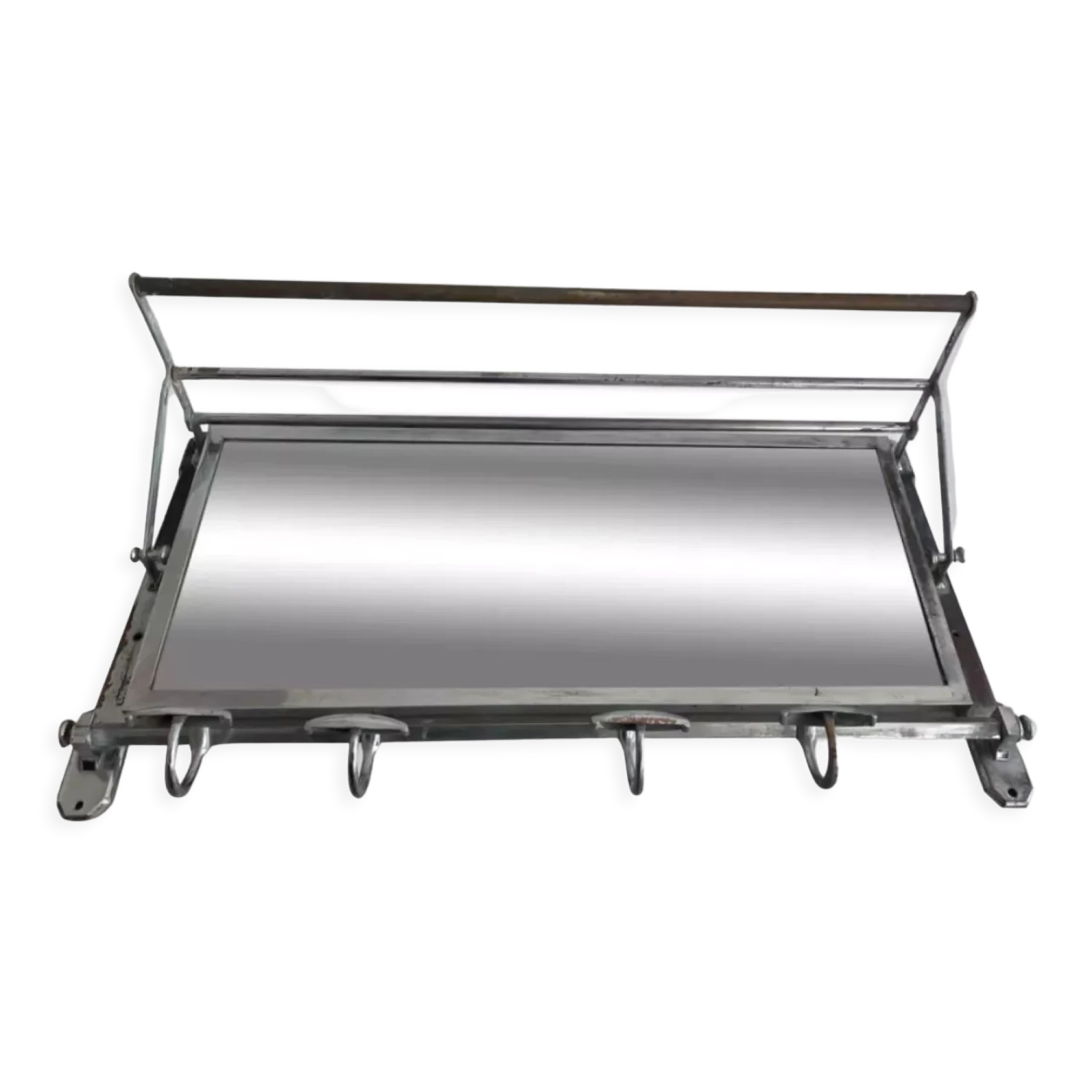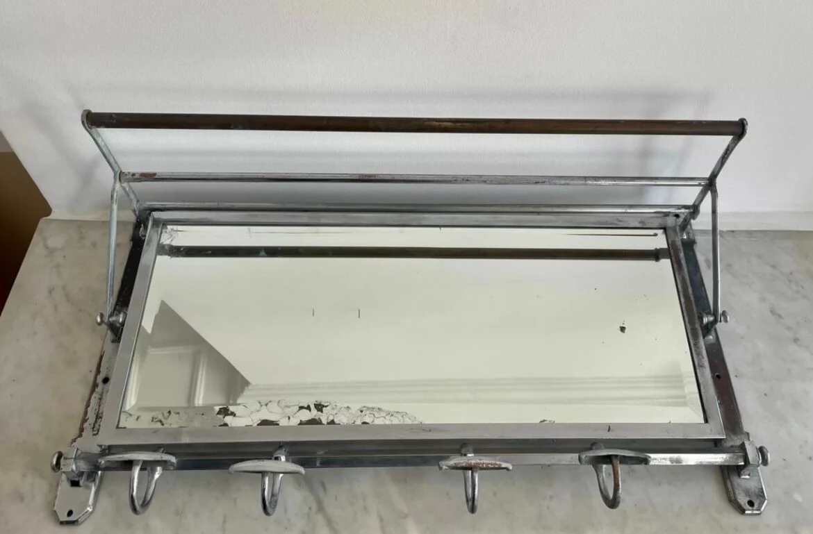 Art deco wall coat rack in chromed metal fixed by 4 screws. Adjustable beveled mirror in the center. In addition to the 3 bars there are 4 hooks. Nearly a century for this piece still as modern.