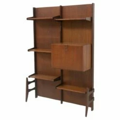 The bookcase is totally made of fine wood and is distributed on two modules. The first houses three shelves, supported at the bottom by a structure with two bars in darker wood. The second module contains two shelves equal to the others and a closed wooden cube, with an internal shelf that creates two different spaces. The cube opens outwards by means of a gilded brass mechanism.