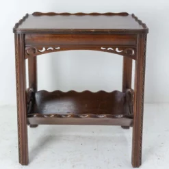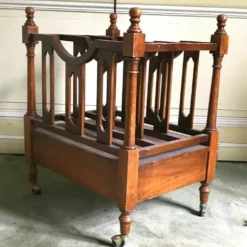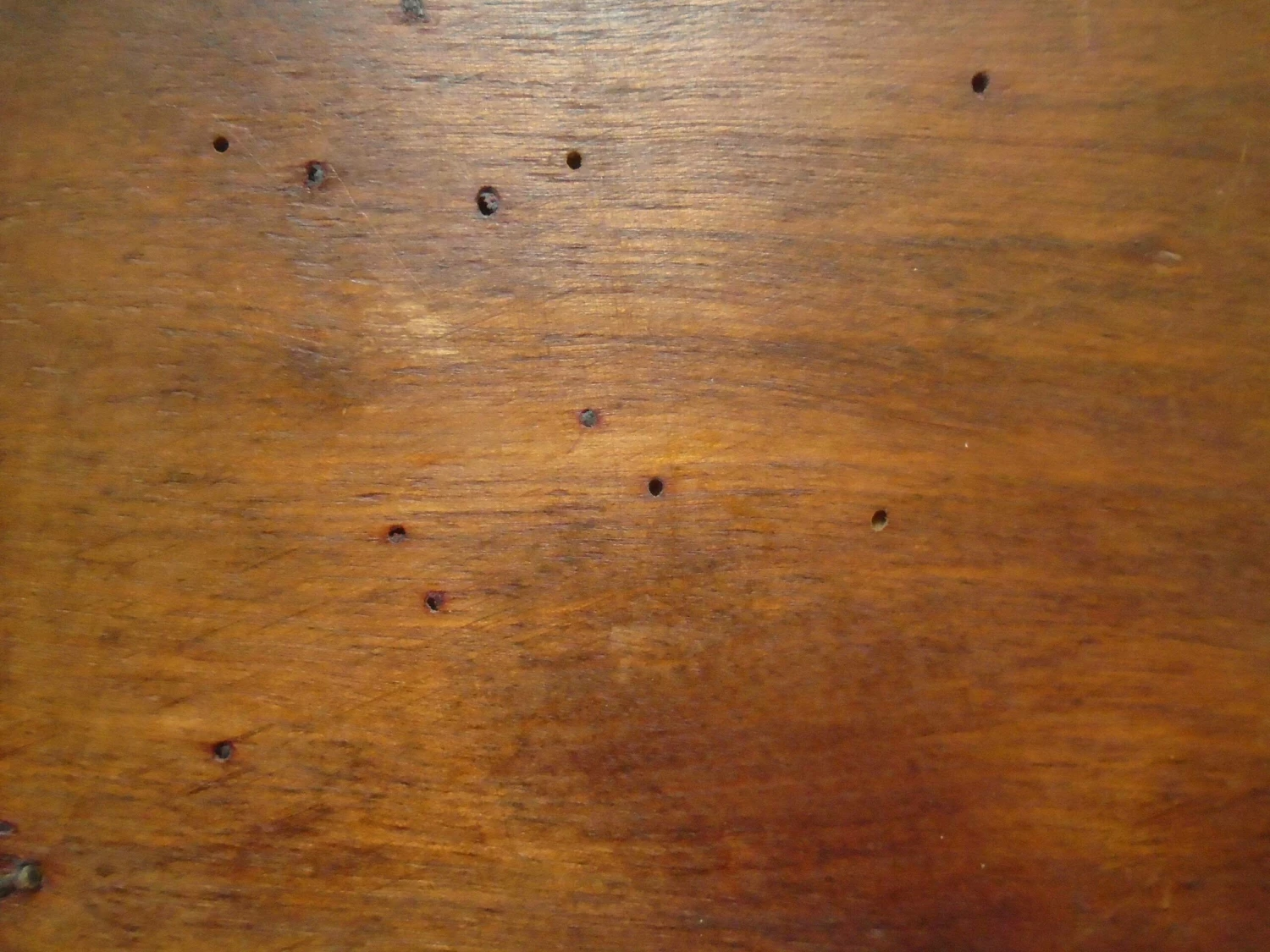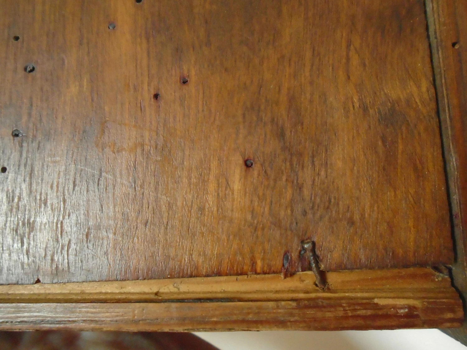 It is in a good vintage condition. Old inactive woodworm holes, small chip on right front corner (see photo 6). One nail shows on the inside base, but this doesn’t affect its function. Screws on the base are rusted.