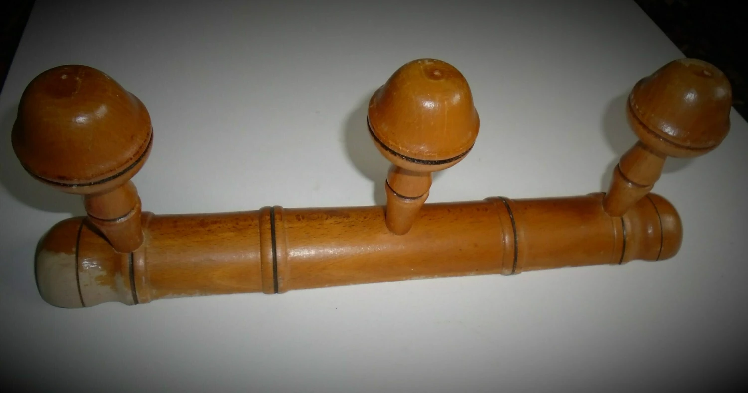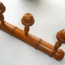 This is a vintage French faux bamboo wooden three hook wall coat rack, from the 1950s. These were very popular back in their day in French country homes. This model has three hanging hooks. No hanging hooks or holes yet drilled for hanging purposes. Some inactive woodworm holes can be seen, commensurate with age. A nice house-warming gift for your vintage loving friends perhaps or a unique hostess gift (who could not do with more coat hanging hooks?). Can be used anywhere in the home – in the kitchen to hang tea towels or pots from, in the bathroom to hang towels on, in the porch, in the hallway, for coats and hats, etc.