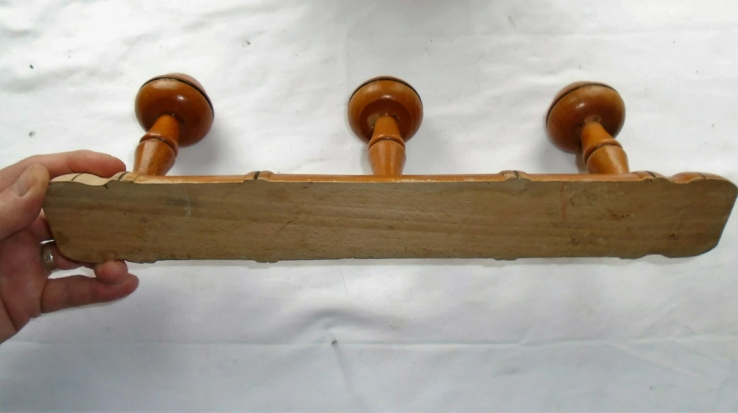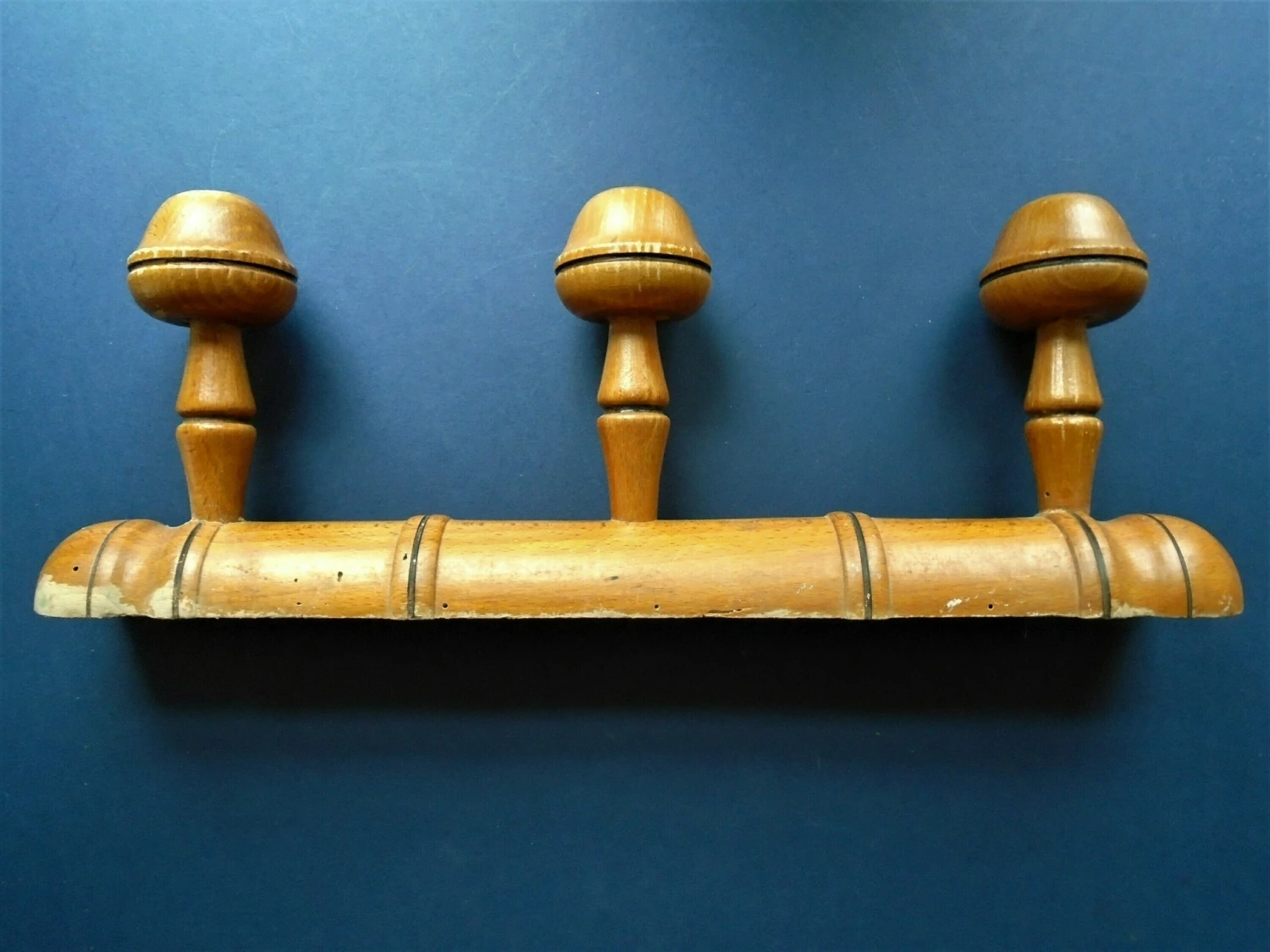 This wall coat rack is in a very good condition with some loss of varnish. Please see photo close ups. A lovely solid coat / hat rack. There are several inactive woodworm holes.