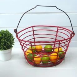 Vintage French round red wire egg, garden, potato, fruit or vegetable basket with handle