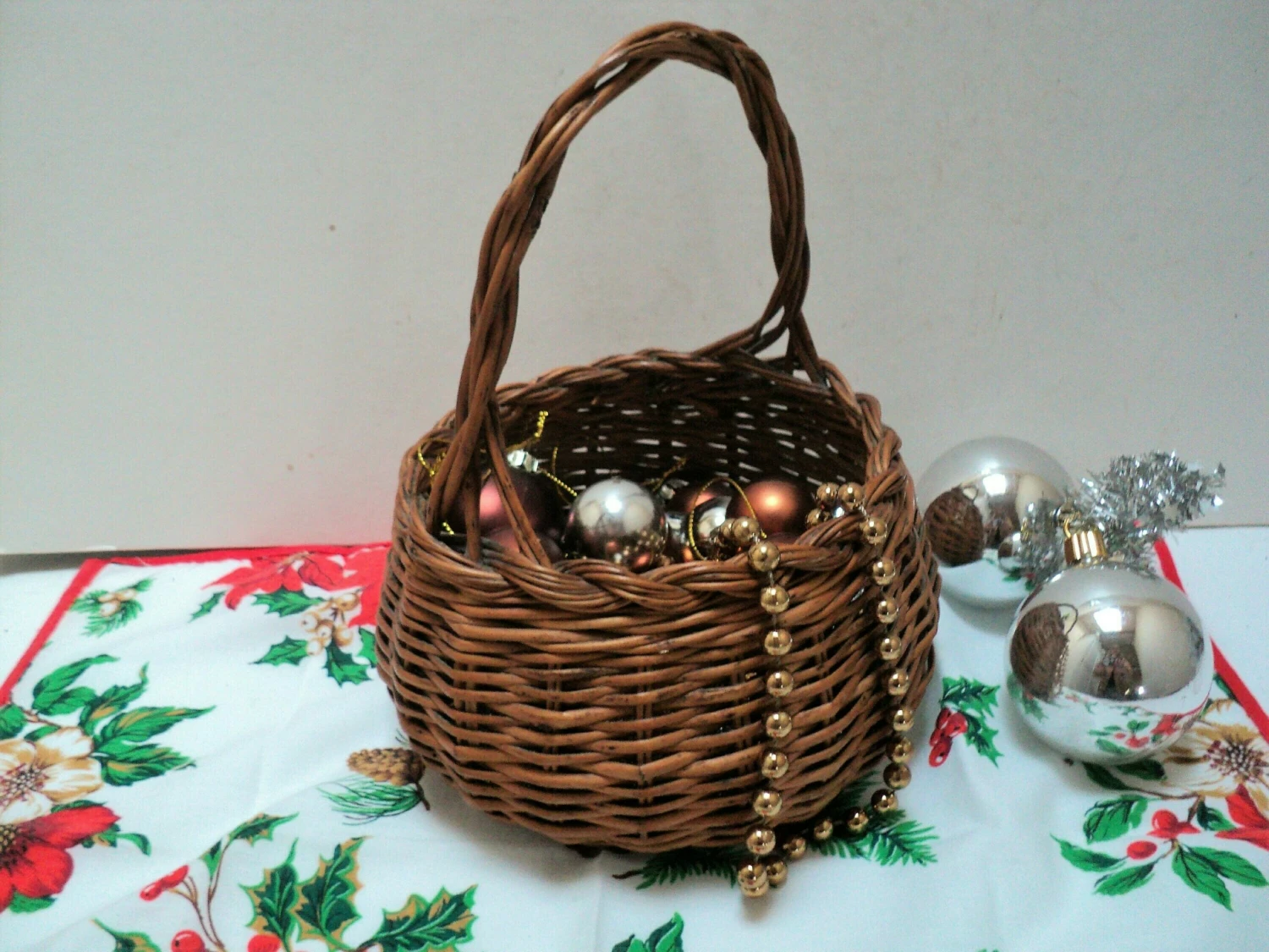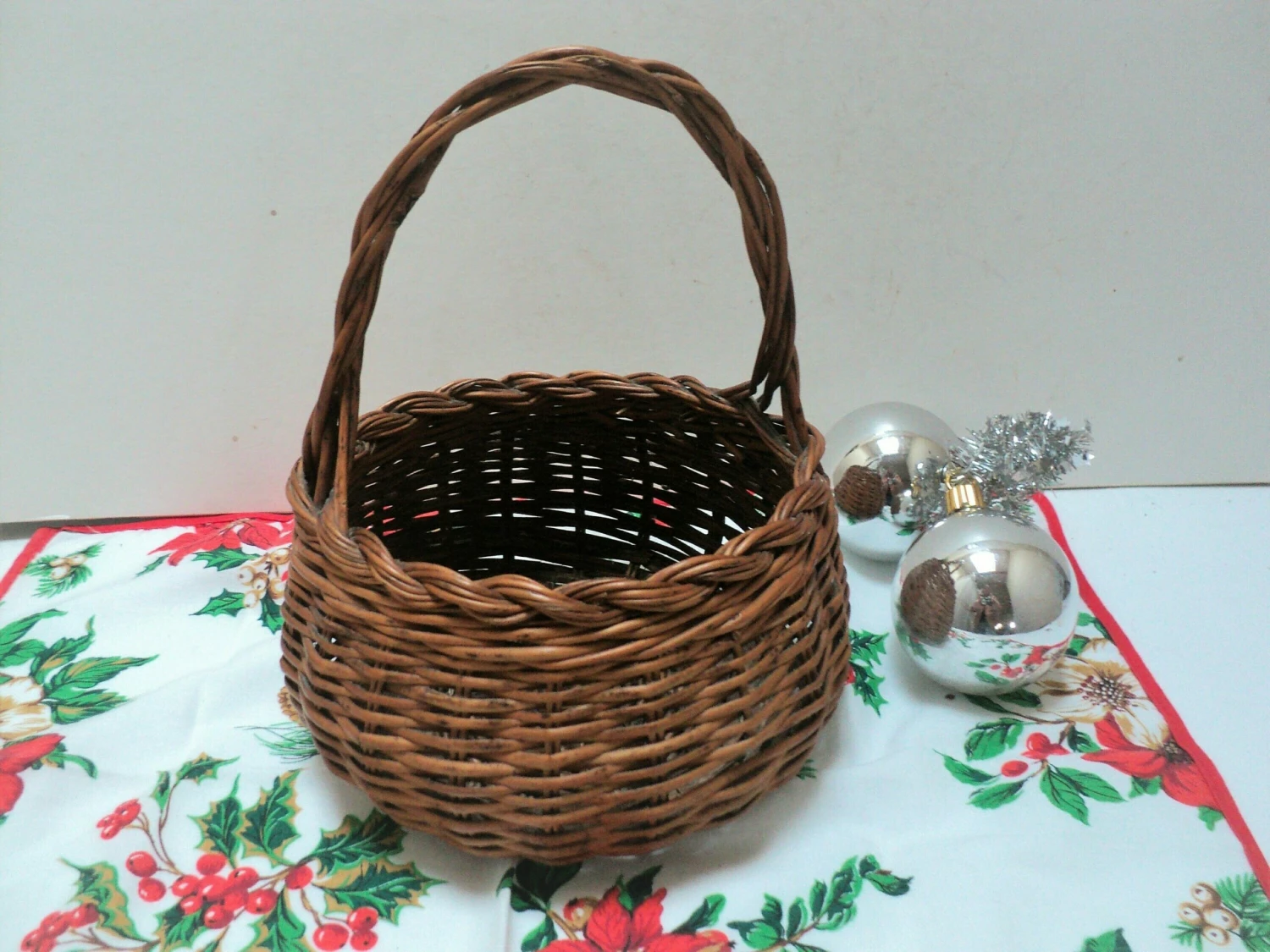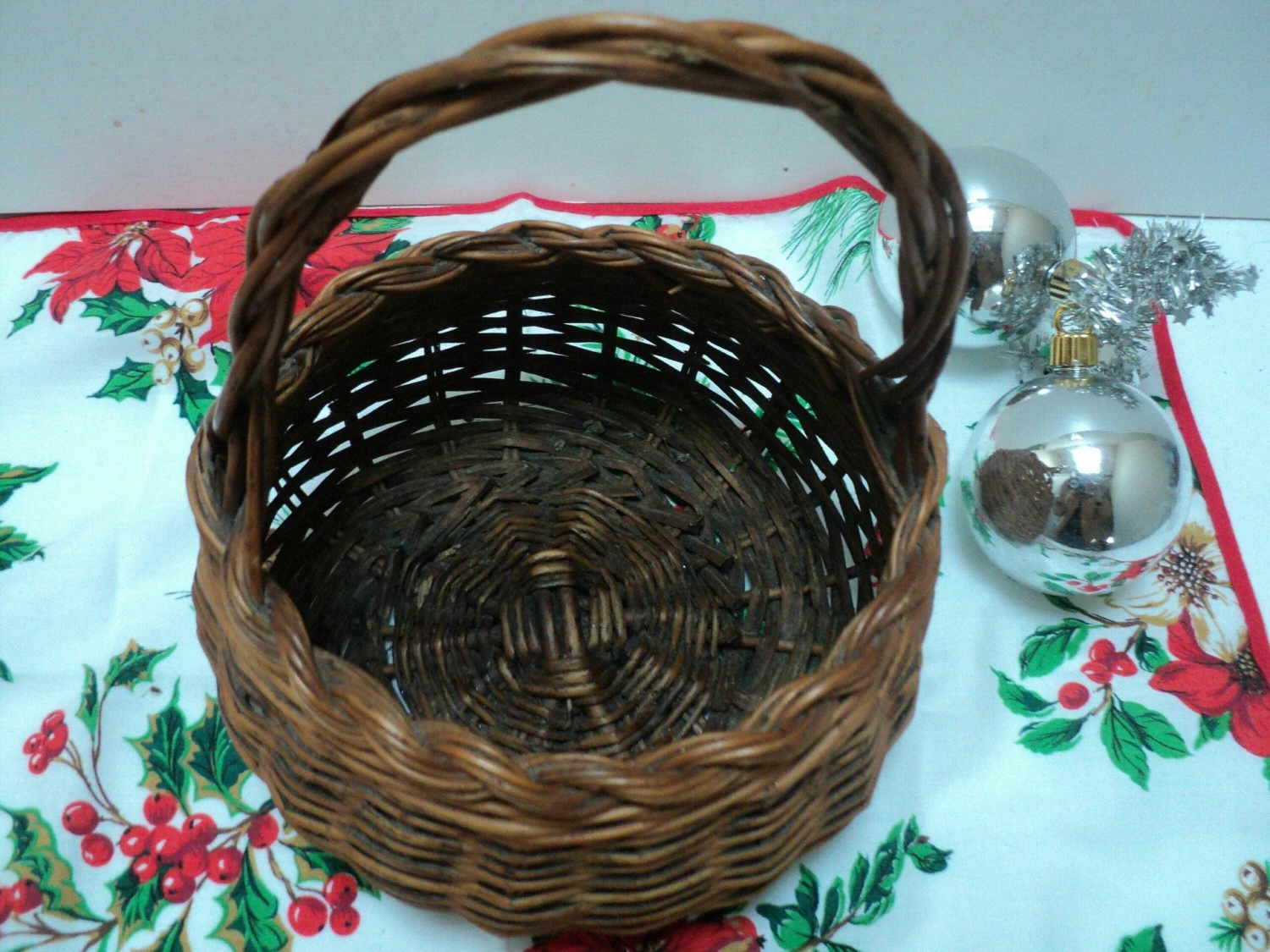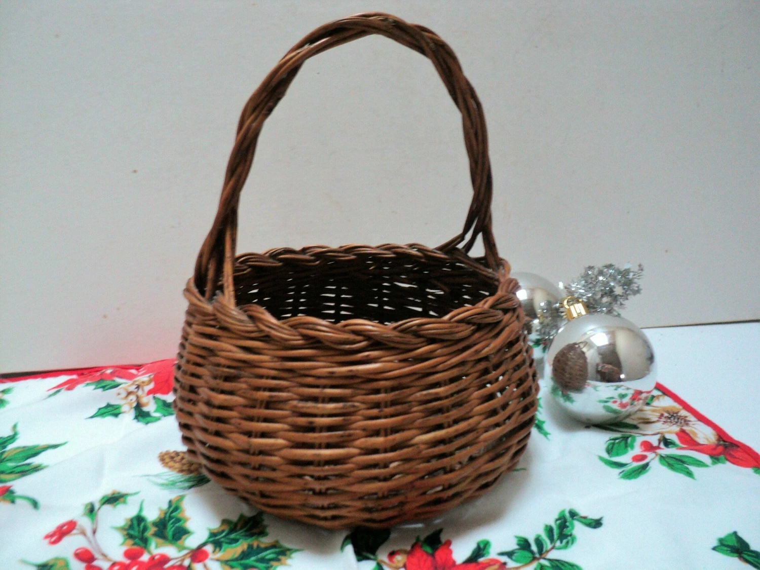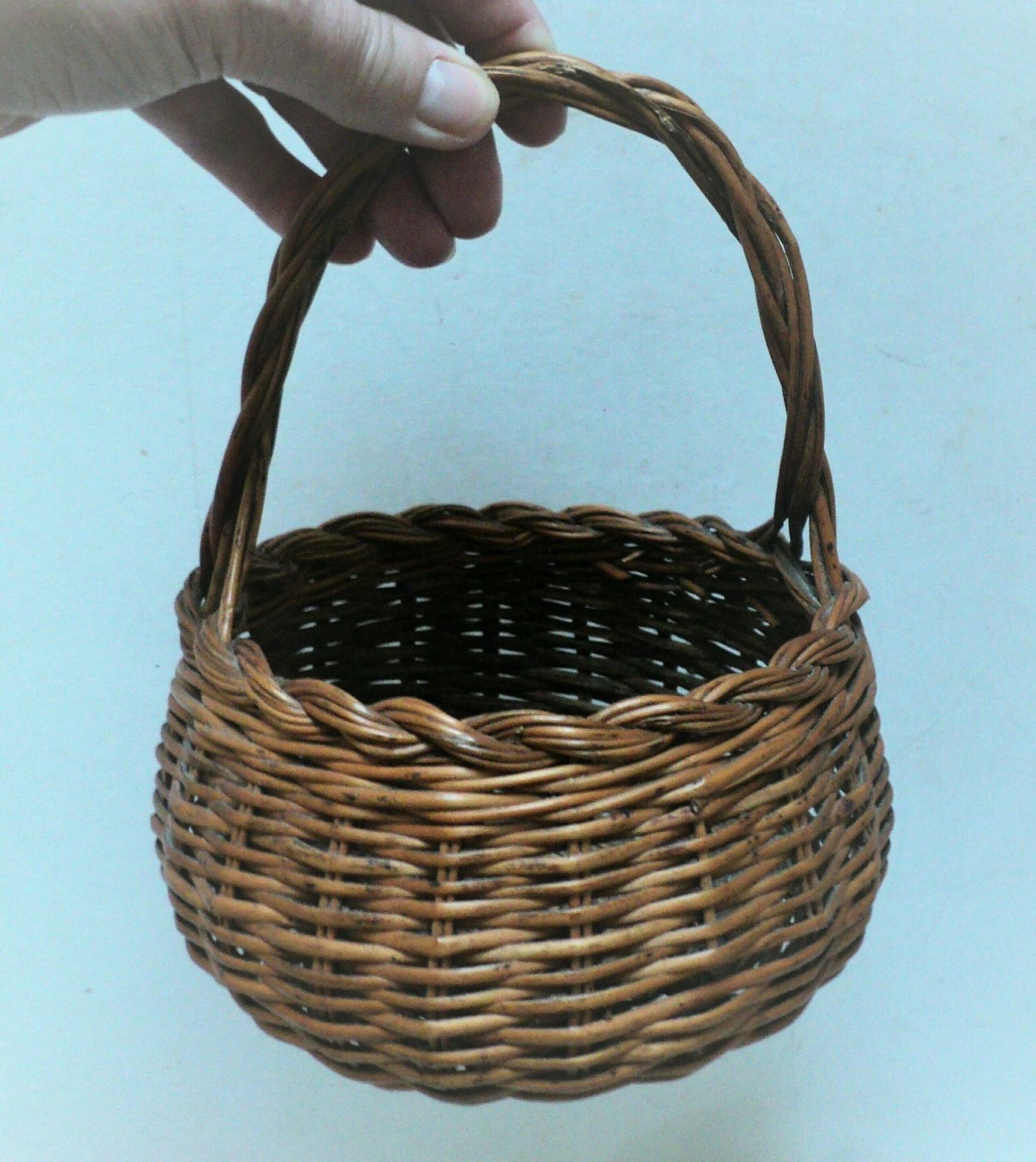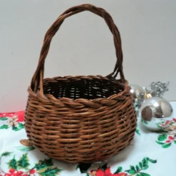 Lovely small vintage French wicker basket with beautiful woven handle and top rim. Lovely round shape. The basket is very practical and could be used for all manner of things, for example collecting eggs, herbs from the garden, small mushrooms, shells from the beach or as a decorative basket in the home to store face cloths, soaps, toiletries, dried flower arrangements, or why not use it for a wedding filled with rose petals to shower on the bride and groom? It would make a pretty wedding basket for a flower girl to carry down the aisle. It is a very practical little basket that could have so many uses. Being light weight, this basket is also perfect for taking your child on their first foraging or Easter egg hunting adventure or to the market.