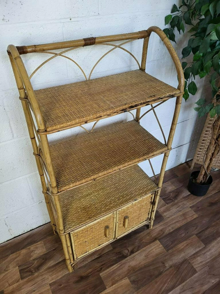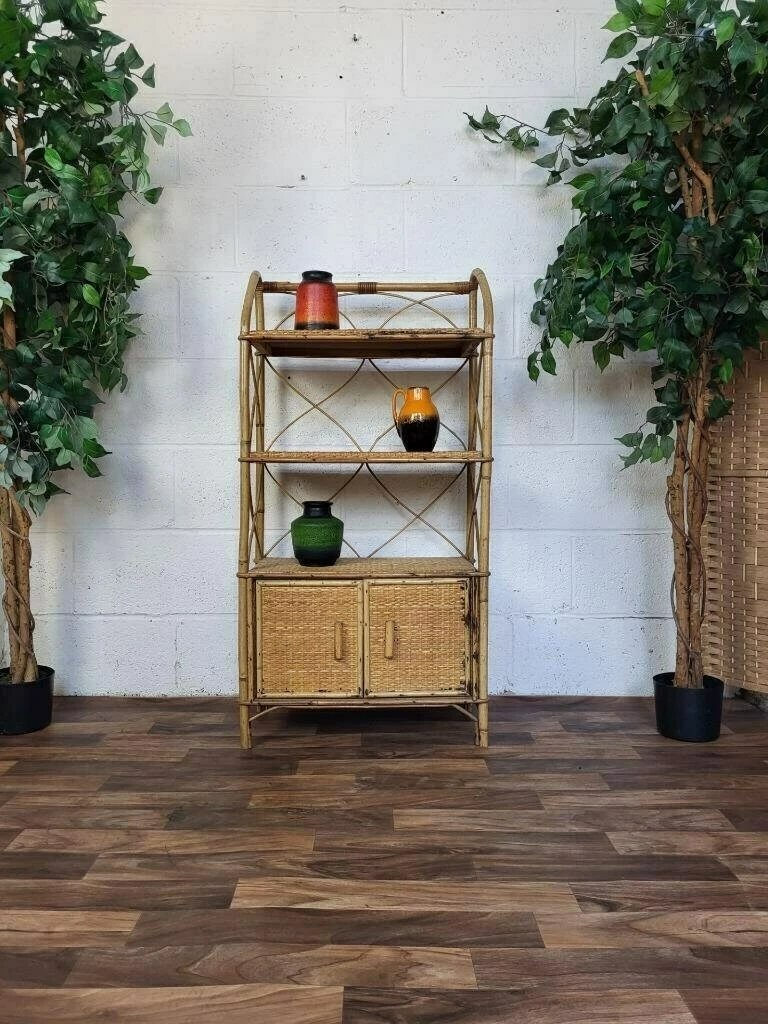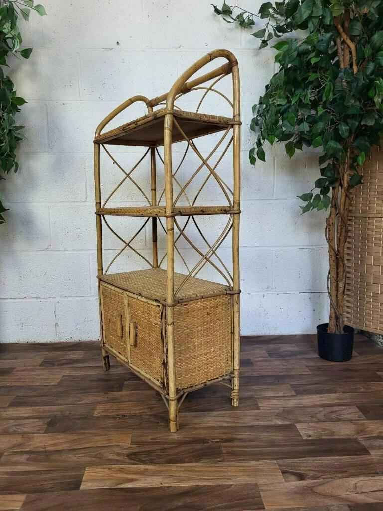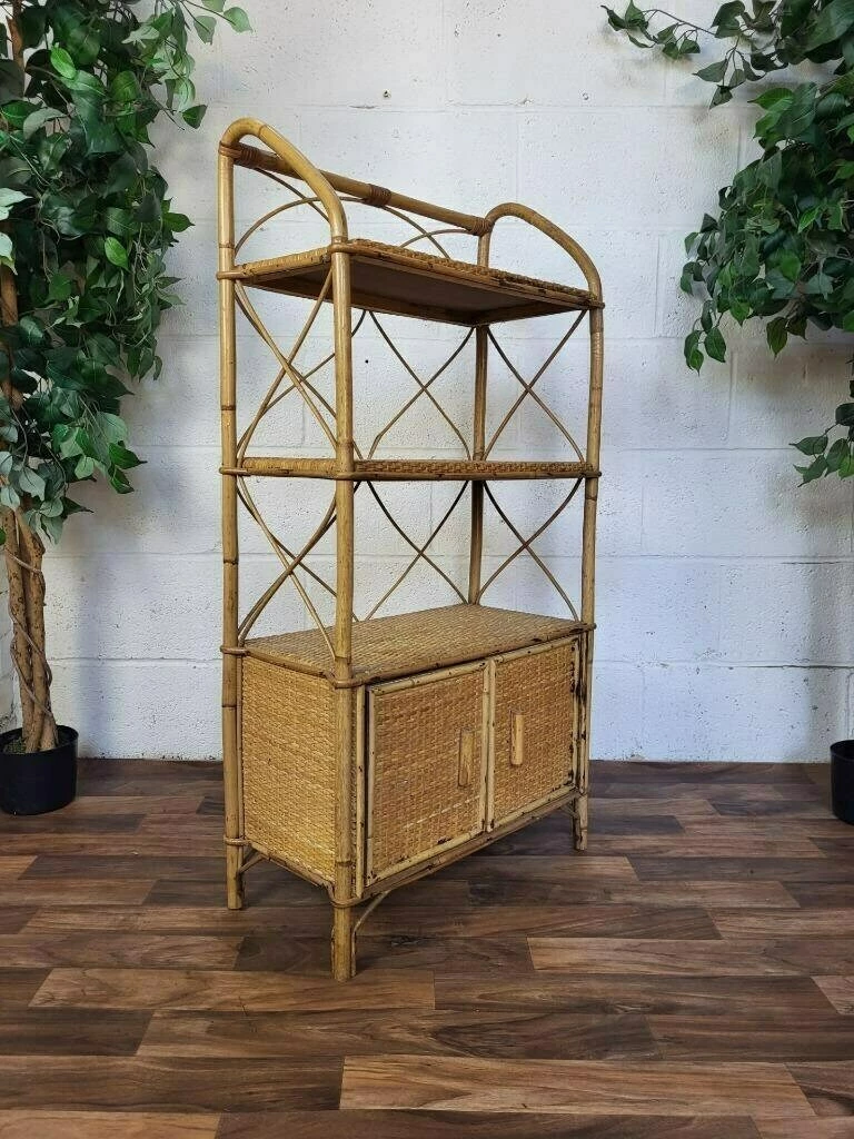 An original vintage mid-century bamboo/wicker bookcase. Lovely design with 2 door cupboard to base and shelving above.
