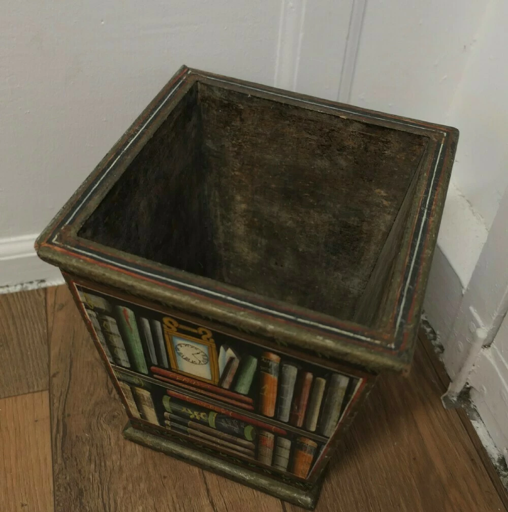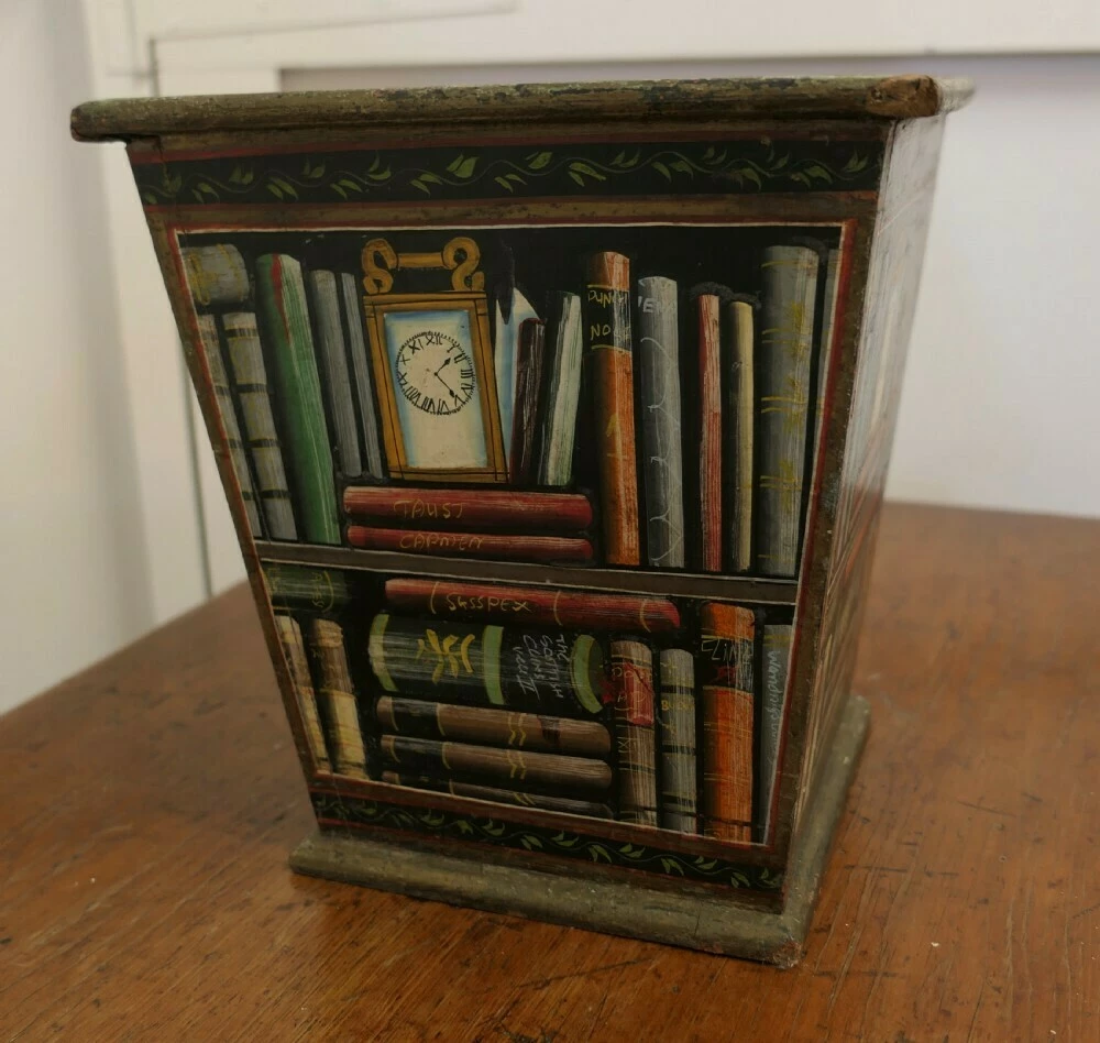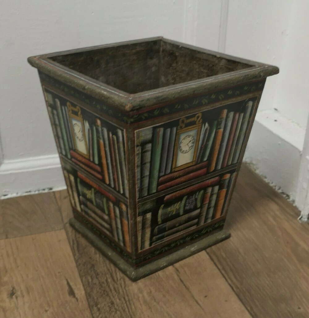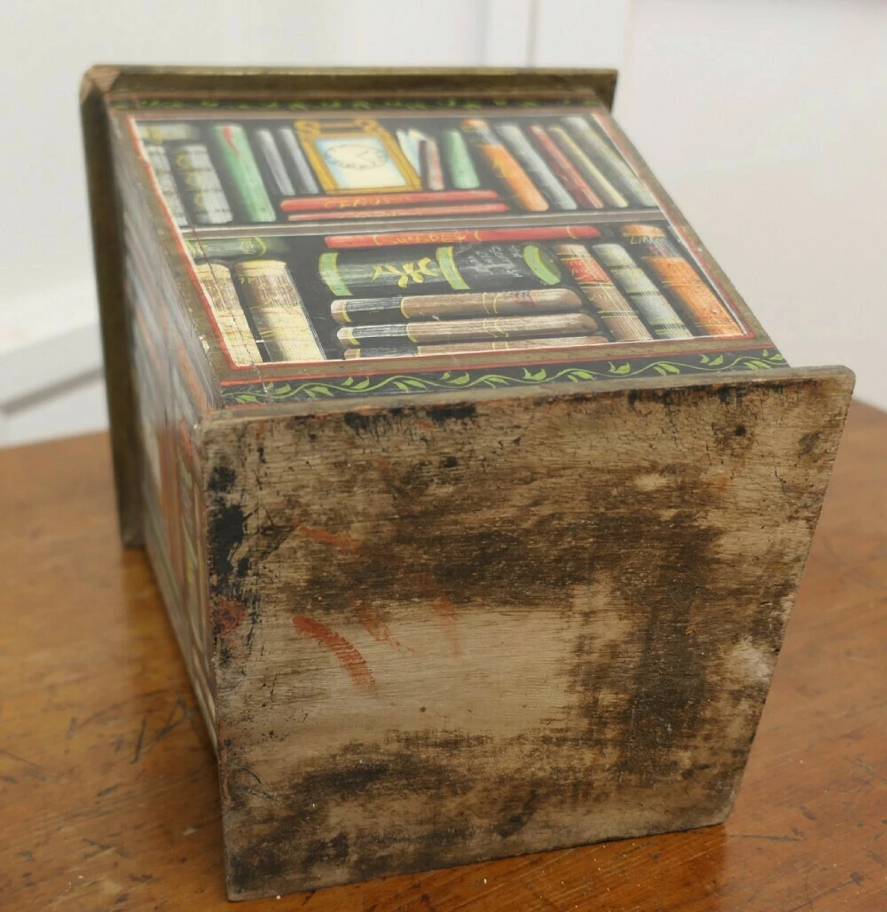 The container is made in wood with pictures of books and shelves on all 4 sides, a fun and a very attractive conversation piece