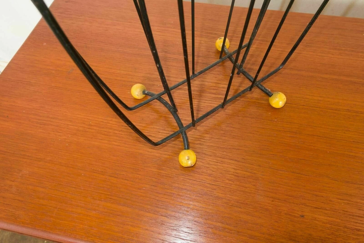 Black metal with yellow plastic ball feet.