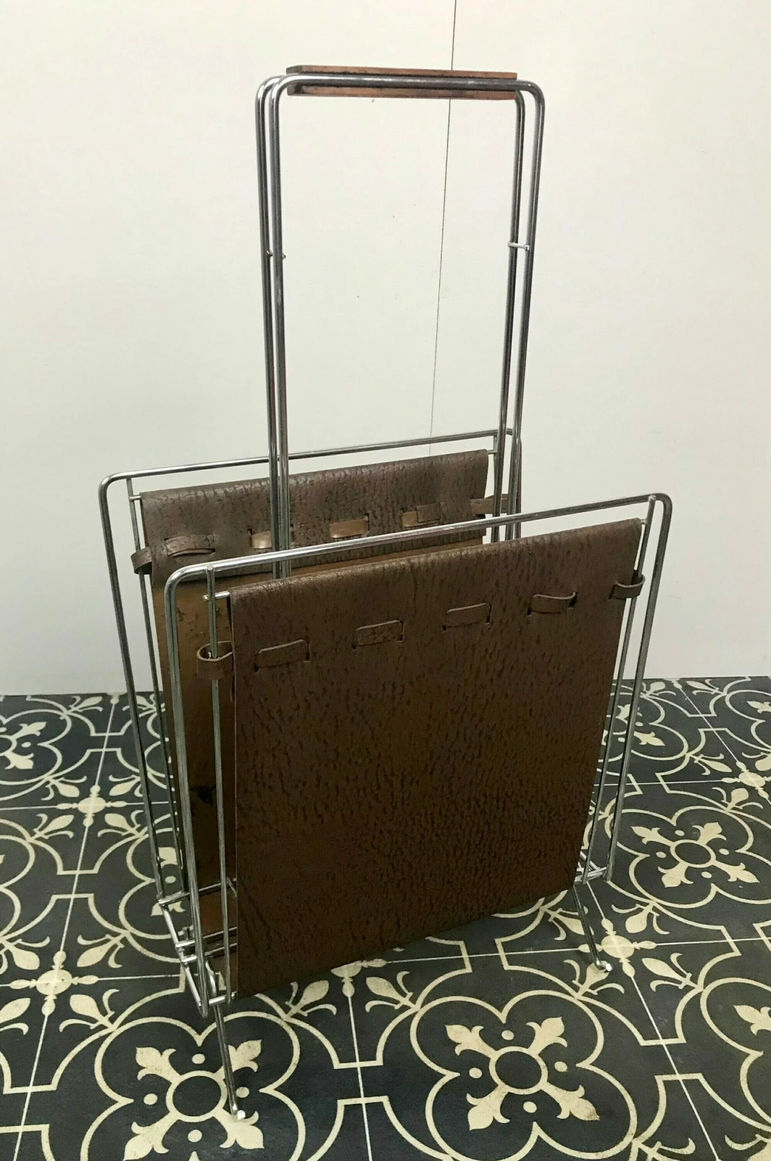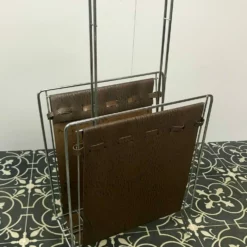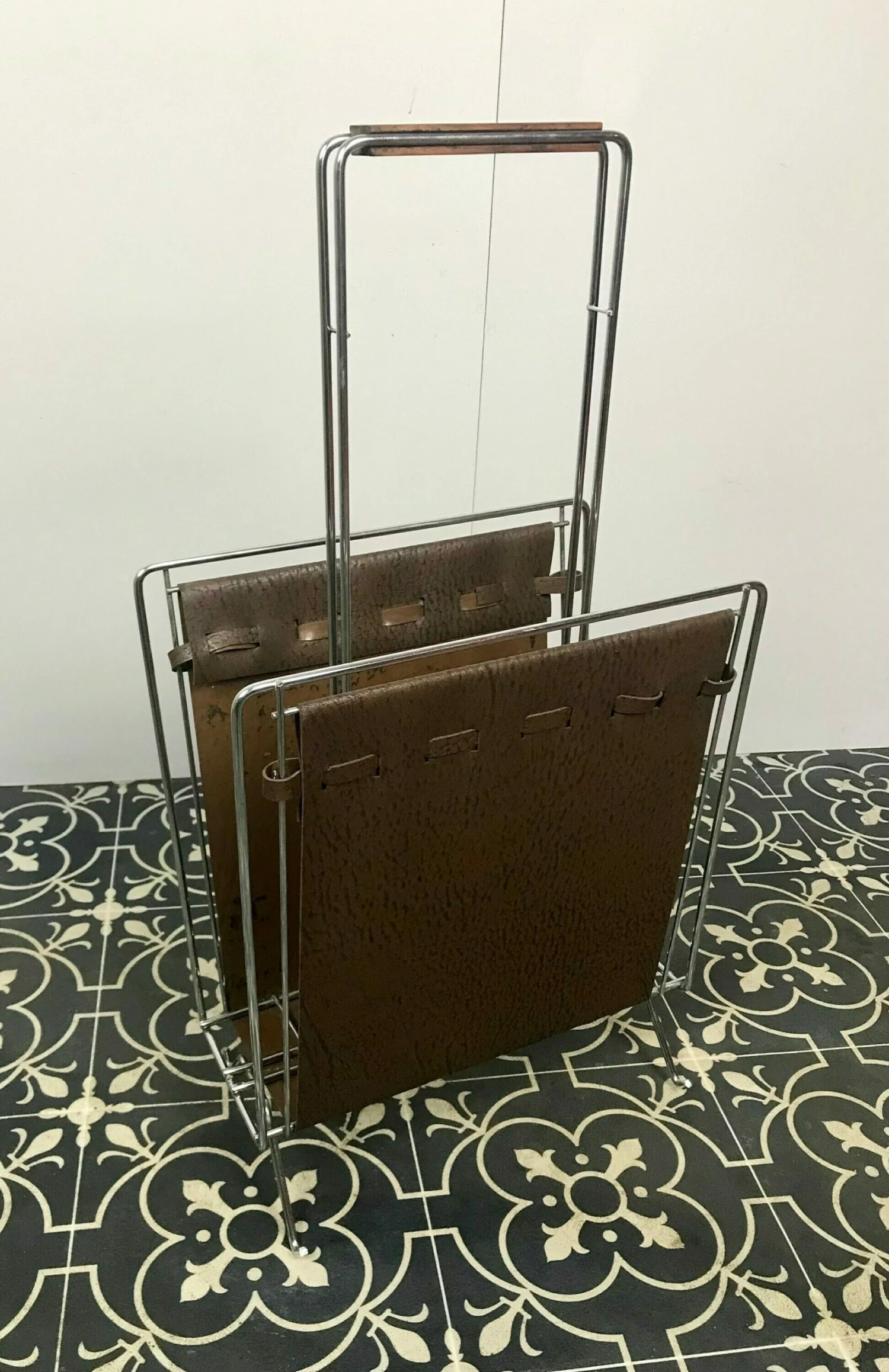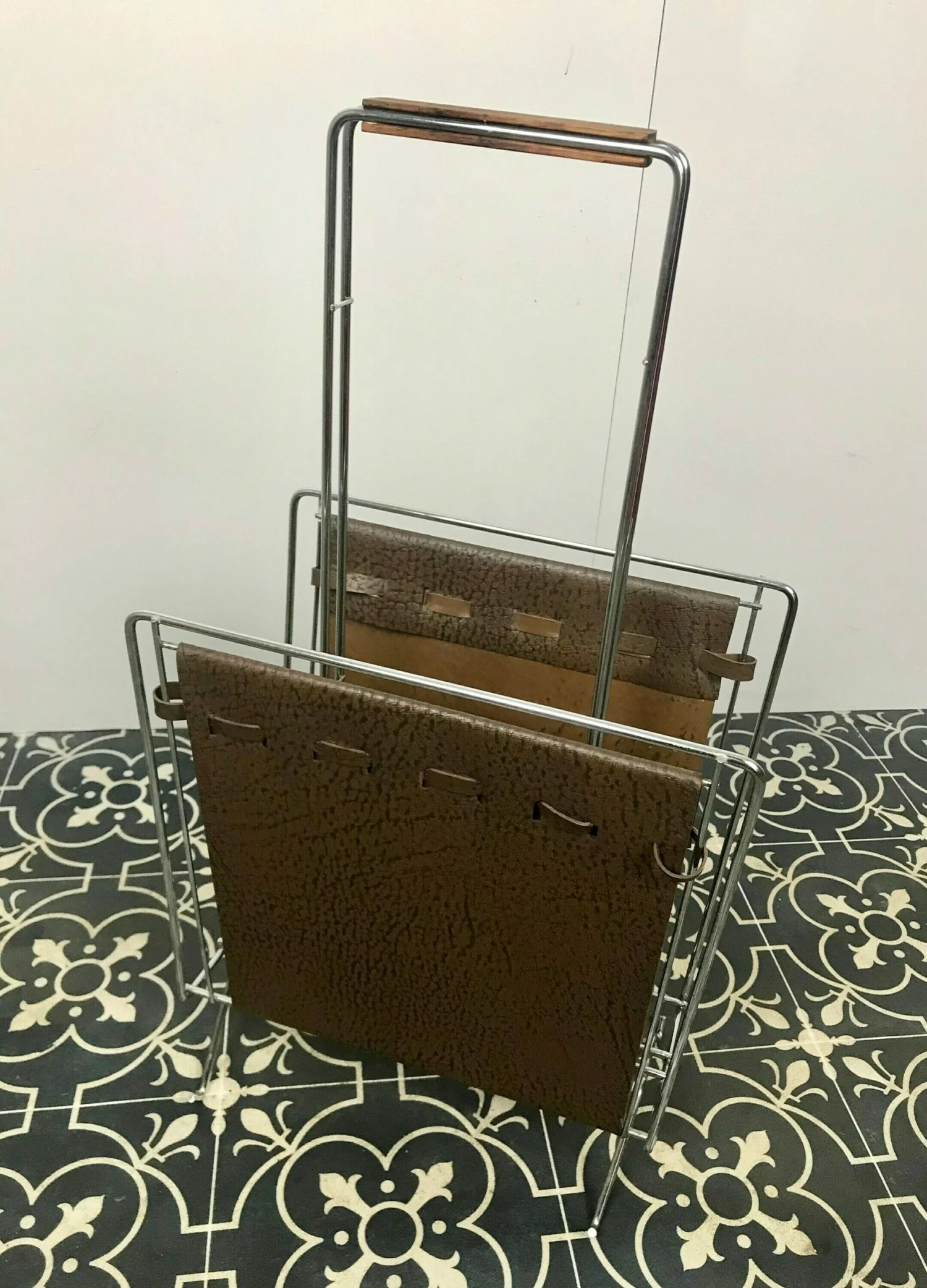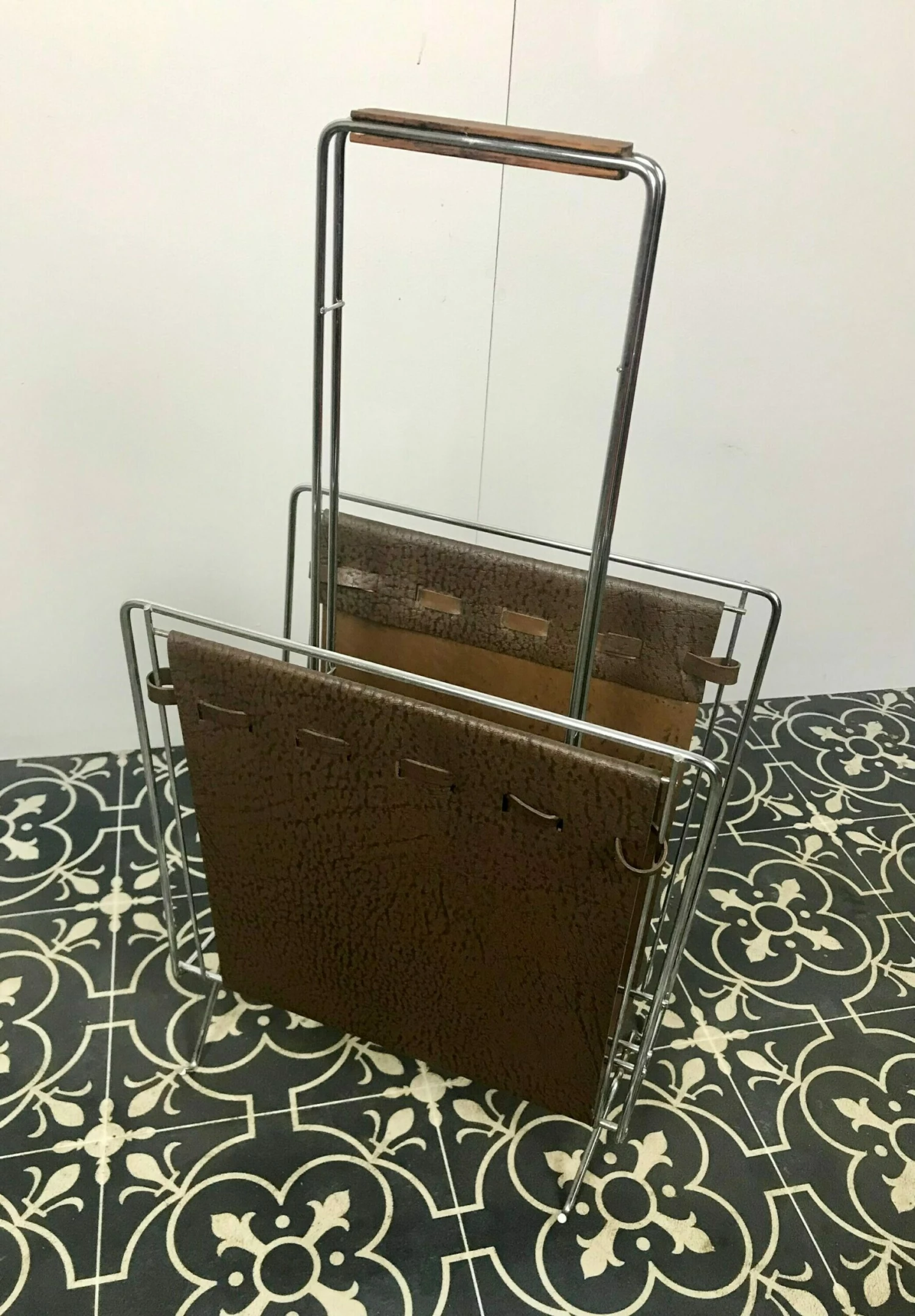 Stunning looking magazine rack a nice vibrant chrome frame with a long reach with a lovely teak handle, featuring a classy chocolate faux leather finish with a stitching across the top.