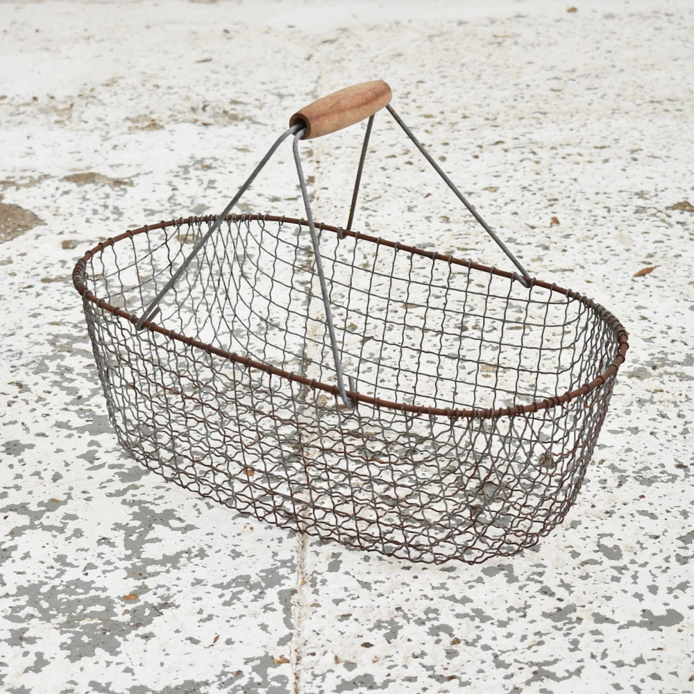 A practical vintage wire garden basket constructed from galvanised wire mesh with wire handle supports and a wooden handle.