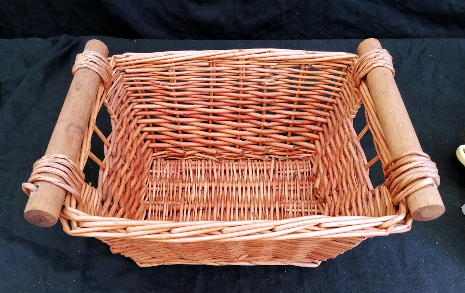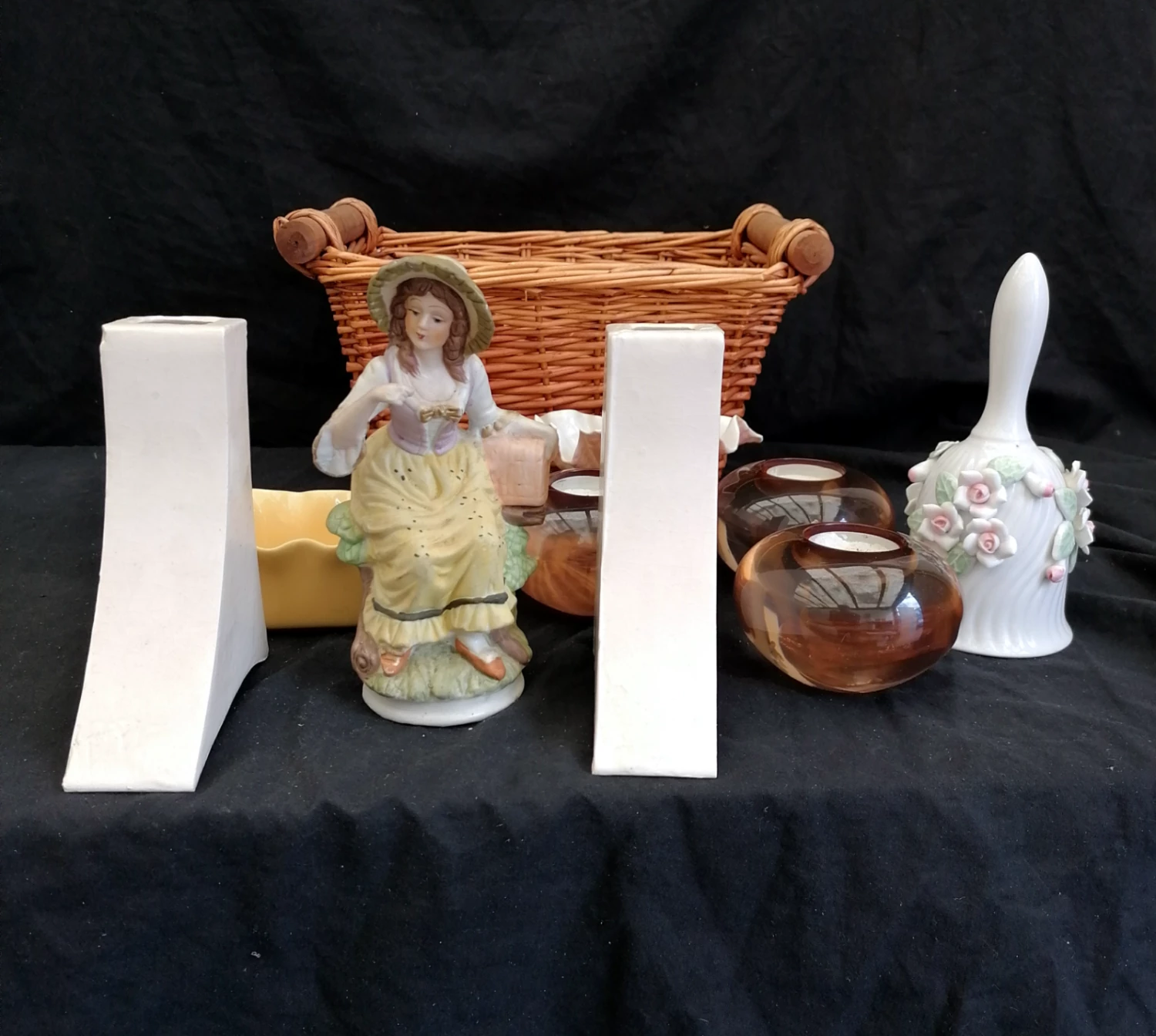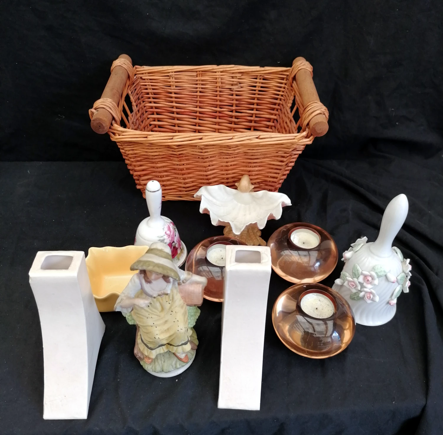 Wicker Basket containing 2 x single stem vases ,3 x candle holders,2 x decorative hand bells, 1 x lady figurine,1 x decorative shell and one decorative tray. Please see various pictures on our site.
