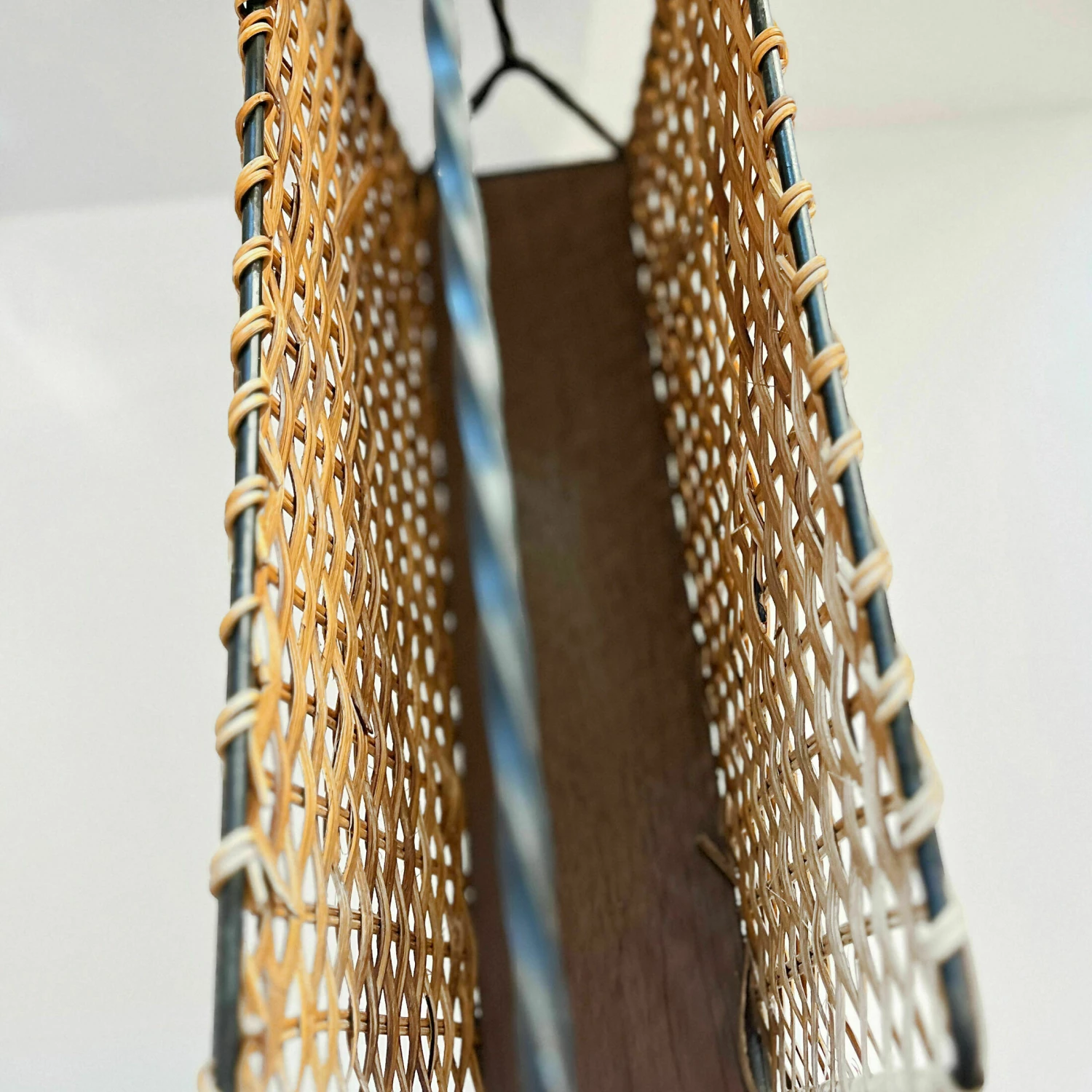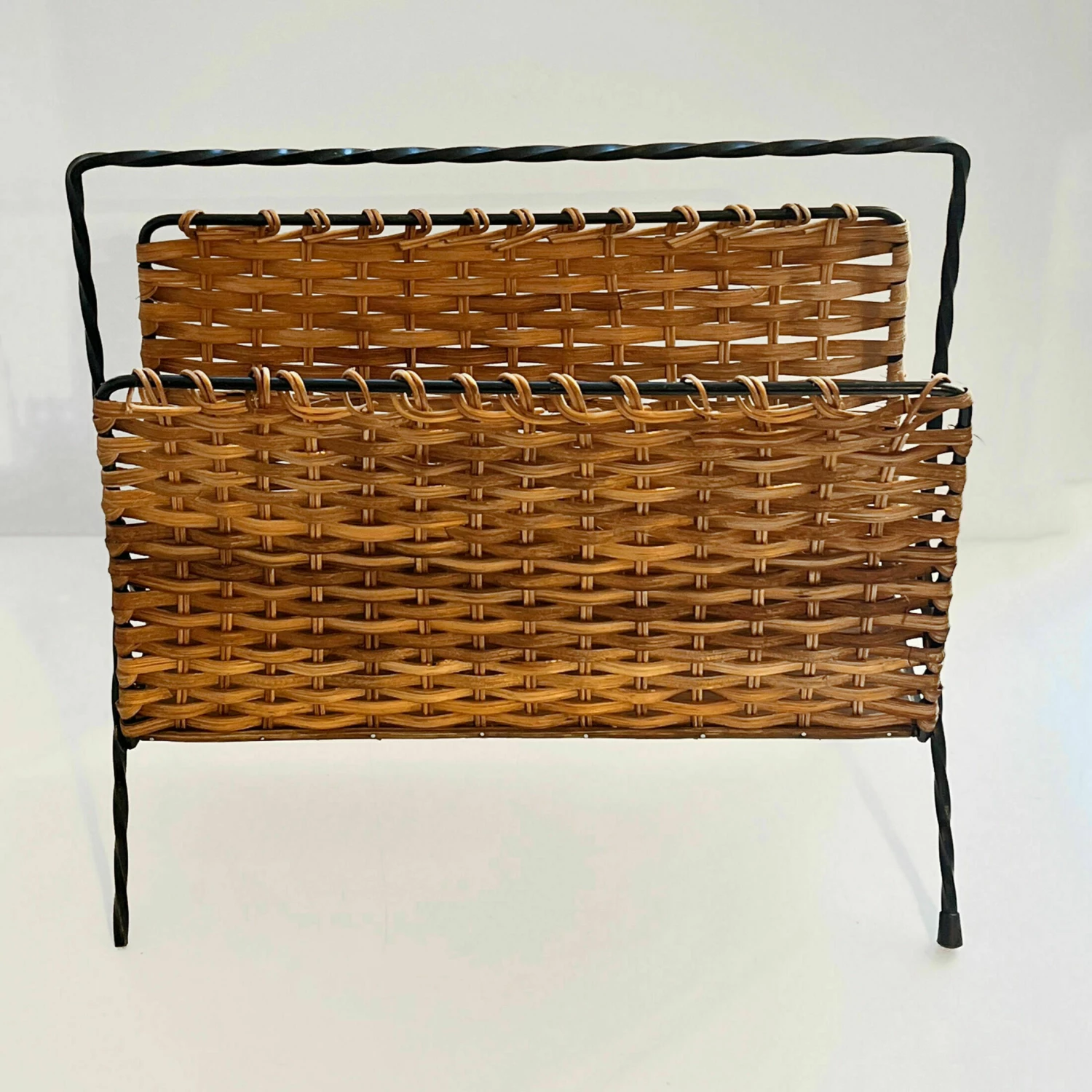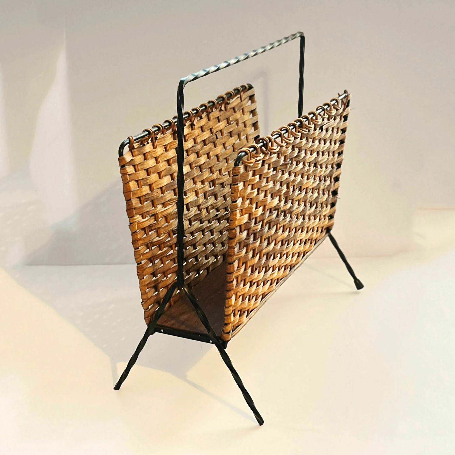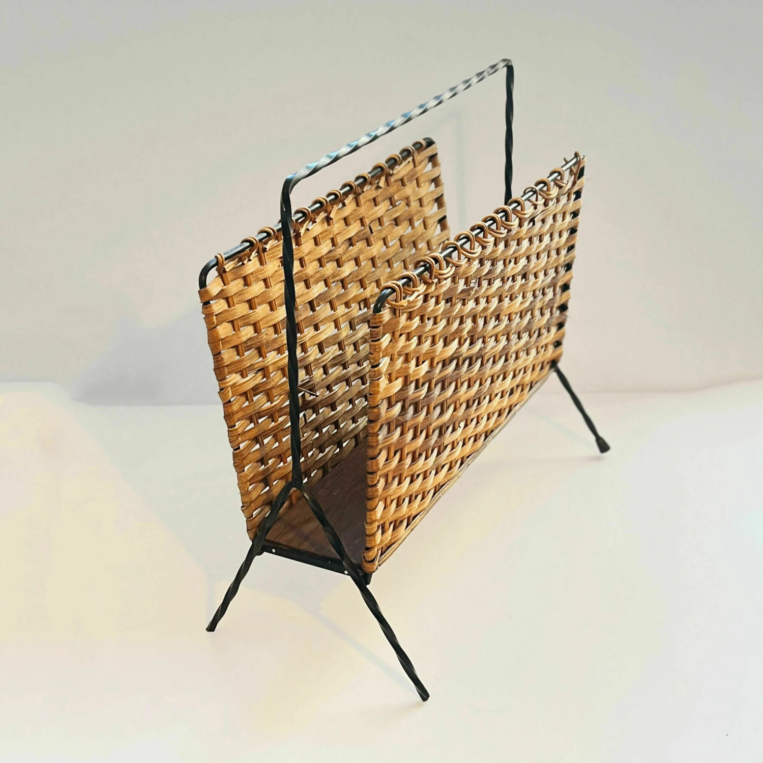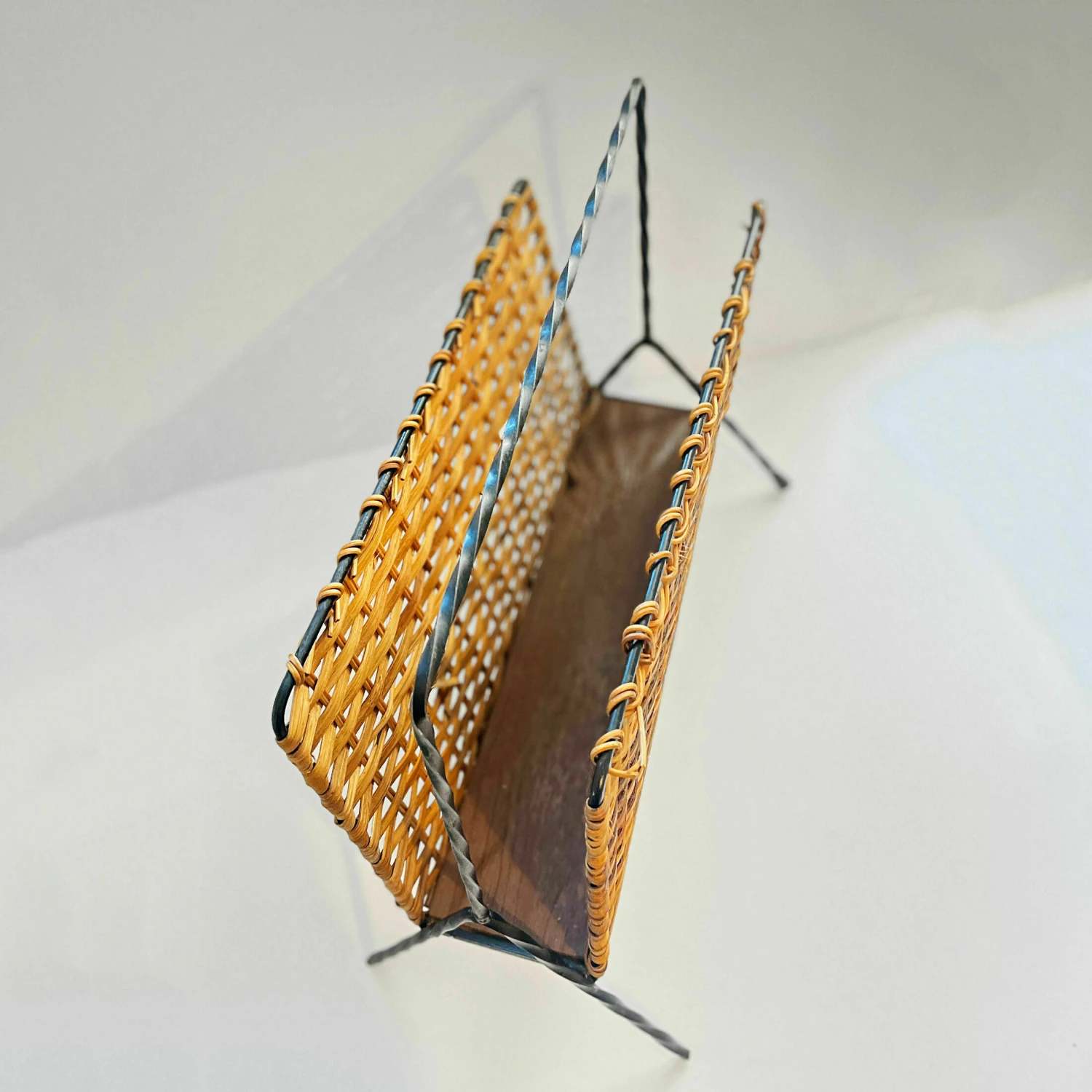 Newspaper holder in the style of scandinavian modernism, produced in denmark in the 1970s. Newspaper holder made of metalwork, wicker walls, and the base is made of beech board.