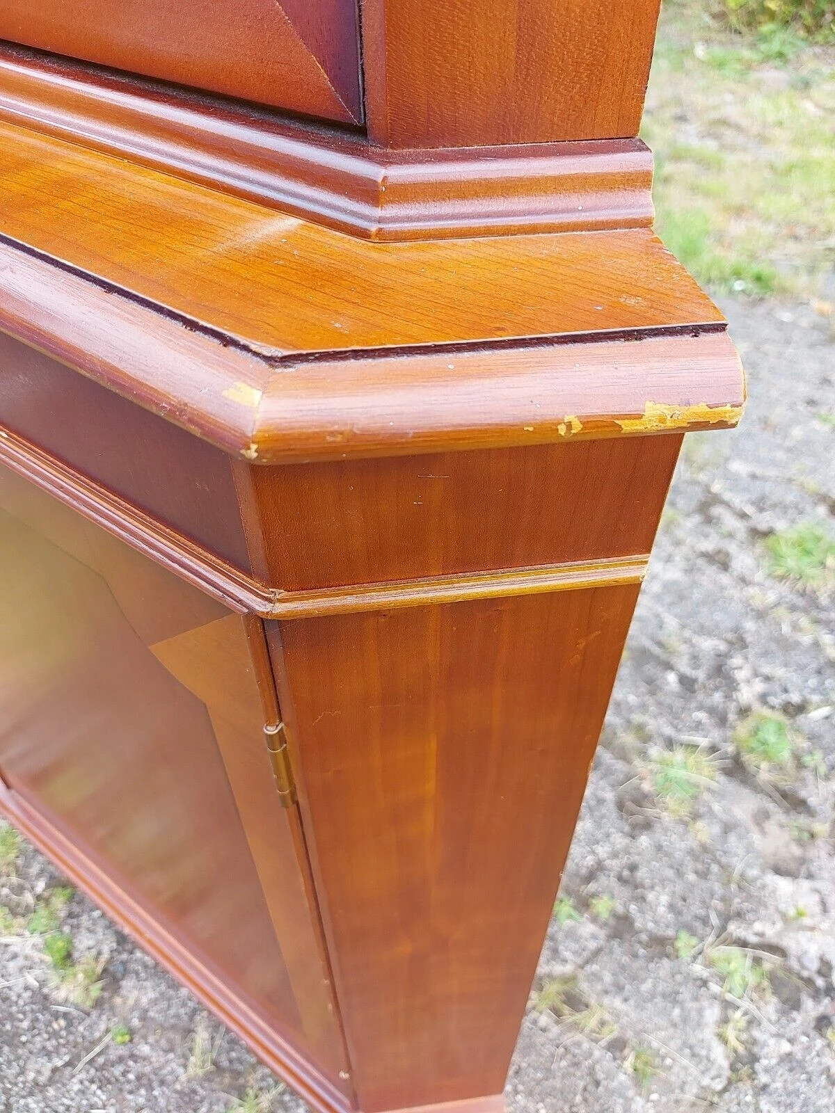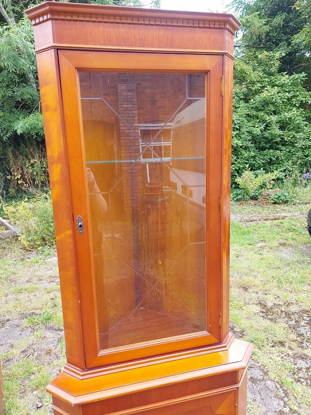 YEW WOOD VENEER FLOOR CORNER DISPLAY CABINET. GLAZED DOOR..