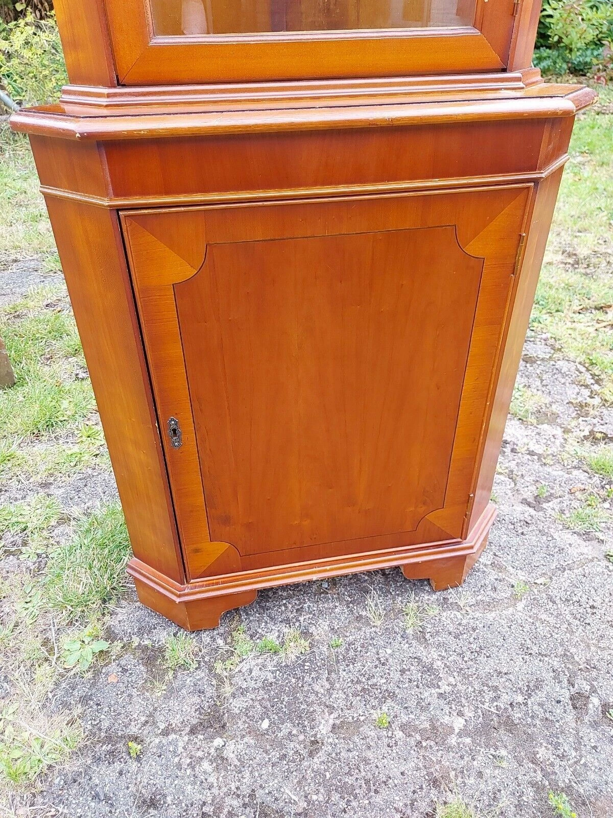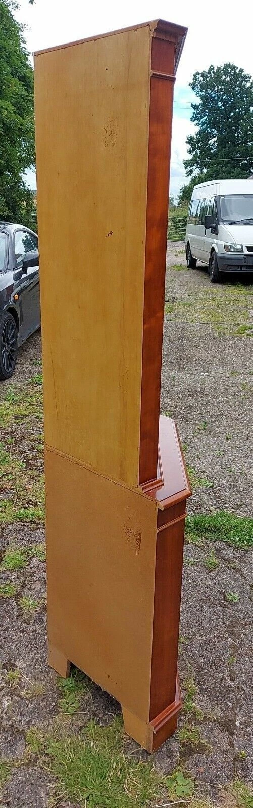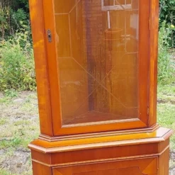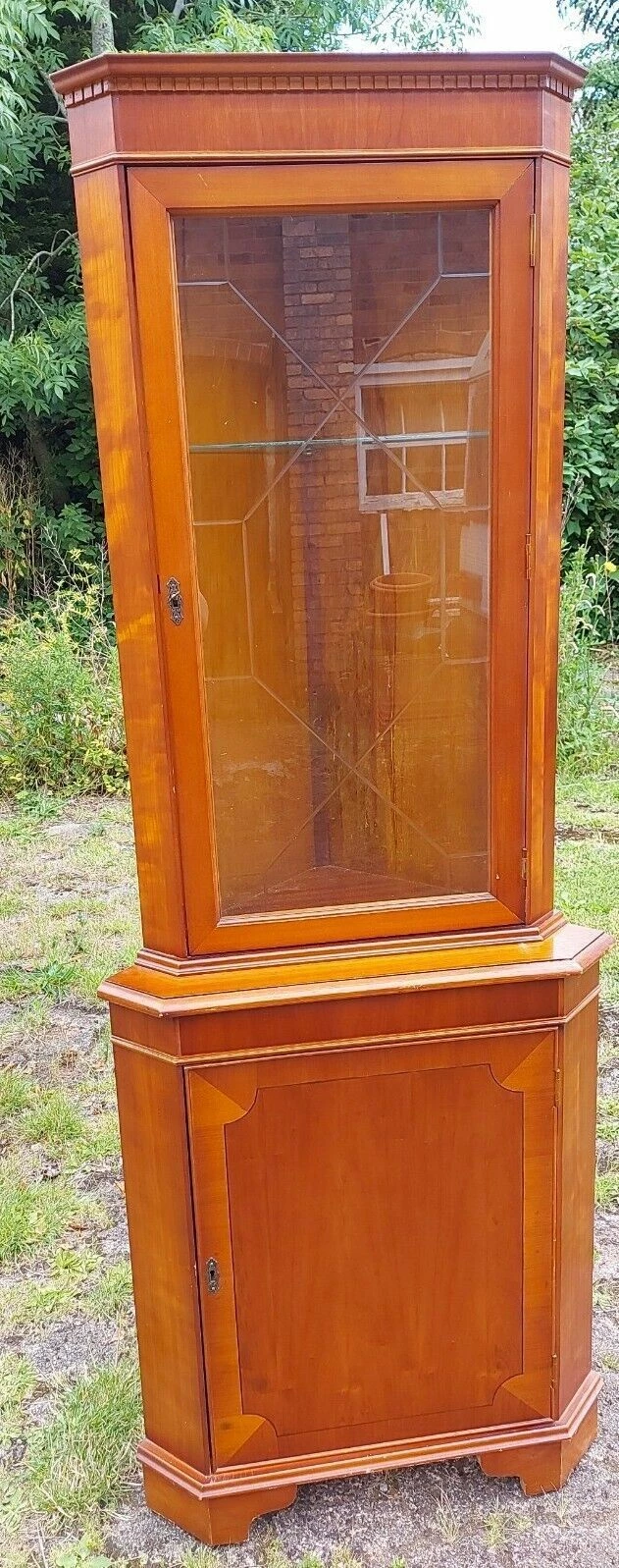 This is a Yew wood veneer Floor Standing Corner Display Cabinet.