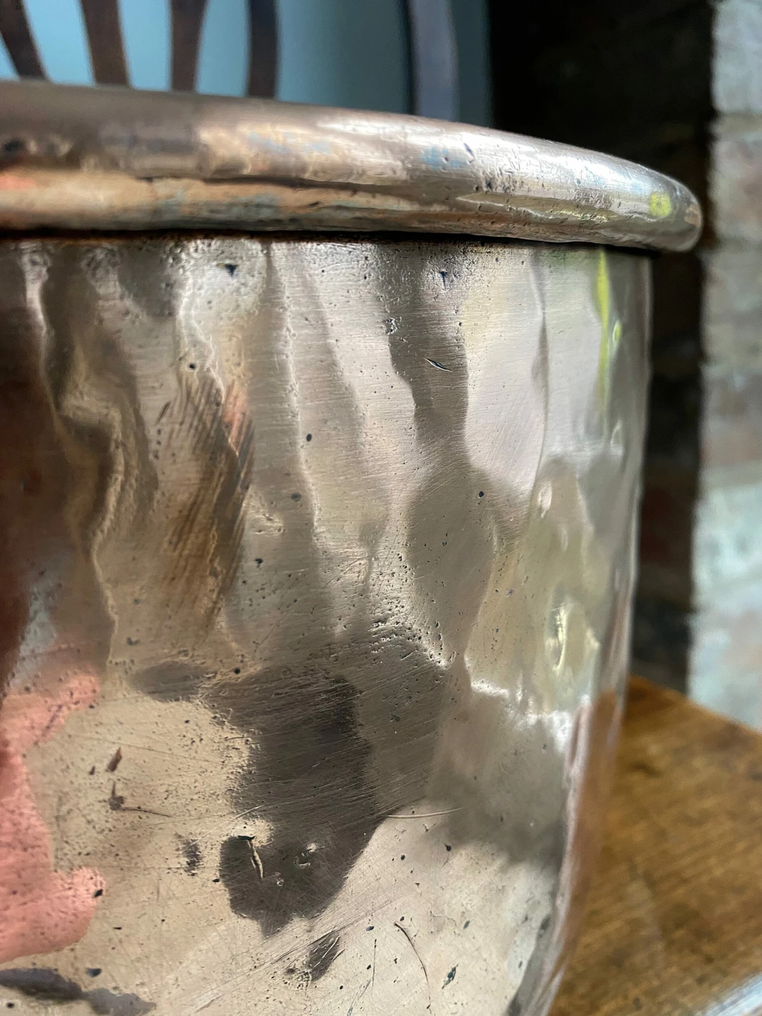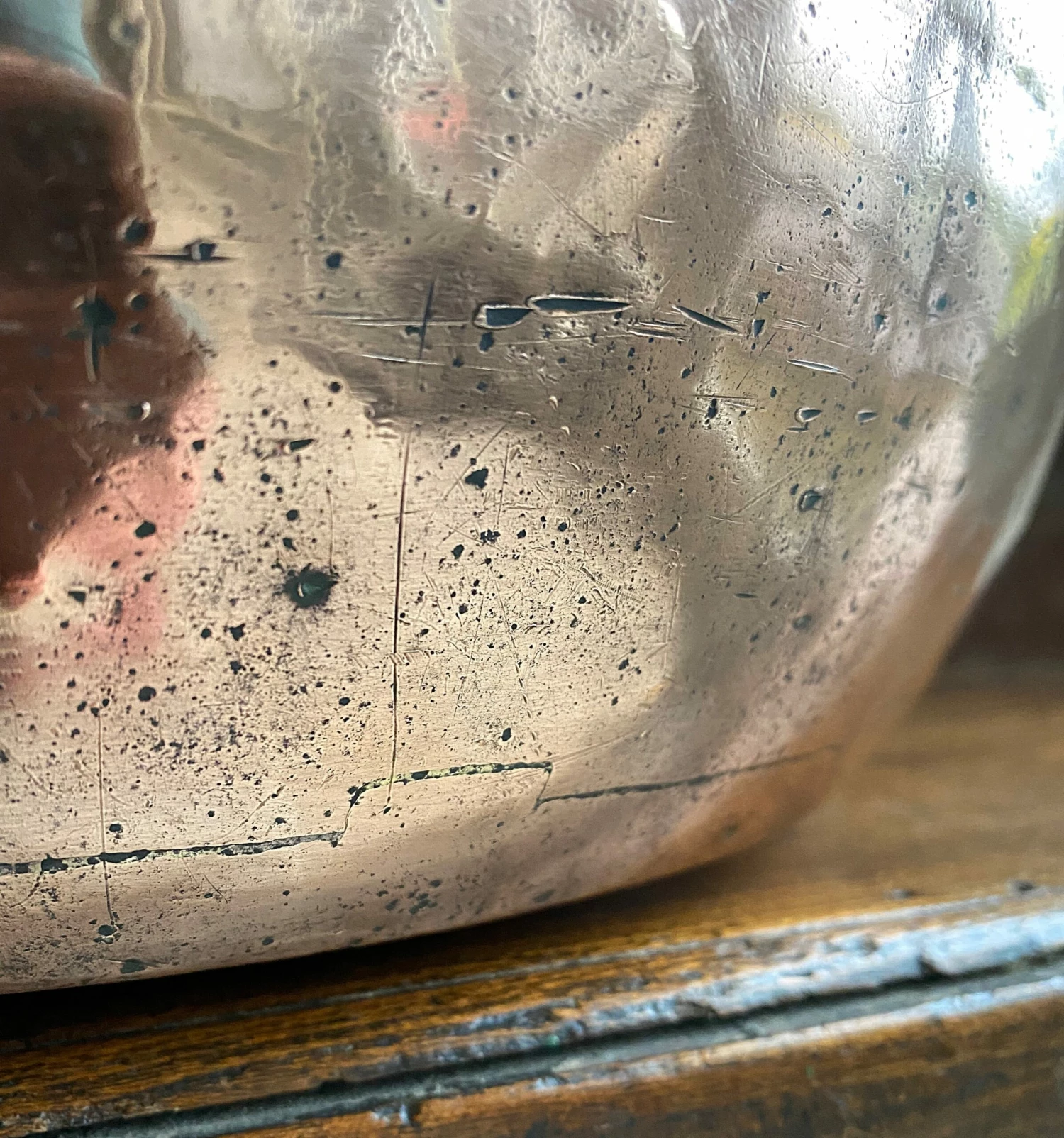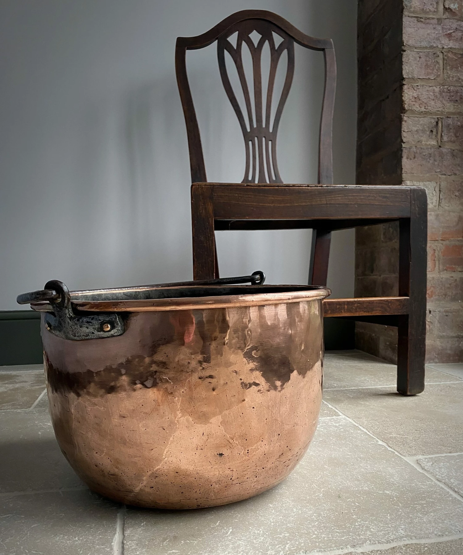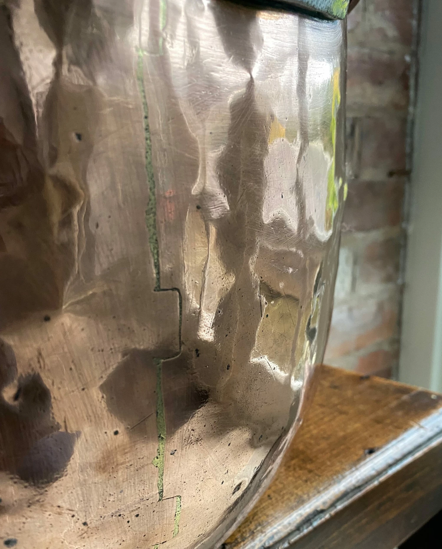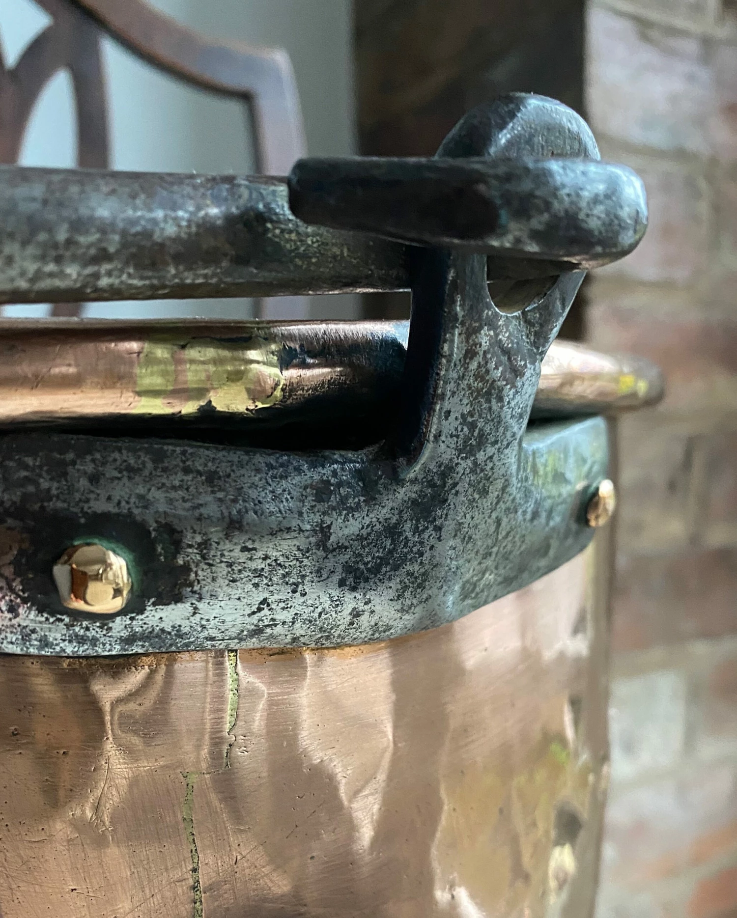 Iron handle and bracket with the body being of copper. Still to be seen is the craftsmanship of the items construction. To the seam of the body and where the base is attached can be seen the interlocking, toothed joints.