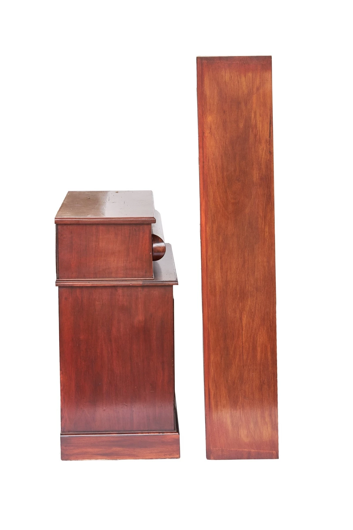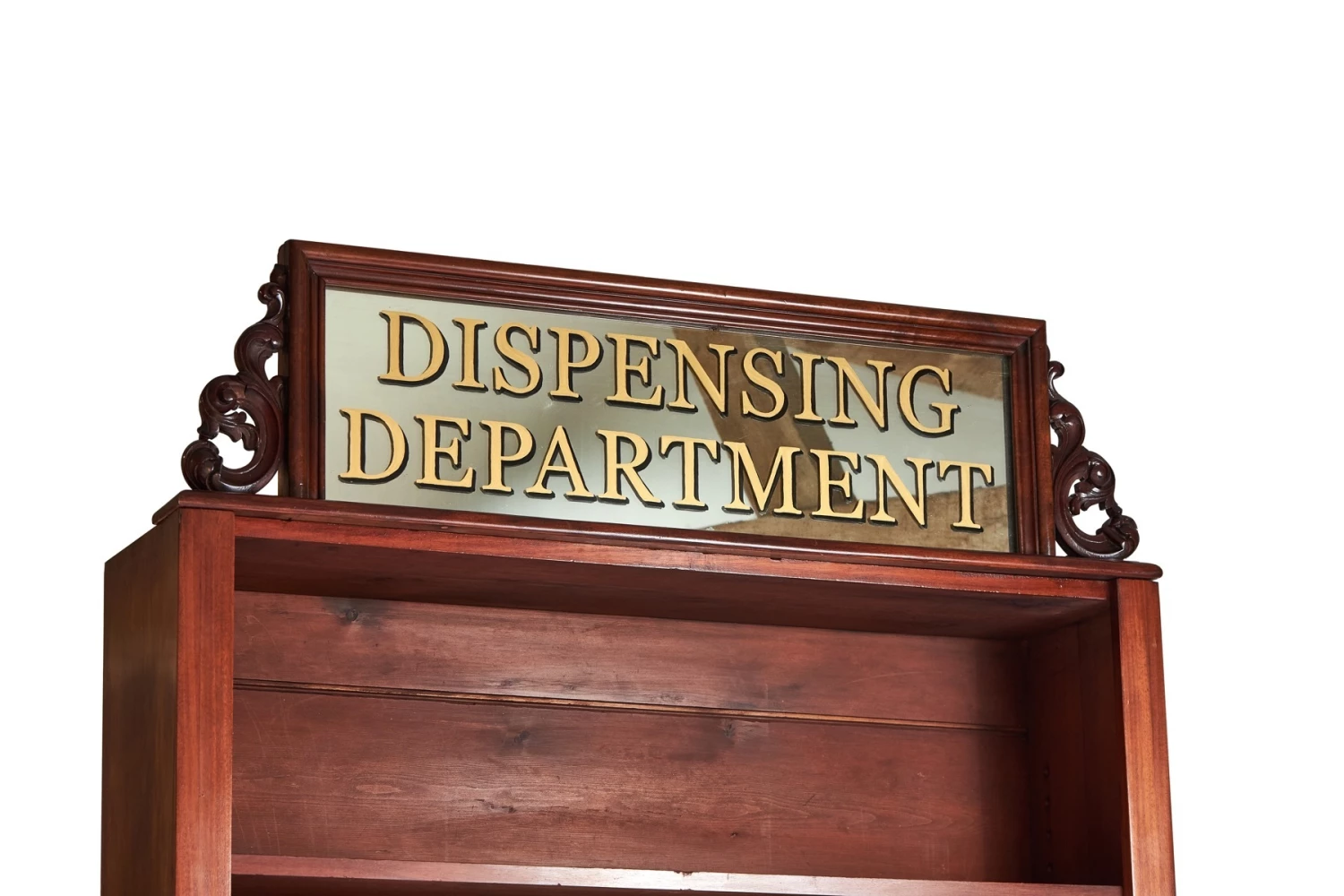 Mahogany Framed glass& Mirrored Pediment, Reads: DISPENSING DEPARTMENT , With Gold Lettering behind the glass, with pair Carved scroll supports each side,