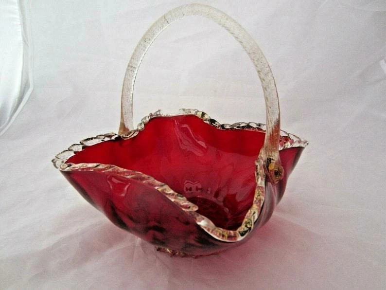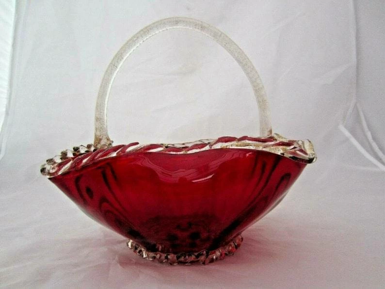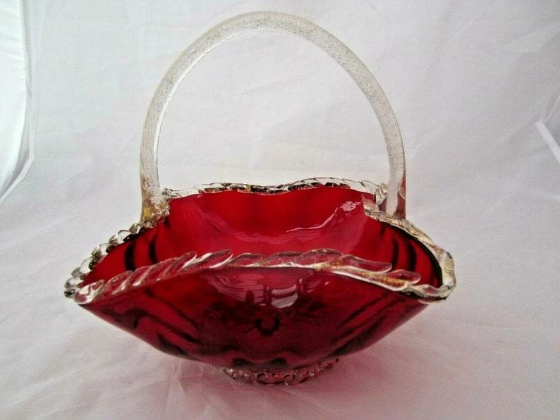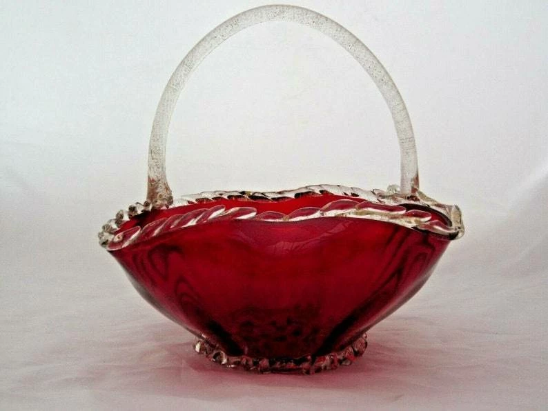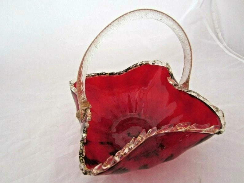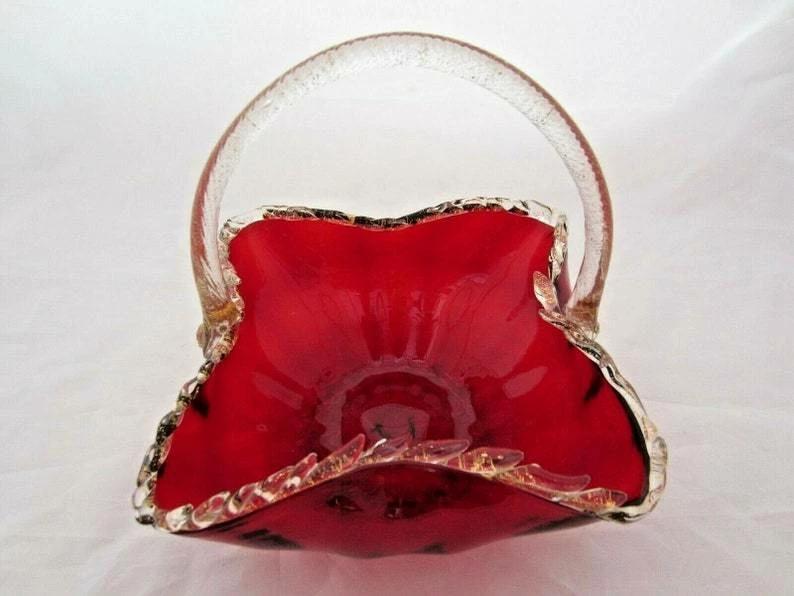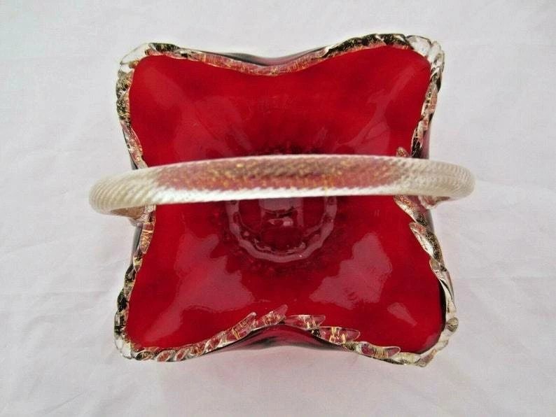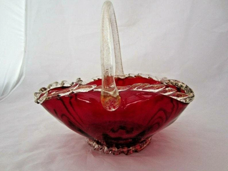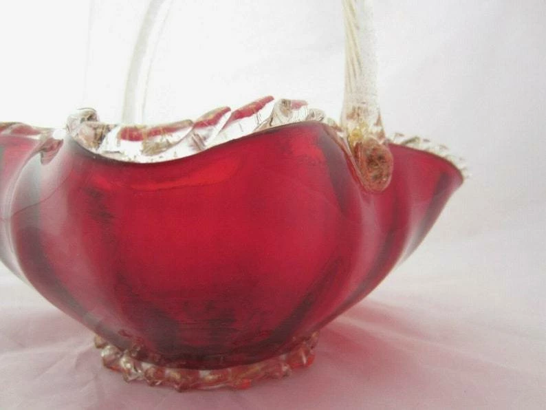Vintage Mid Century Deep Ruby Red Murano Basket Bowl with Gold Aventurine Rigaree, dated to around the 1950/60s The basket has an applied handle with applied rigaree on the base and the rim encasing 24k gold adventurine (flaked gold) The bowl has a ribbed effect and the handle has an exquisite twist.