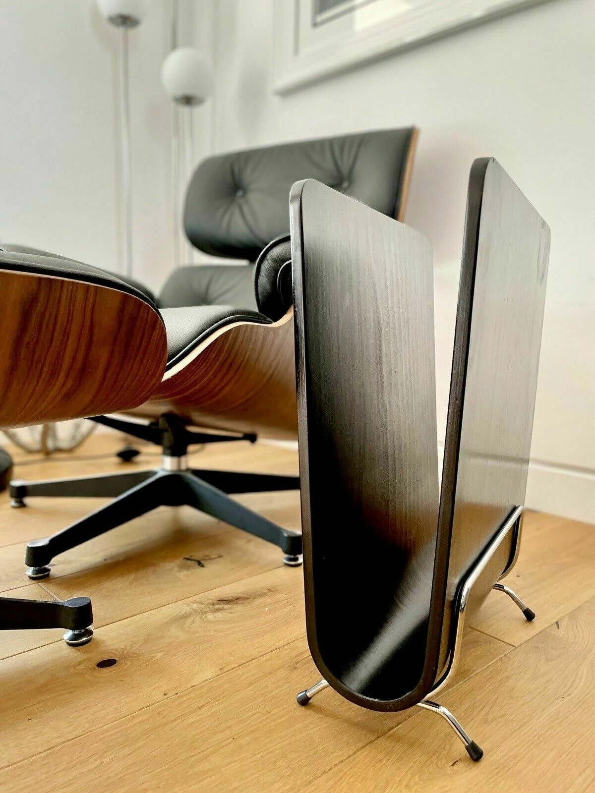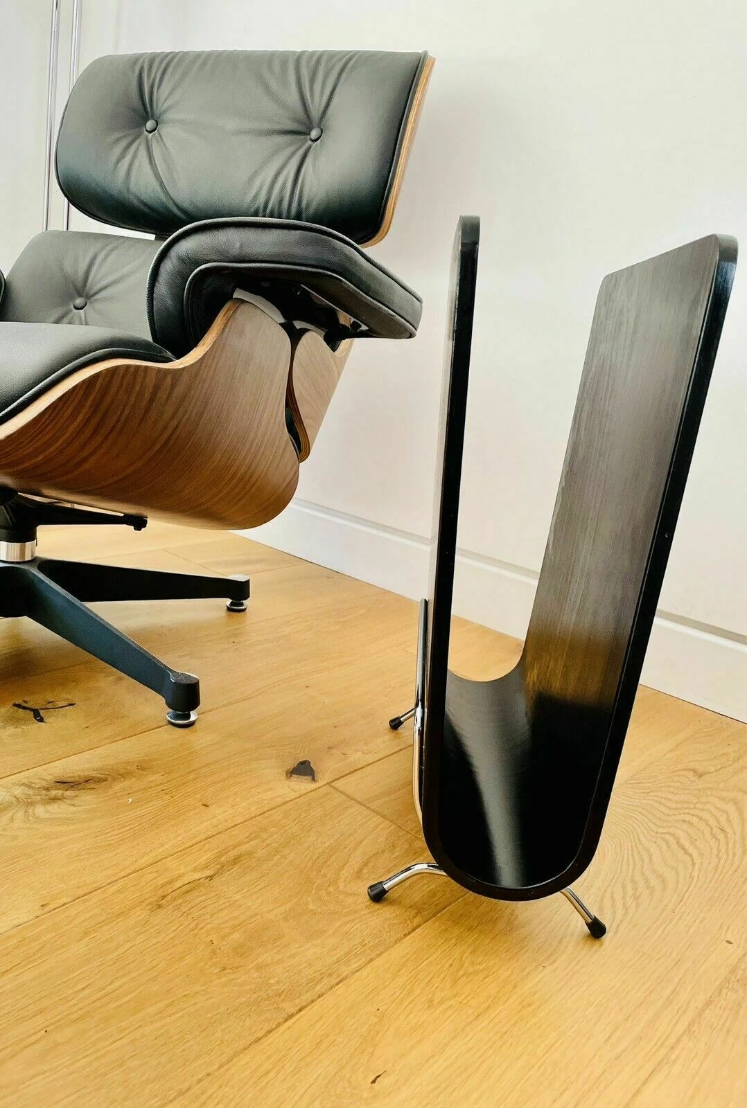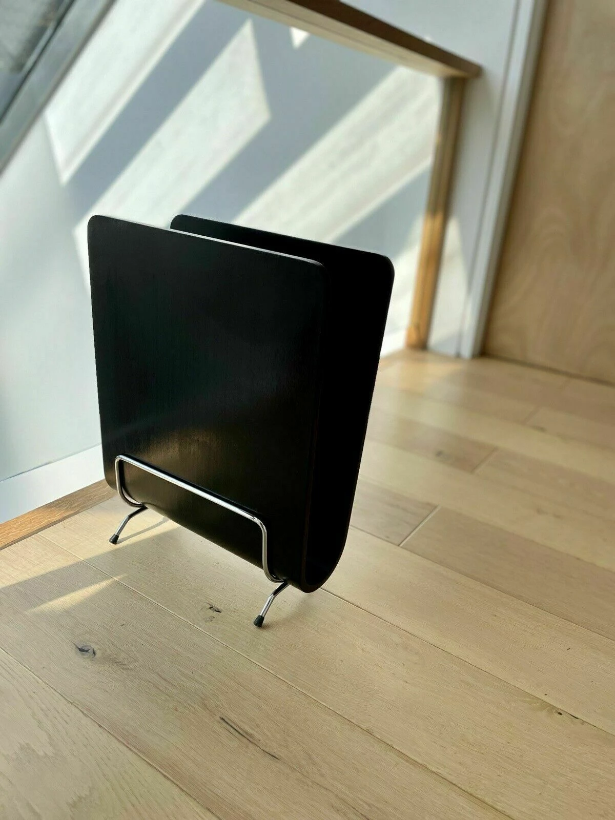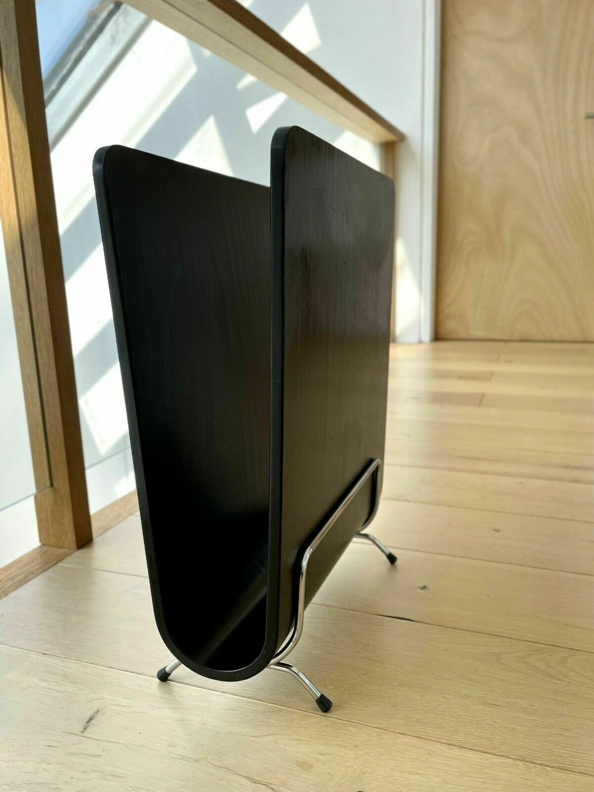 The perfect piece for holding your magazines and newspapers, this magazine rack has a modern look that will fit right in with contemporary living room furniture. Made from Bent Plywood and supported by a metal base.