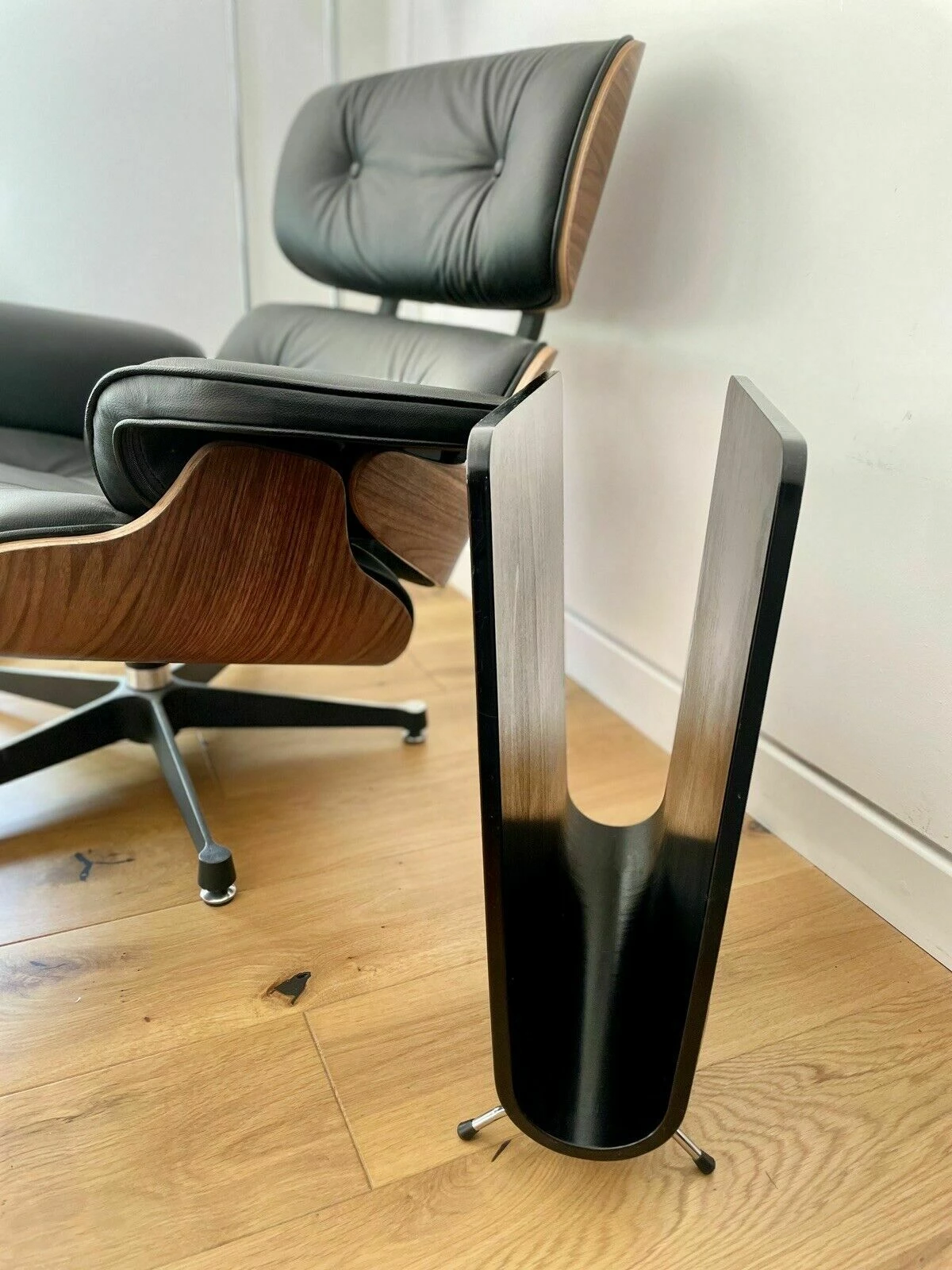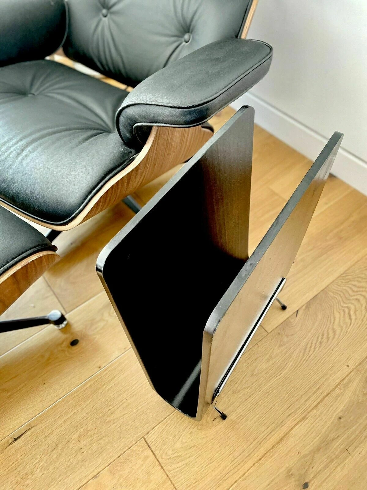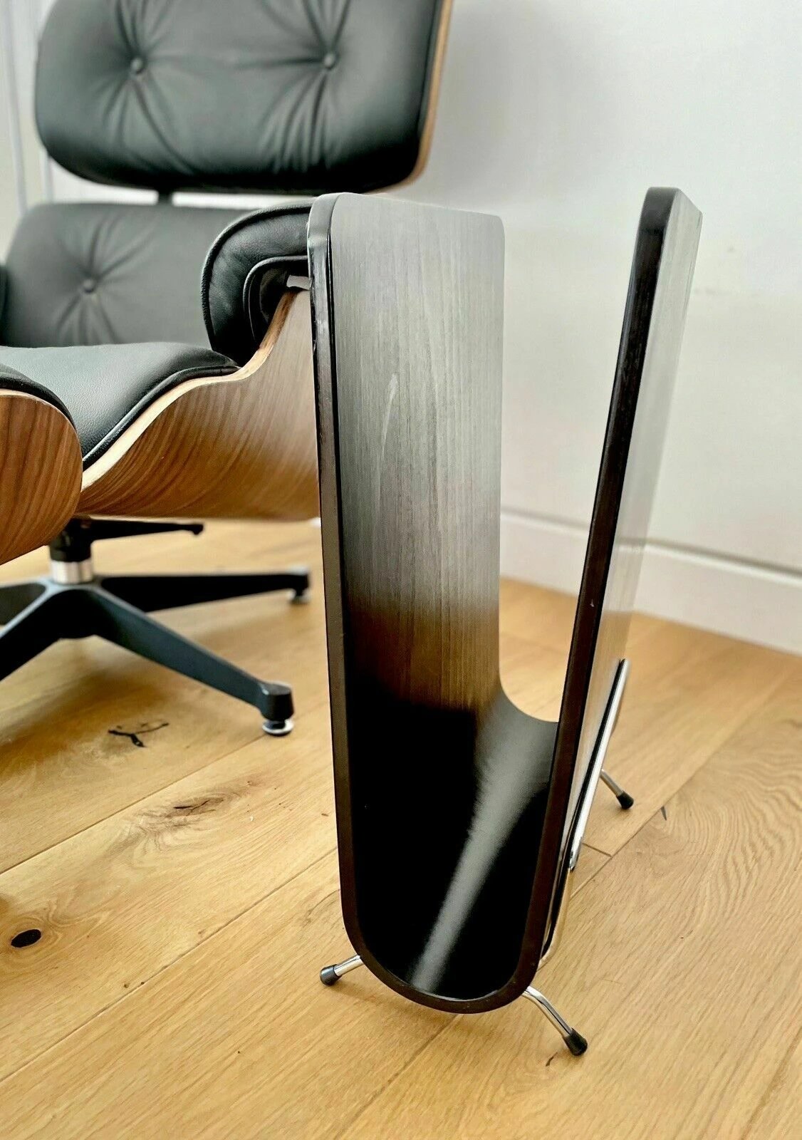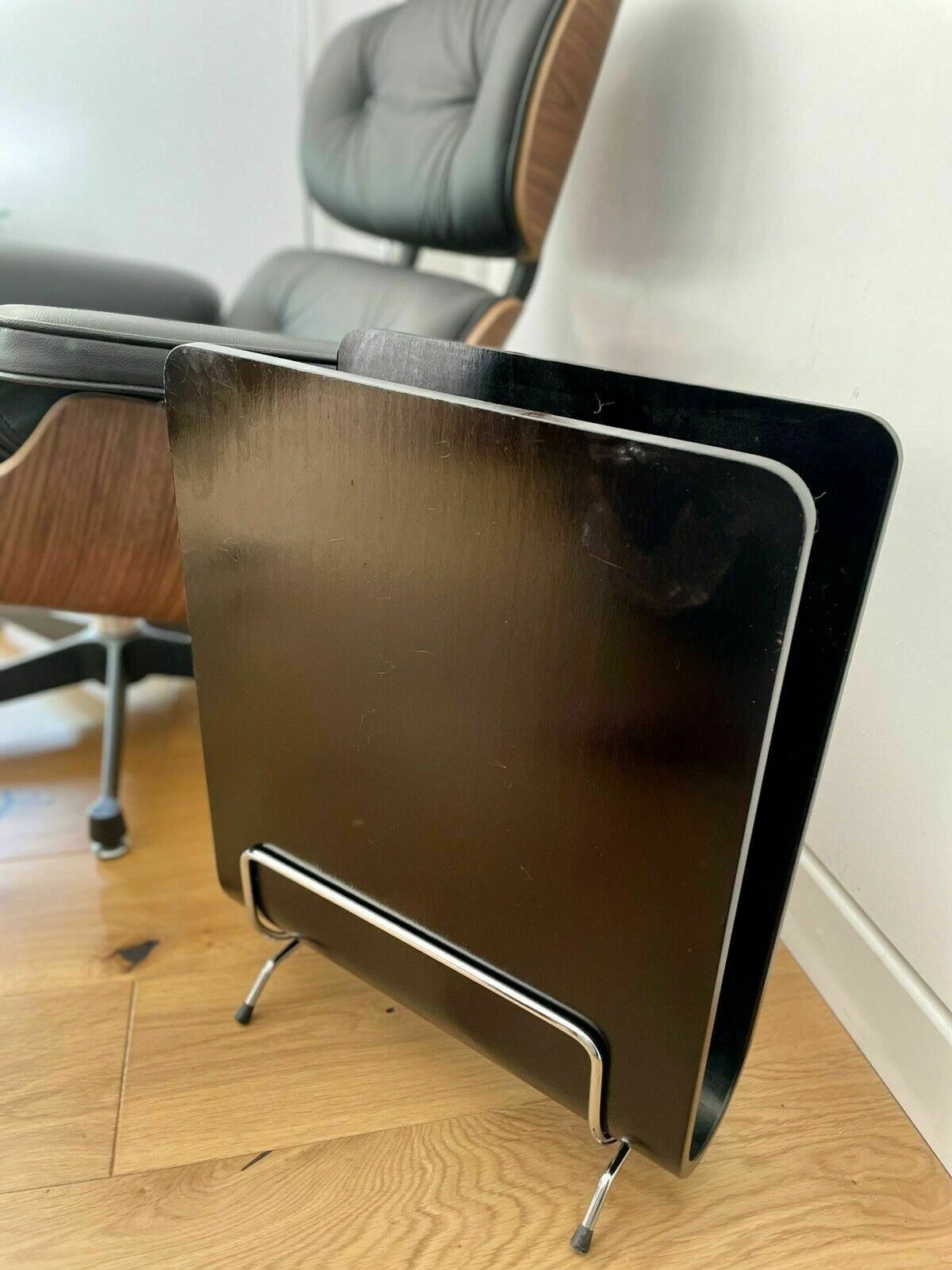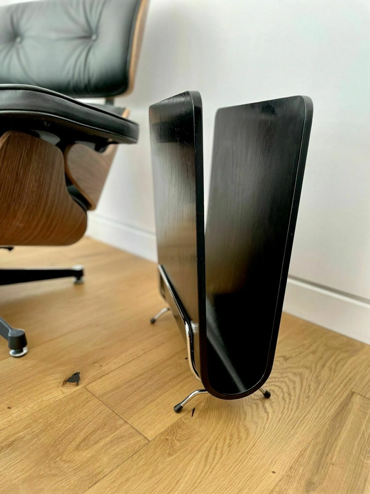 The perfect piece for holding your magazines and newspapers, this magazine rack has a modern look that will fit right in with contemporary living room furniture. Made from Bent Plywood and supported by a metal base.