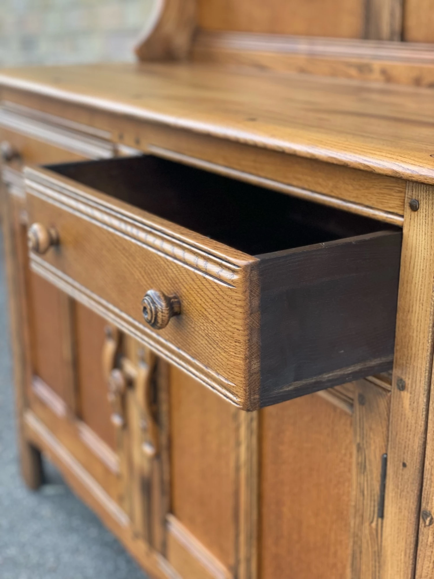 This piece has been stripped, lightly sanded and spray finished in a satin clear lacquer. This restoration process has enhanced the sideboard’s natural golden tones. The shelving has grooves along the middle, originally designed for plate display.