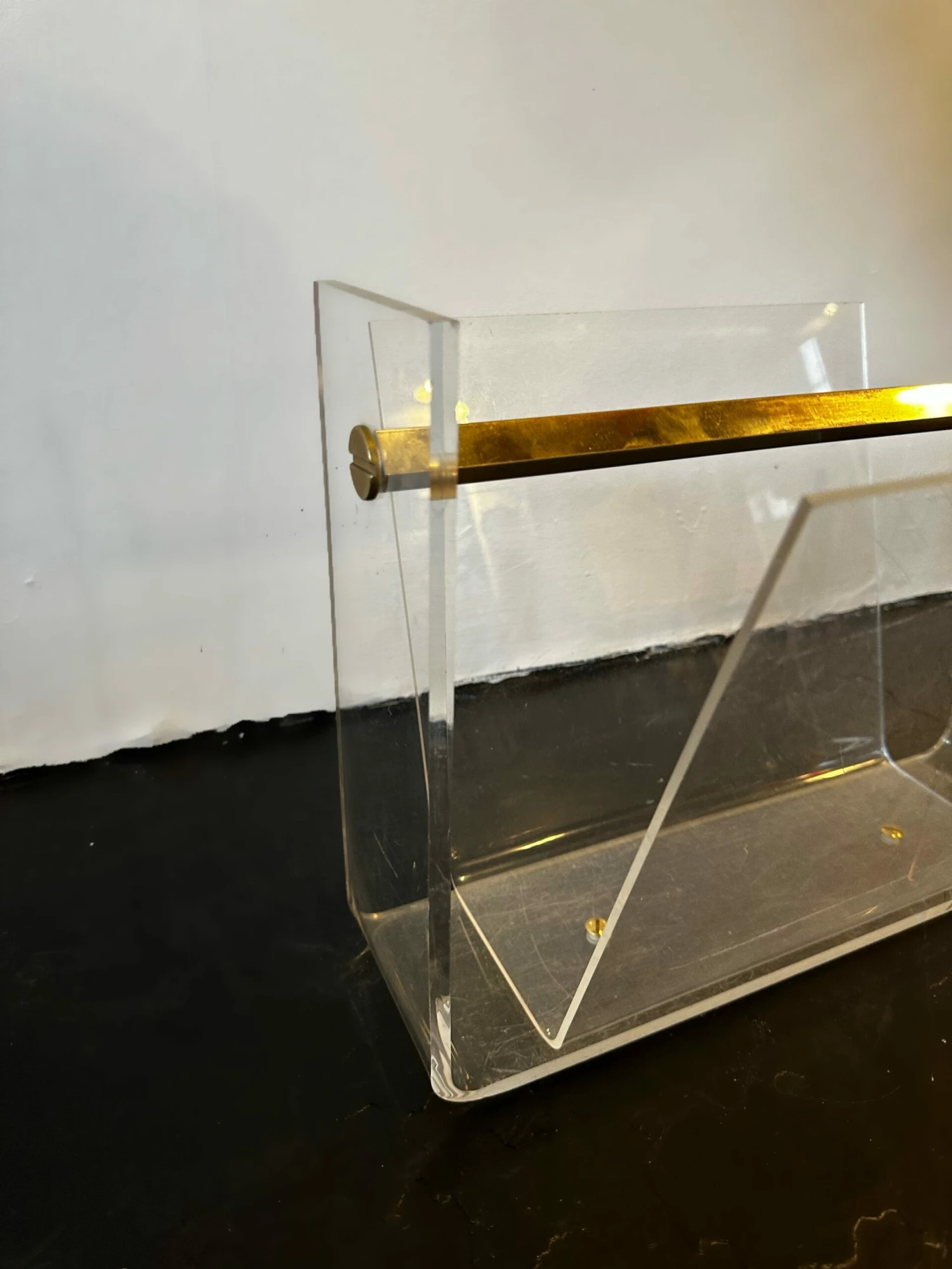 Good condition, some minor scuffing to the lucite on the base as would be expected with age, brass in mint condition.