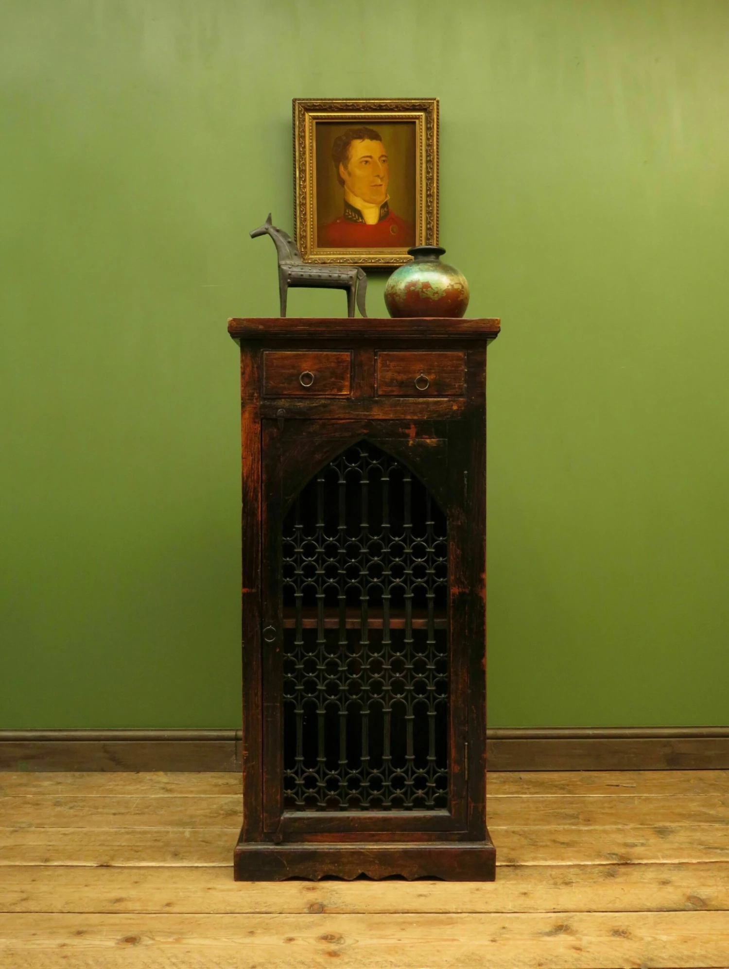 A useful narrow vintage Indian cabinet dating to the late 20th century.