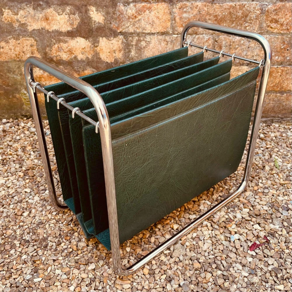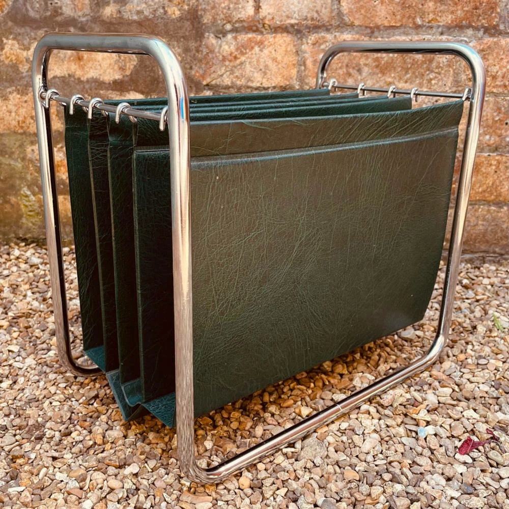 Vintage chrome and green vinyl magazine rack from the 1970s. French and possibly by Max Sauze.