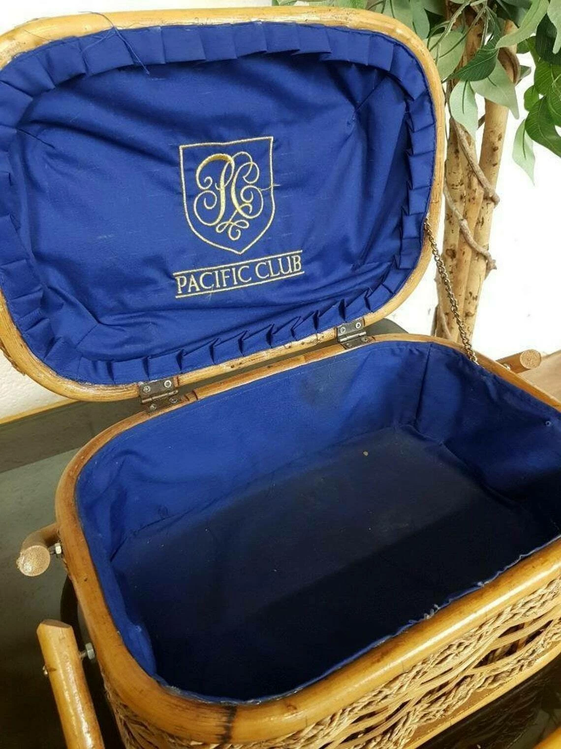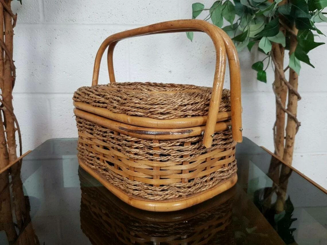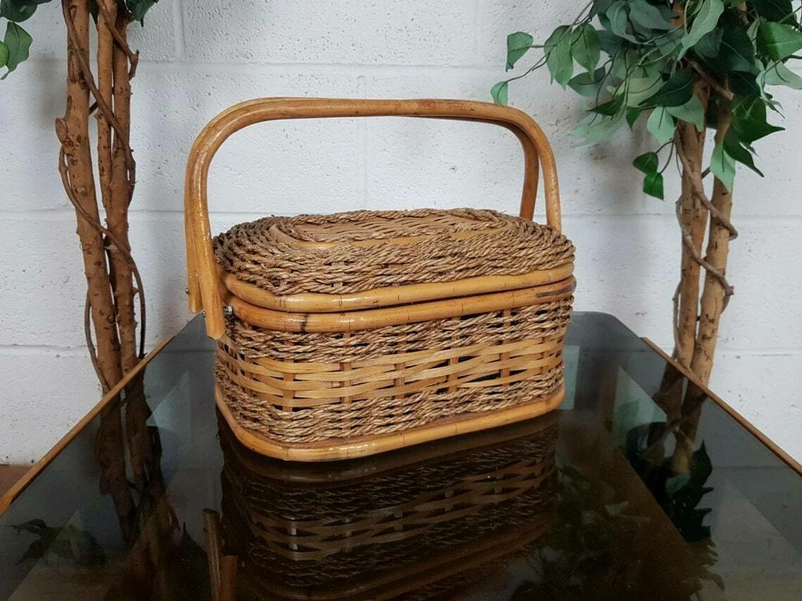 An original vintage wicker sewing basket. Lined interior with carry handle.