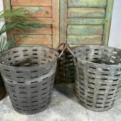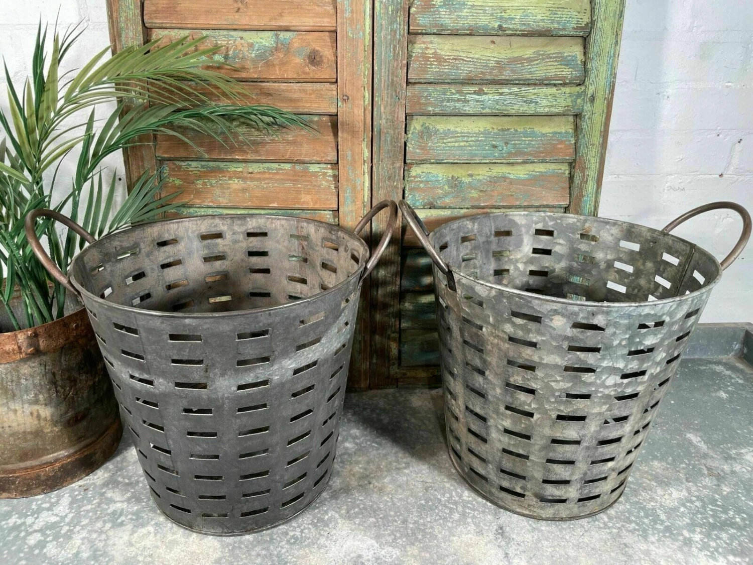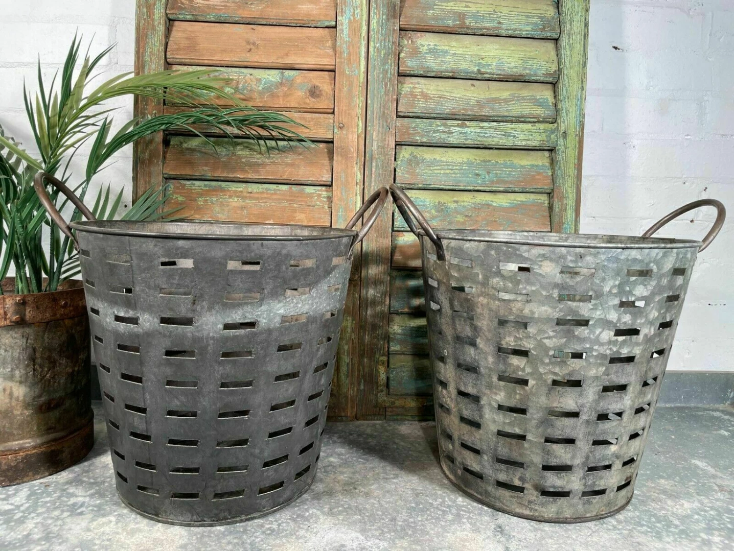 Vintage reclaimed galvanised olive picking baskets. They have a wonderful shape and design and make a great addition to the home or garden. They look wonderful displaying flowers they can easily be lined or you can place a plant pot directly into them.