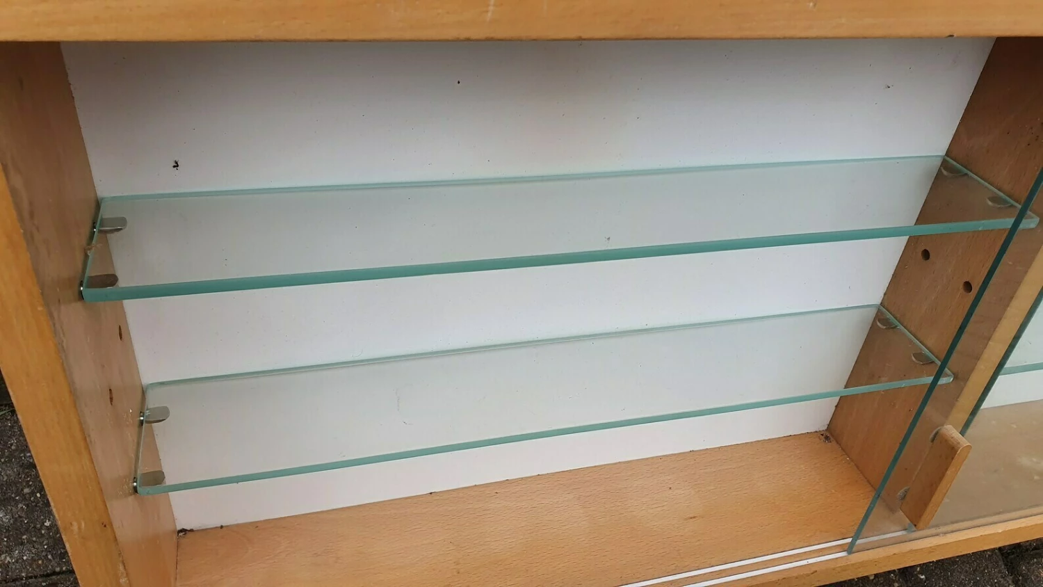 Each side has two adjustable shelves. One side has newer silver metal supports, the other side has the original plastic ones, two have little chips to the ends but are perfectly fit for purpose.