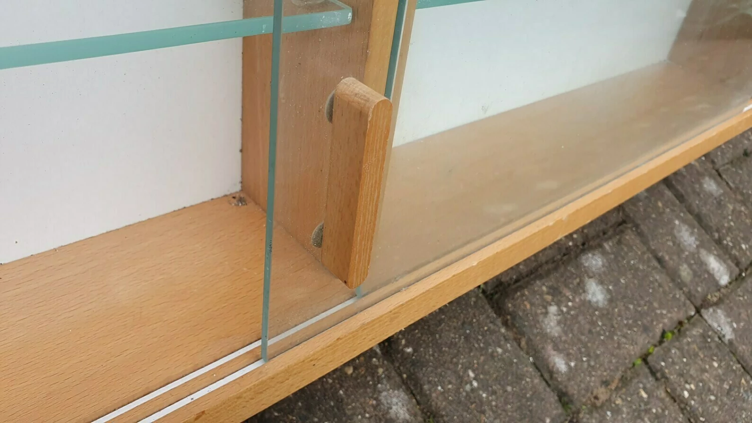 Glazed sliding doors with oak handles that are secured by screws that go through holes in the glass.