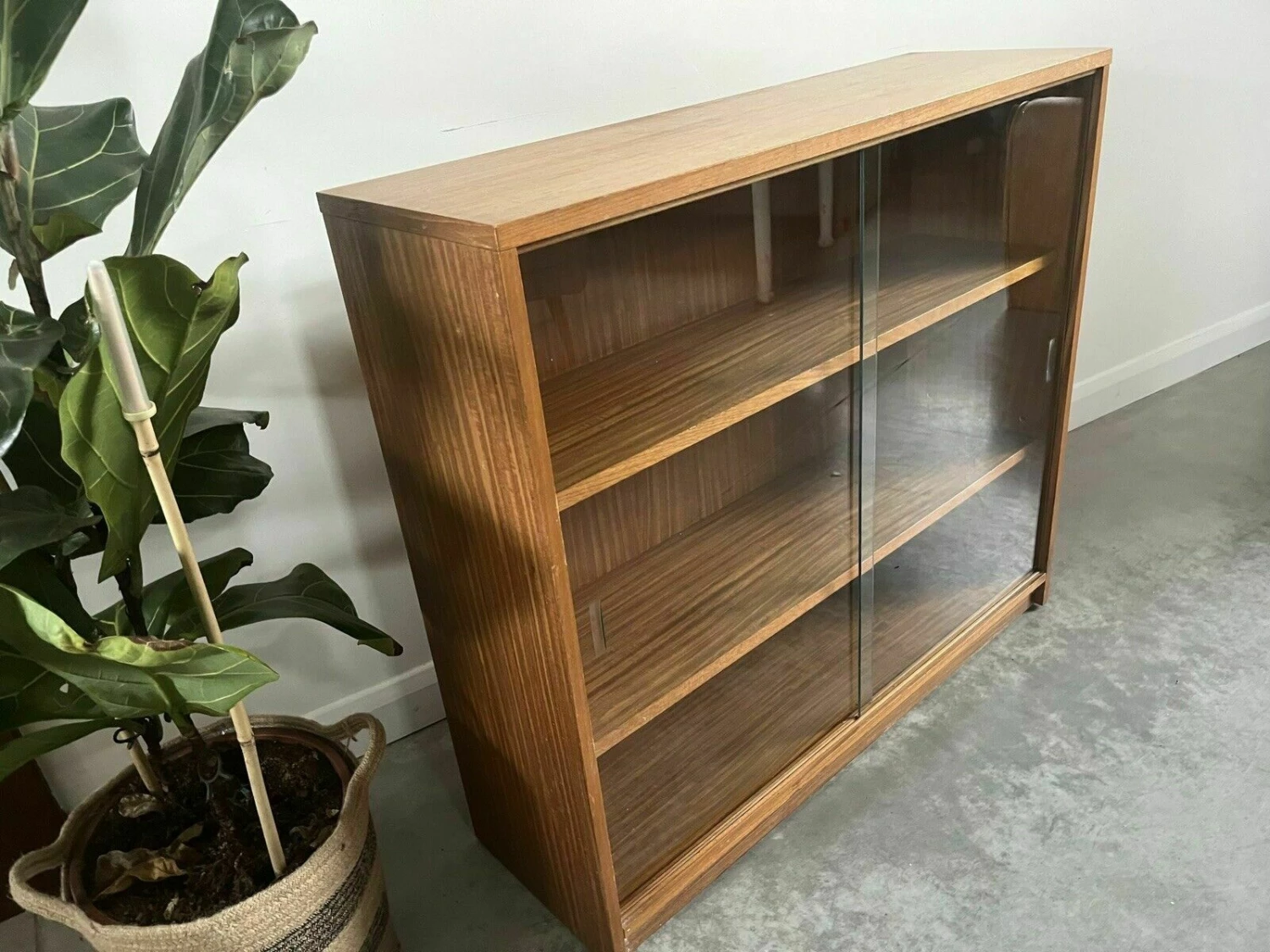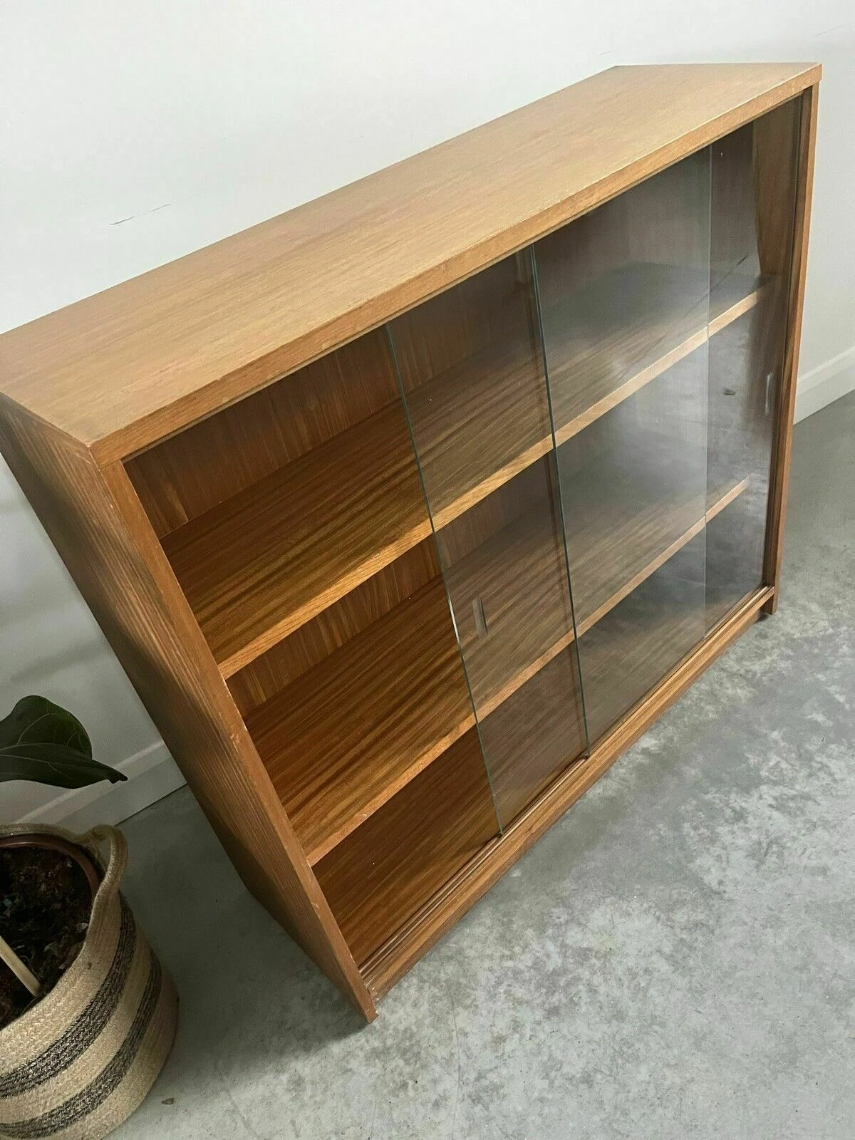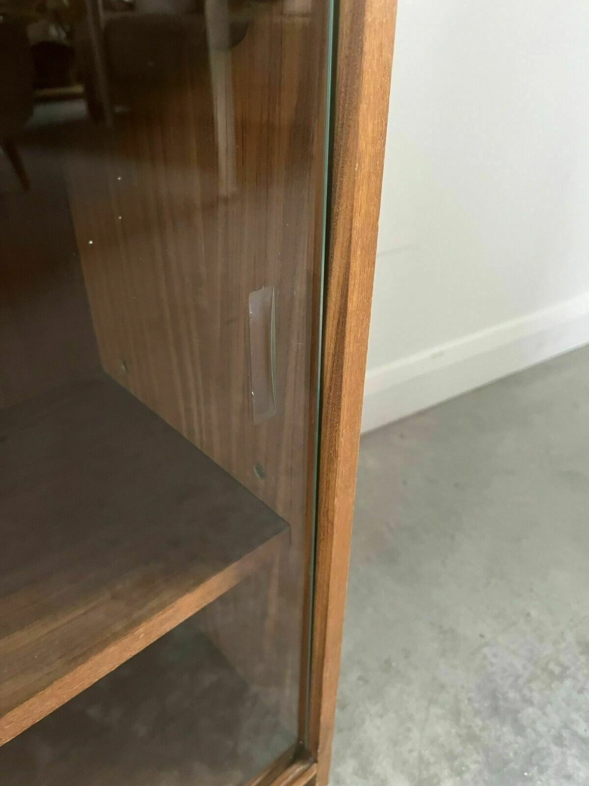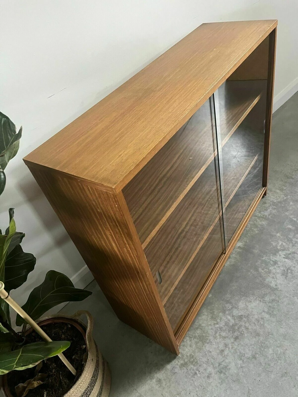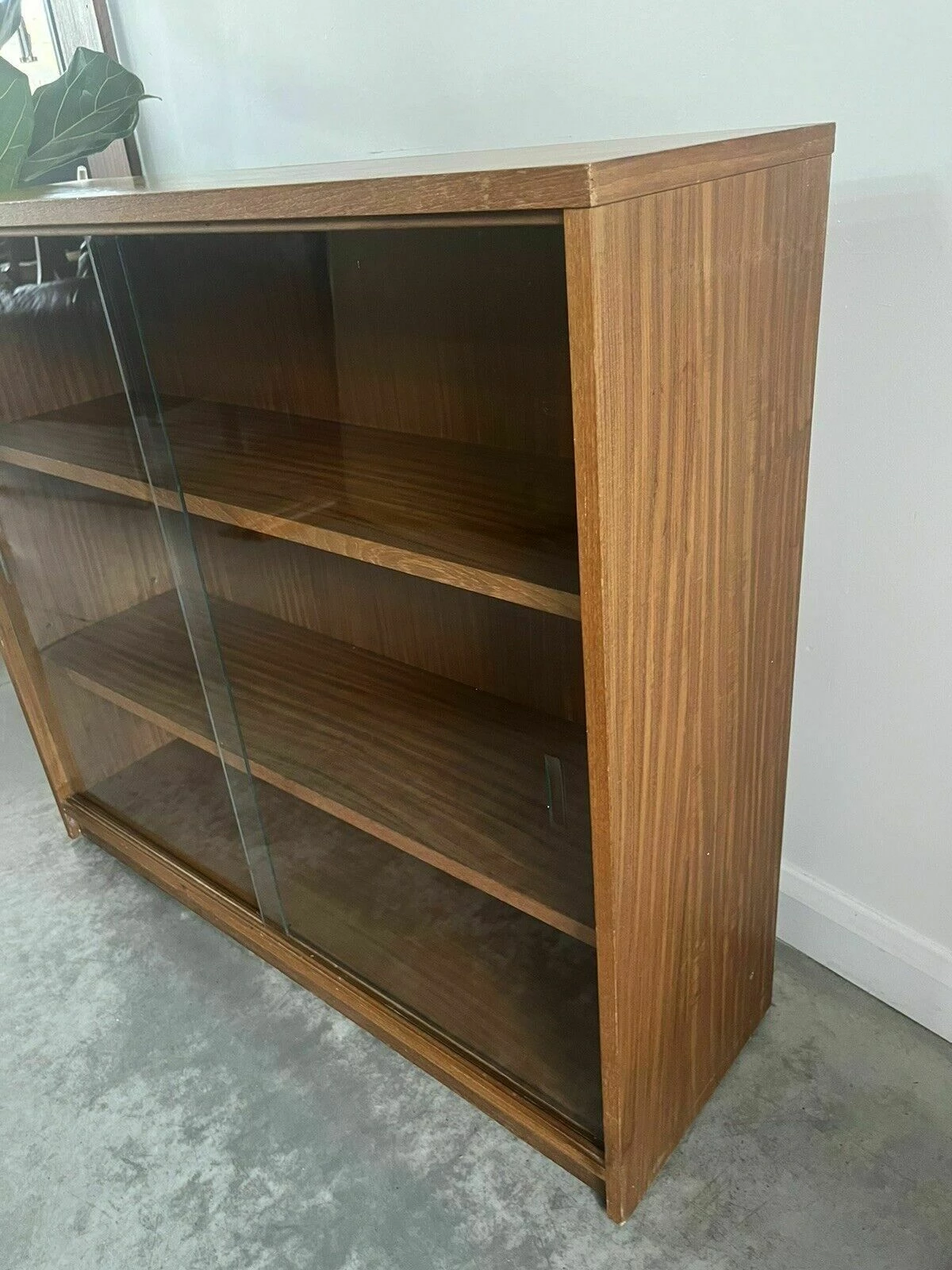 Vintage Teak MCM Bookcase With Original Sliding Glass Doors 1970s.