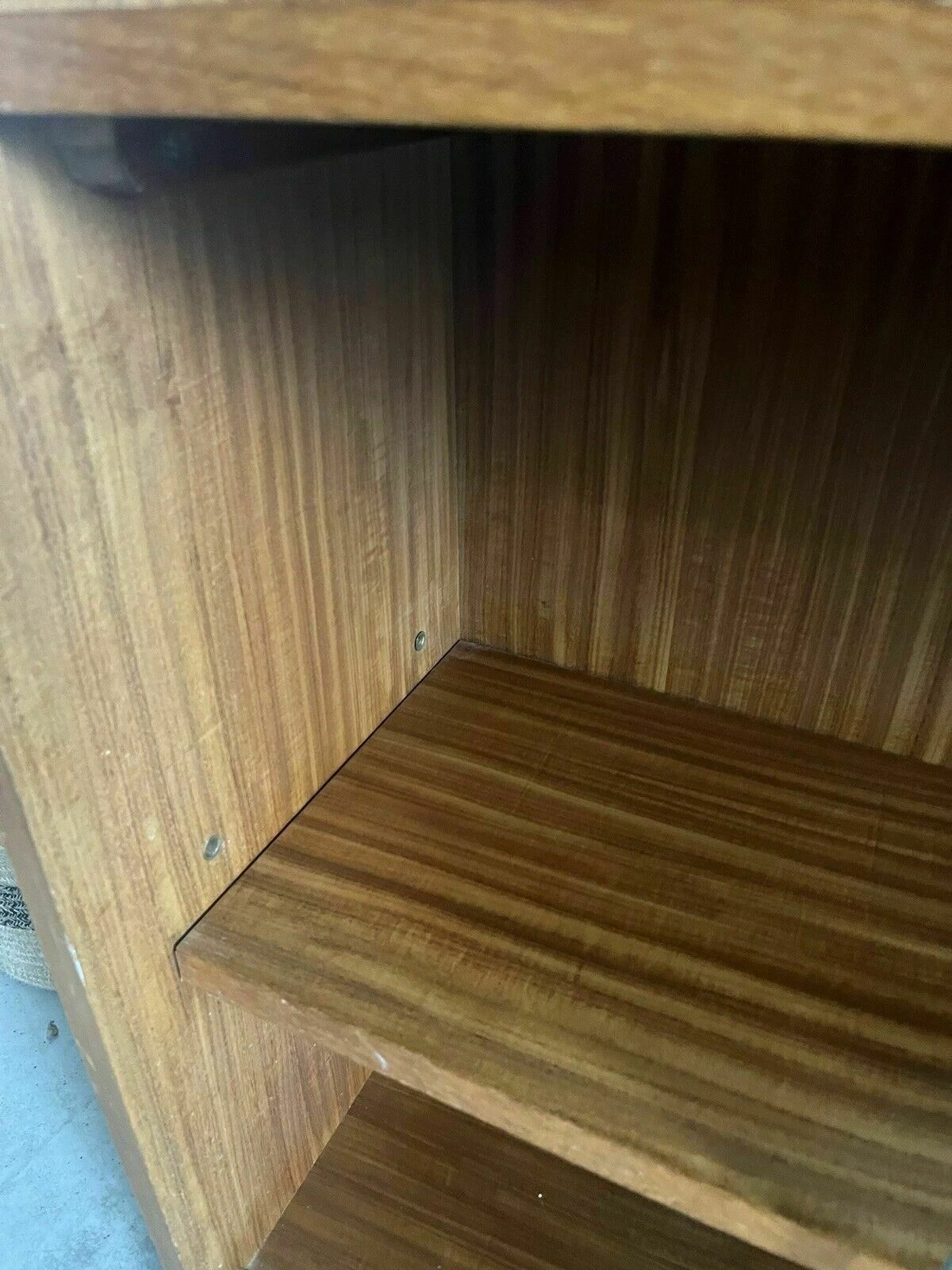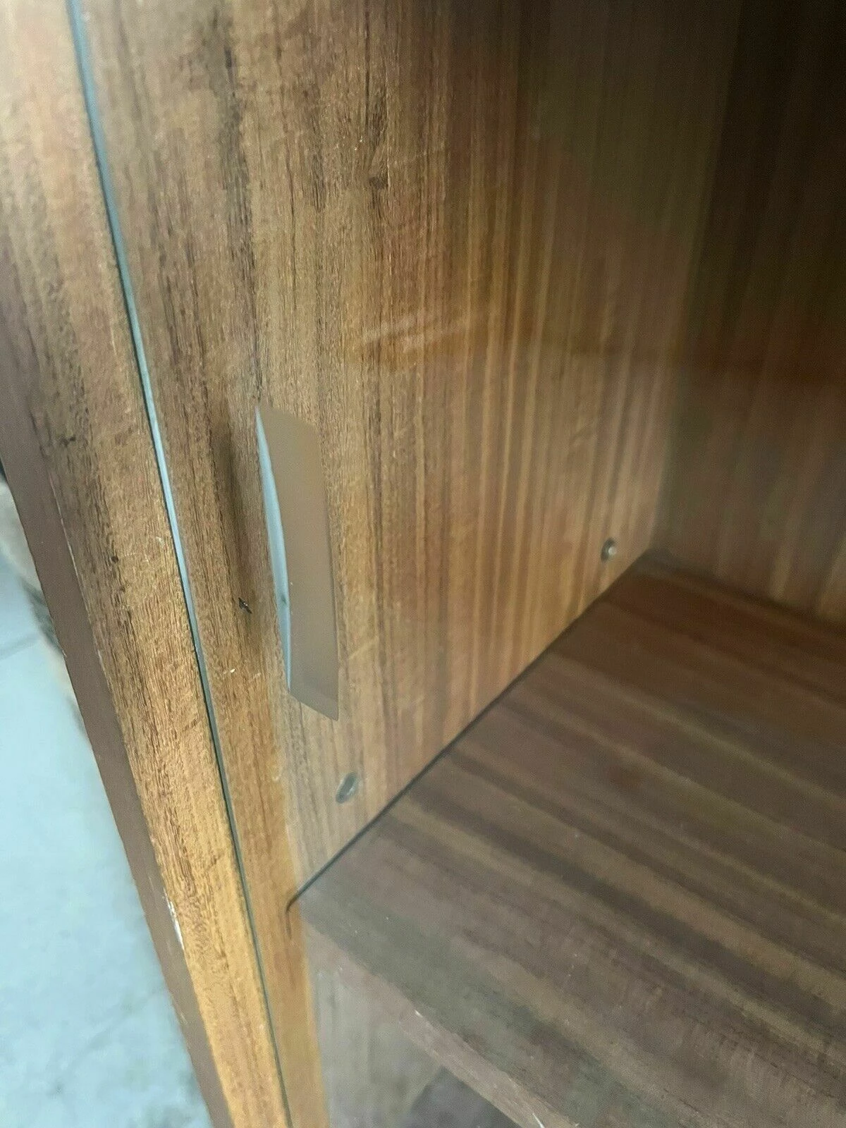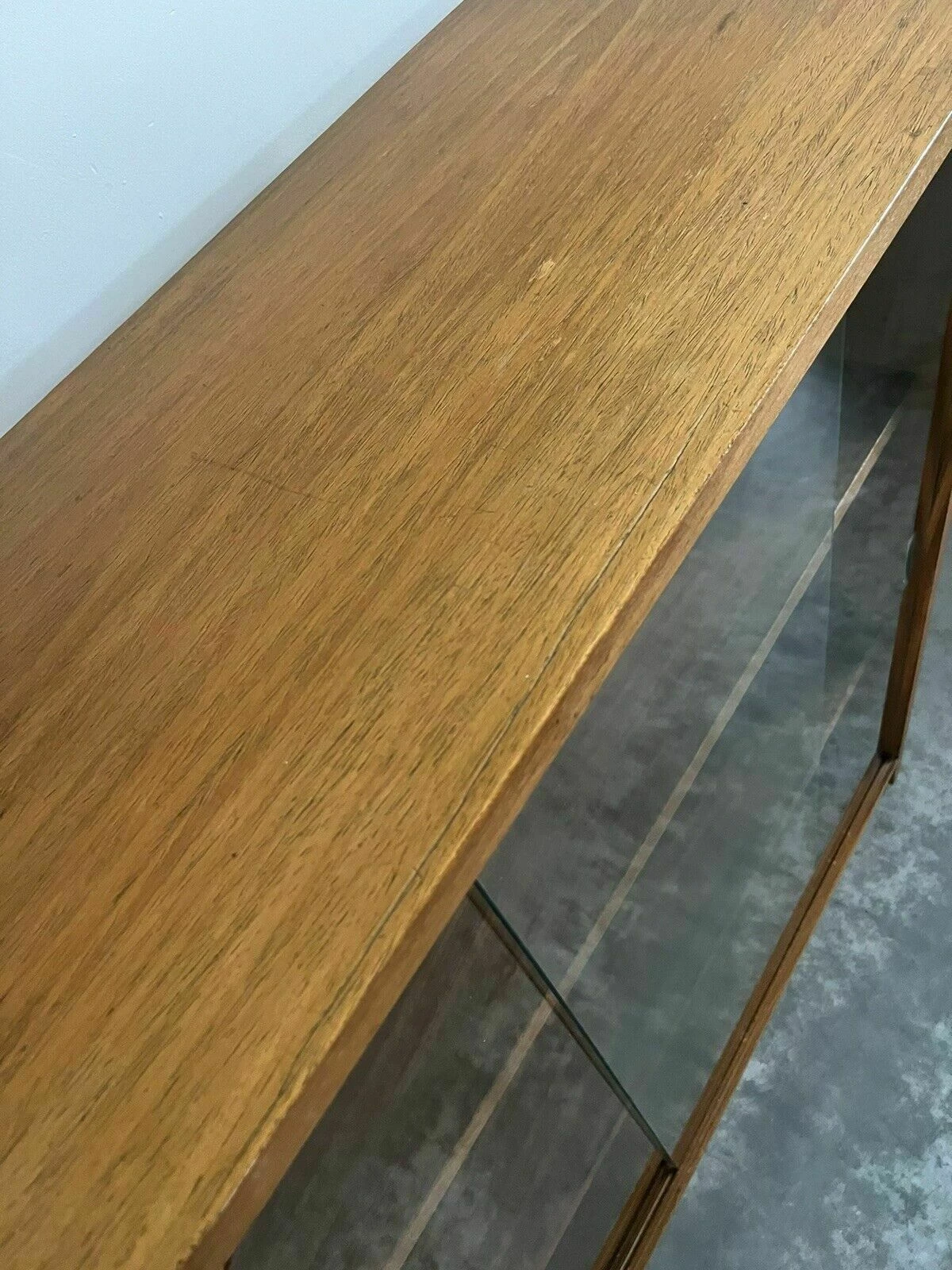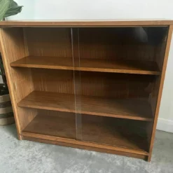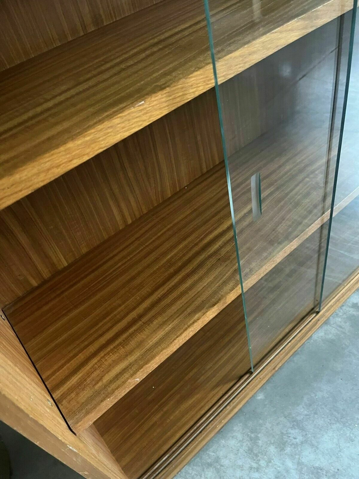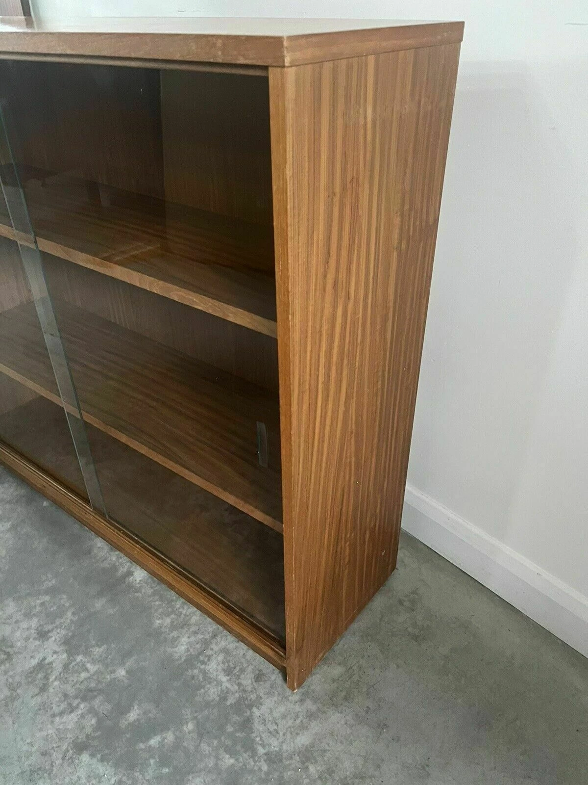 Vintage Teak MCM Bookcase With Original Sliding Glass Doors 1970s.