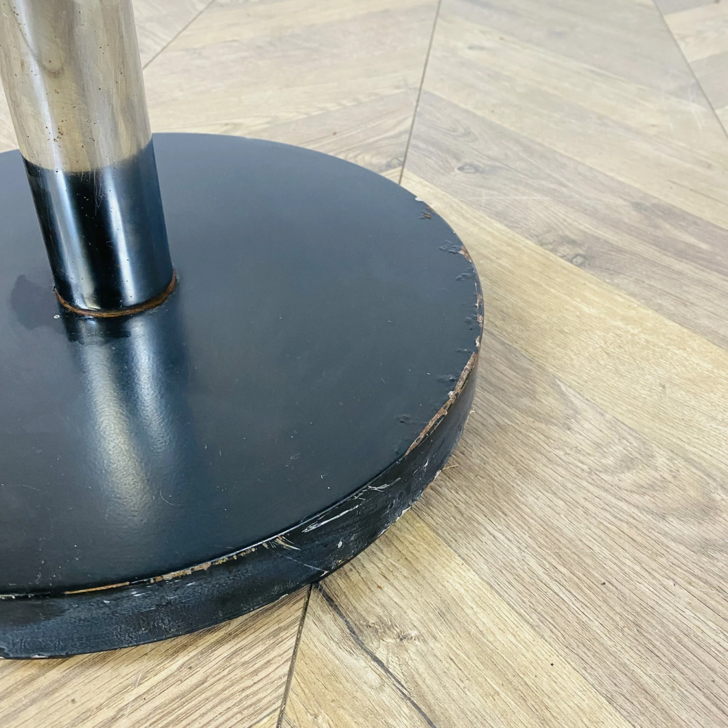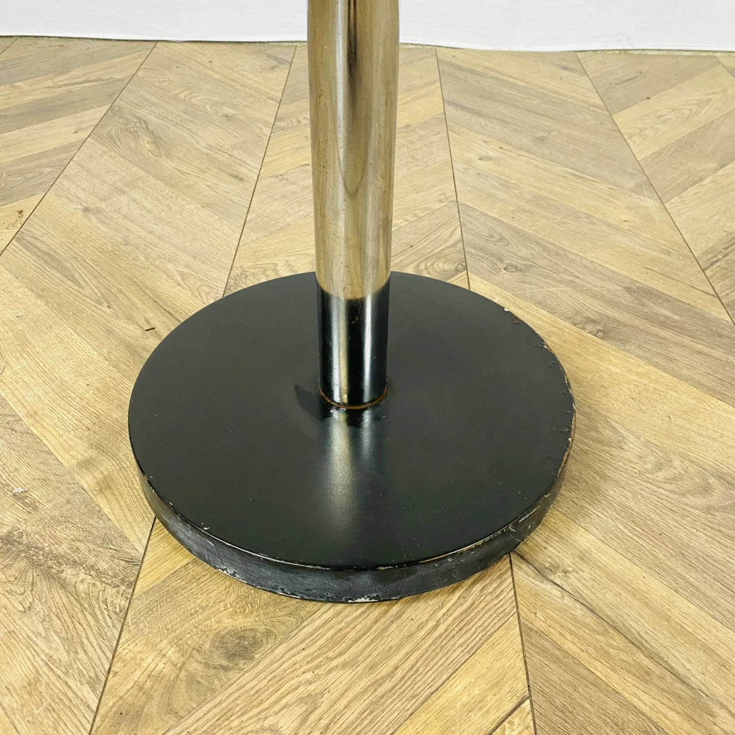 The stand is made from a tubular chrome tube that carries chrome rods with coat hanger balls on each end. The rods can be positioned at any desired depth position.