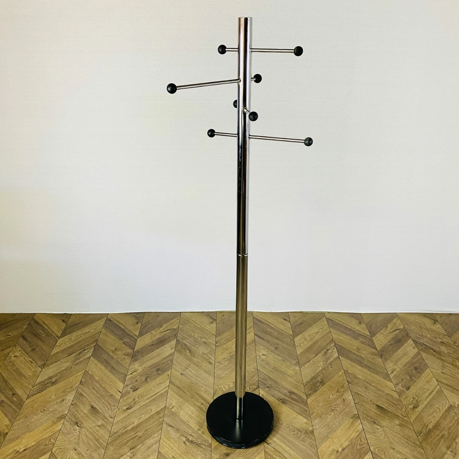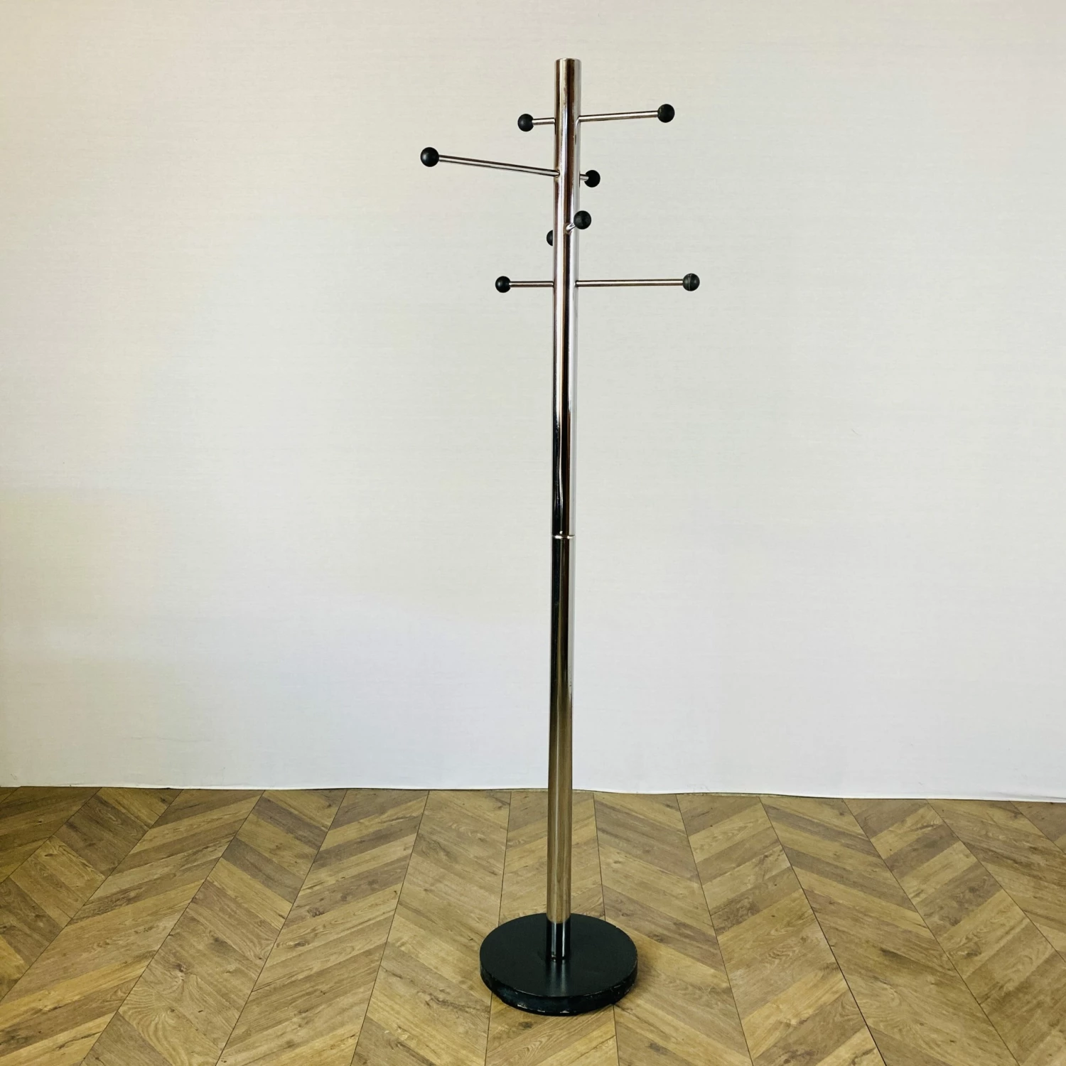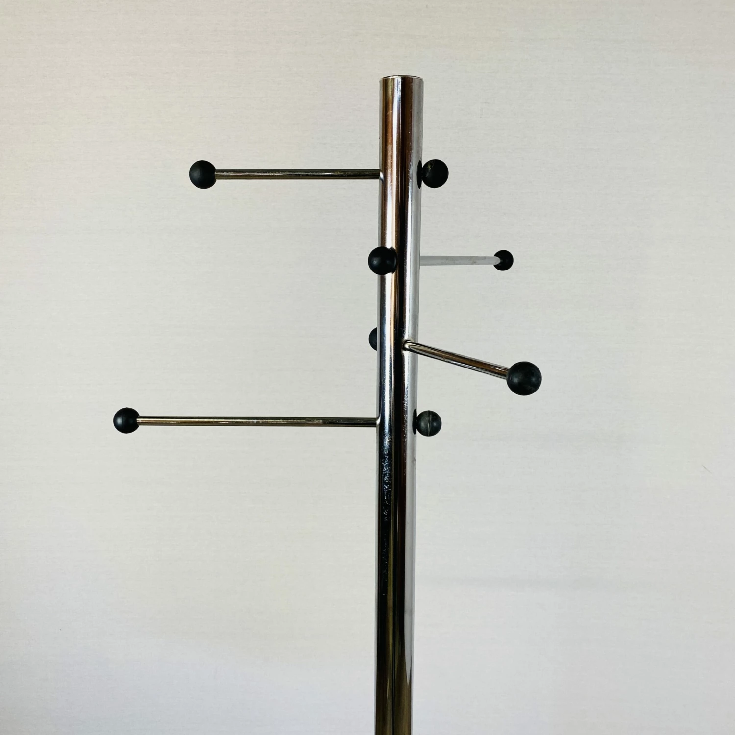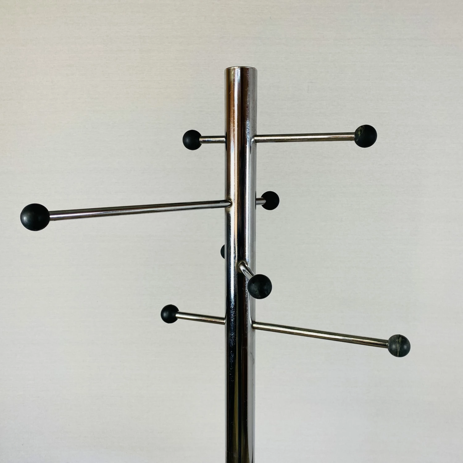 The balls are made from solid plastic finished in black. This coatrack stands in a good vintage condition with minor wear and tarnishing to the stand and base.