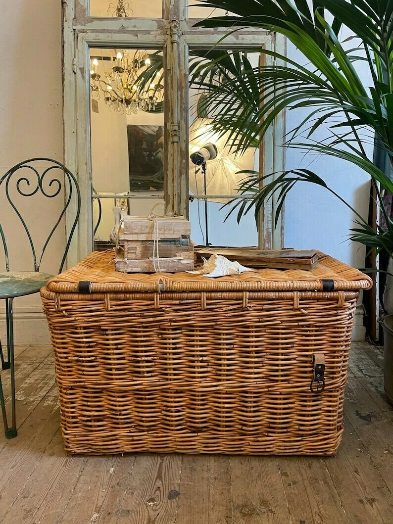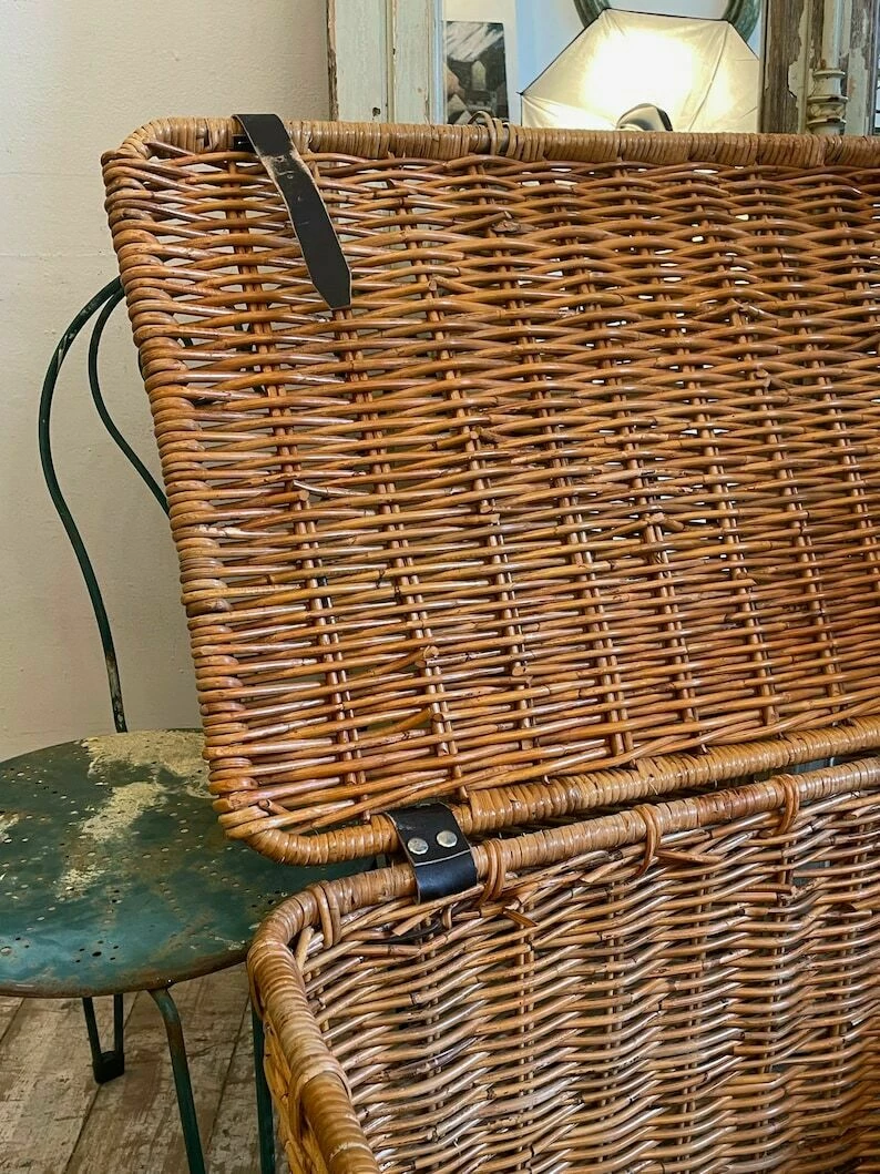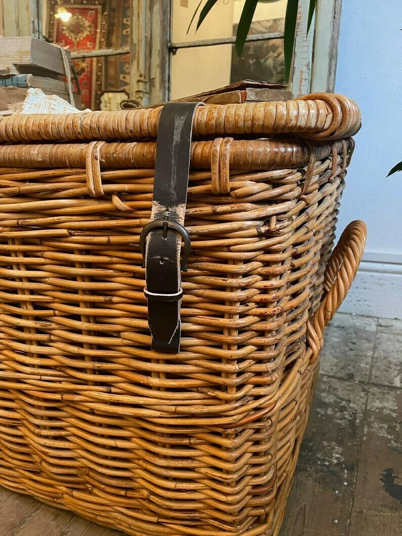 Large wicker basket with leather straps c.1970. This is a versatile piece which could be used for bedroom or bathroom storage. Or for kids toys in a playroom. It is also sturdy enough to house logs for the fireside.