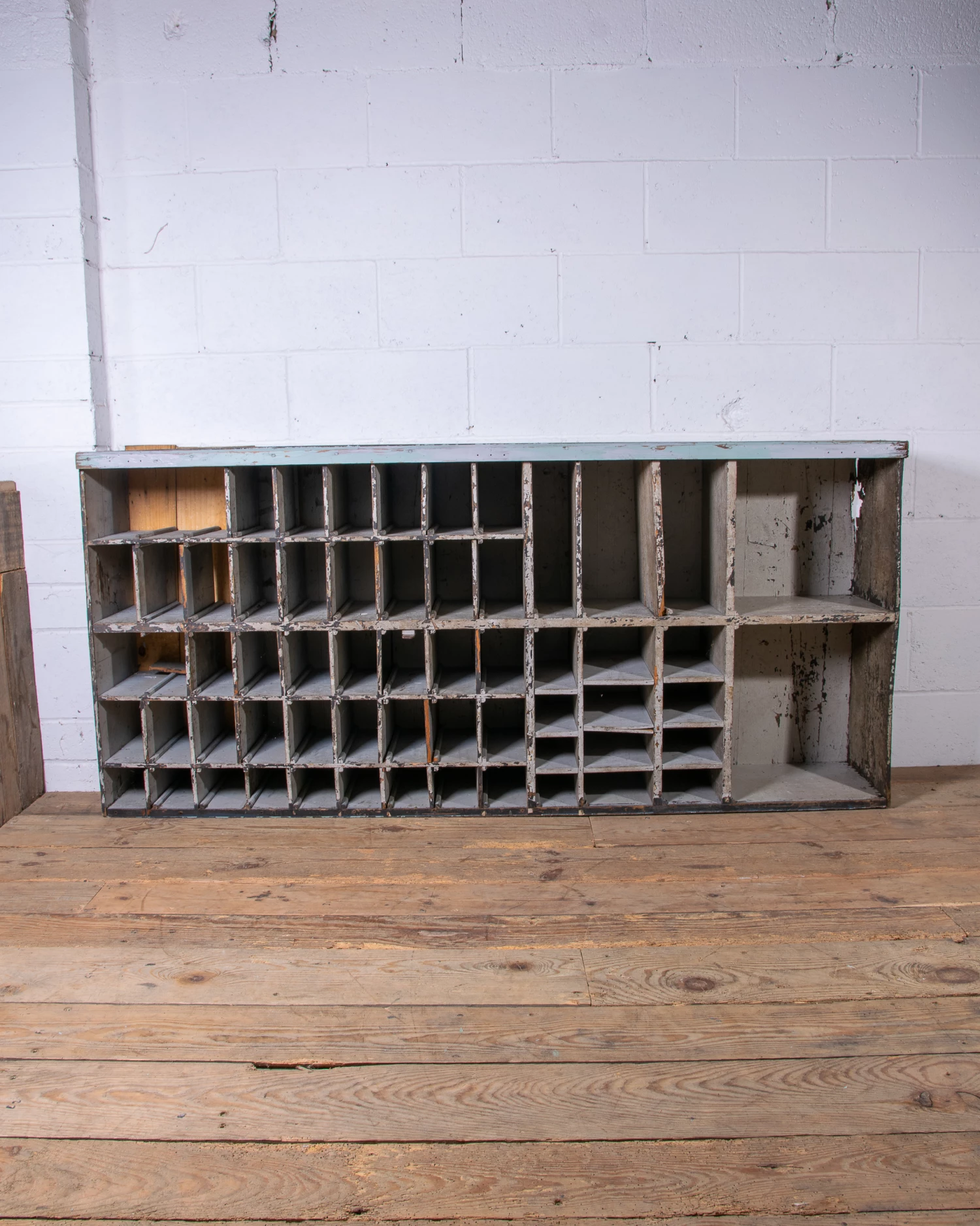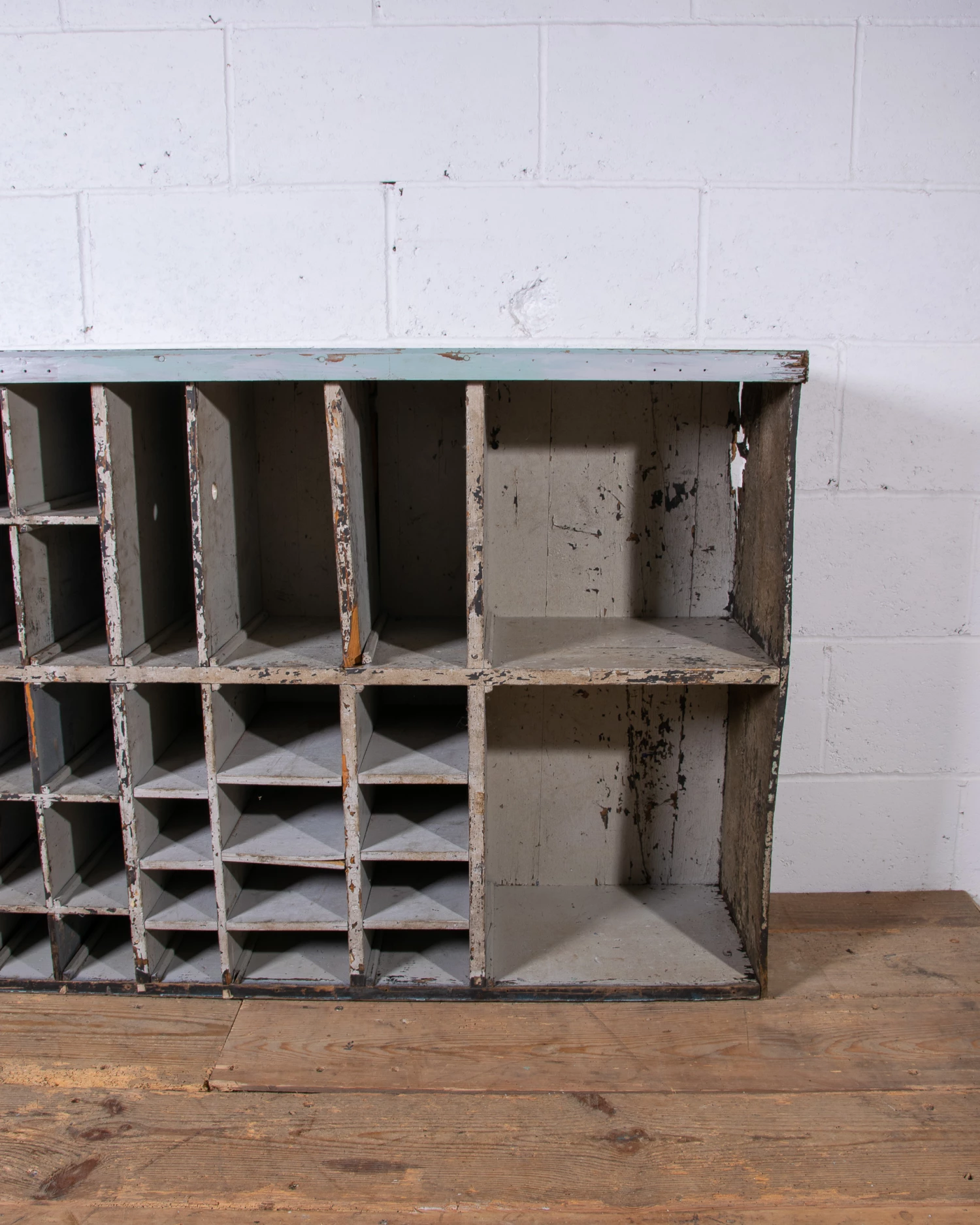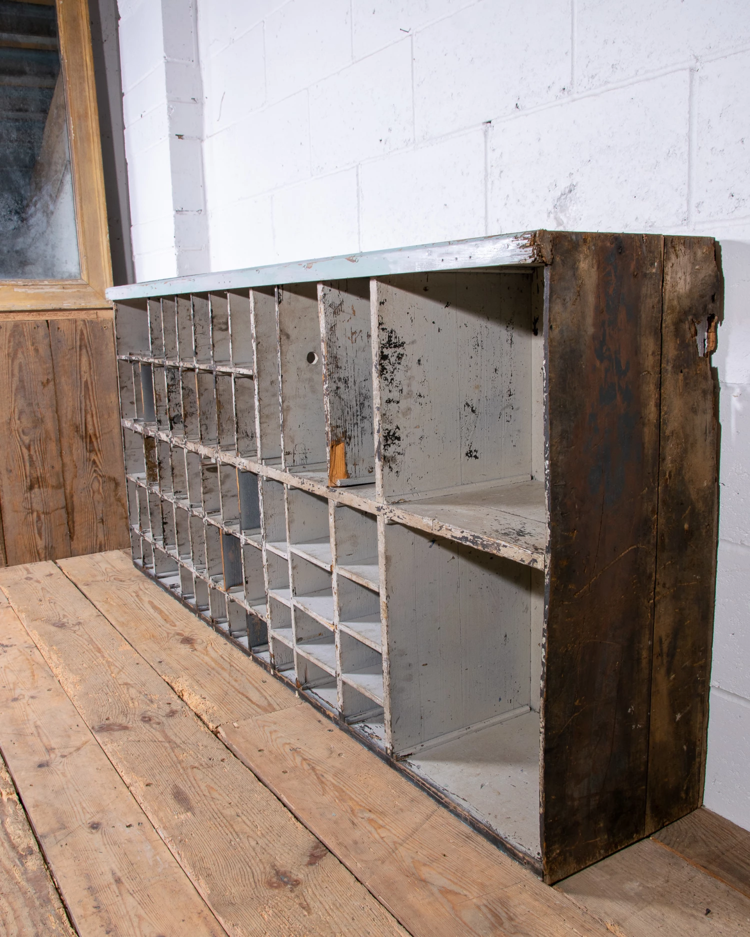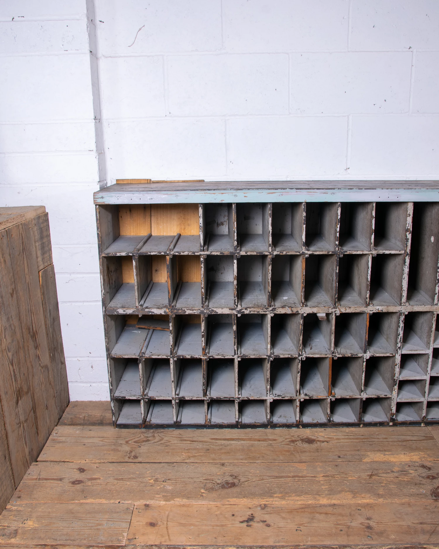 An early 20th century wooden pigeon hole shelving unit reclaimed from a workshop in France.