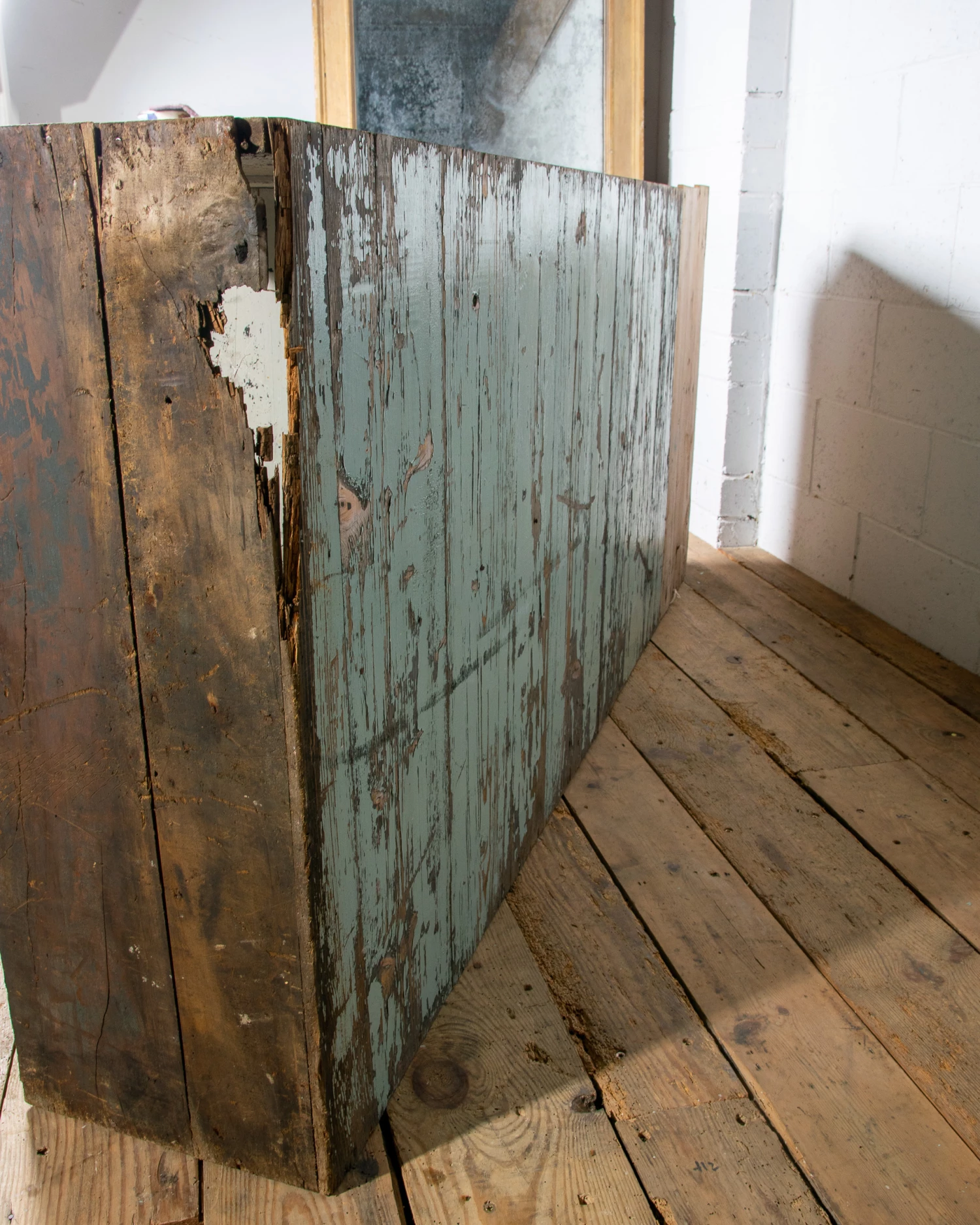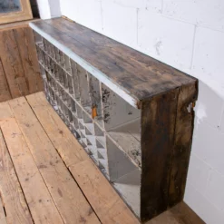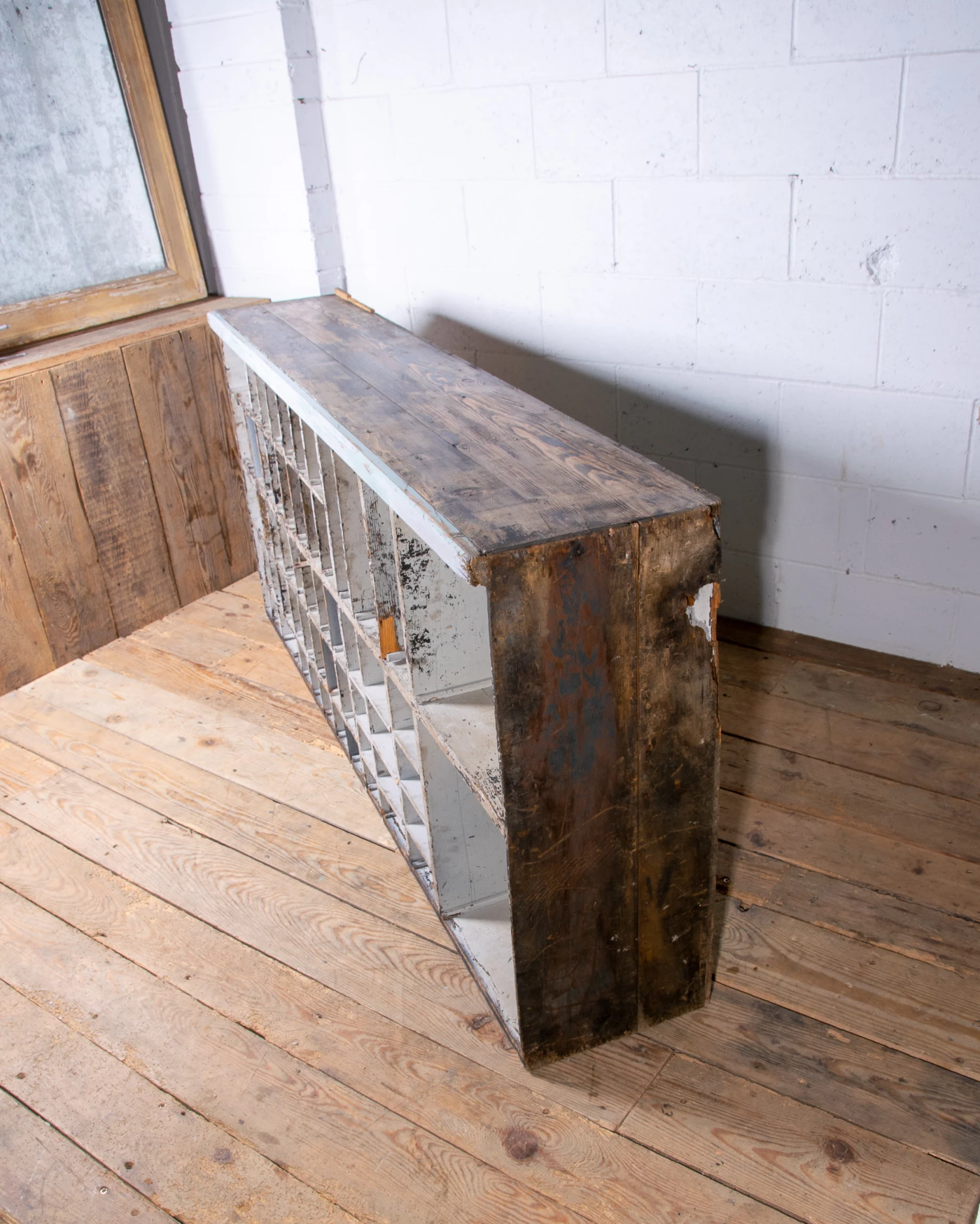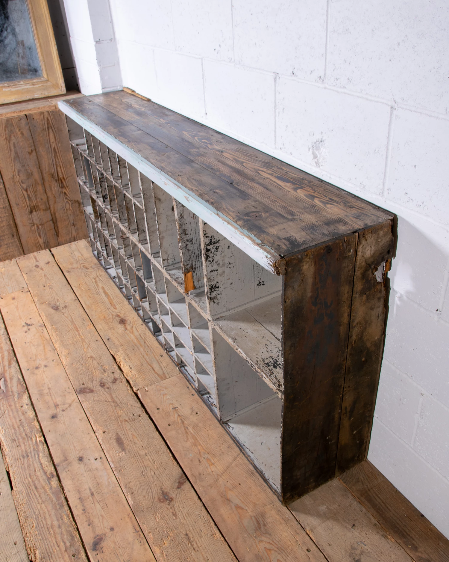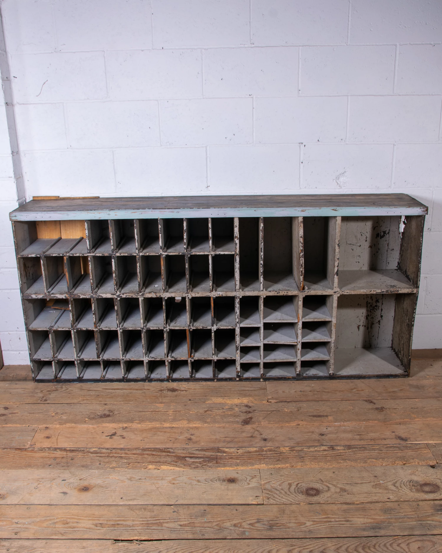 An early 20th century wooden pigeon hole shelving unit reclaimed from a workshop in France.
