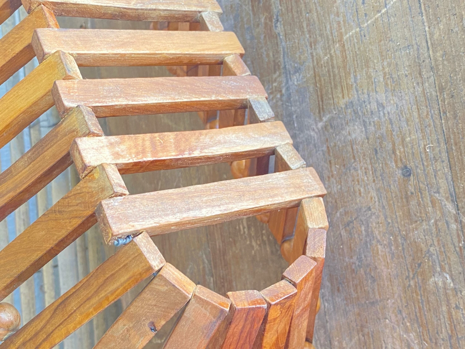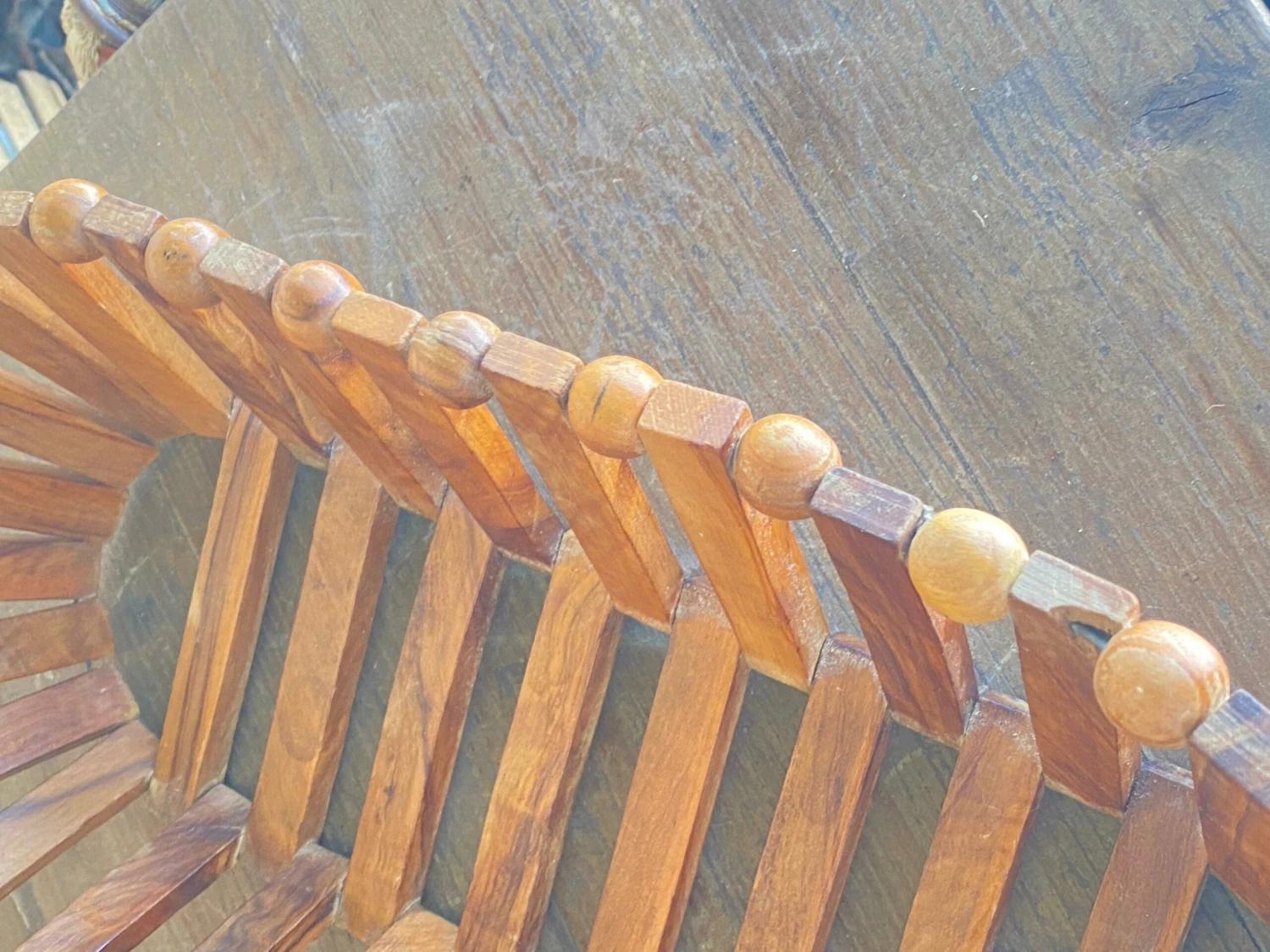 Wooden fruit basket, made of an assembly of balls and wooden bars. Which gives it the very original form of an assemblage sculpture. The wood is brown in color. This object was made in France around the 1960s.